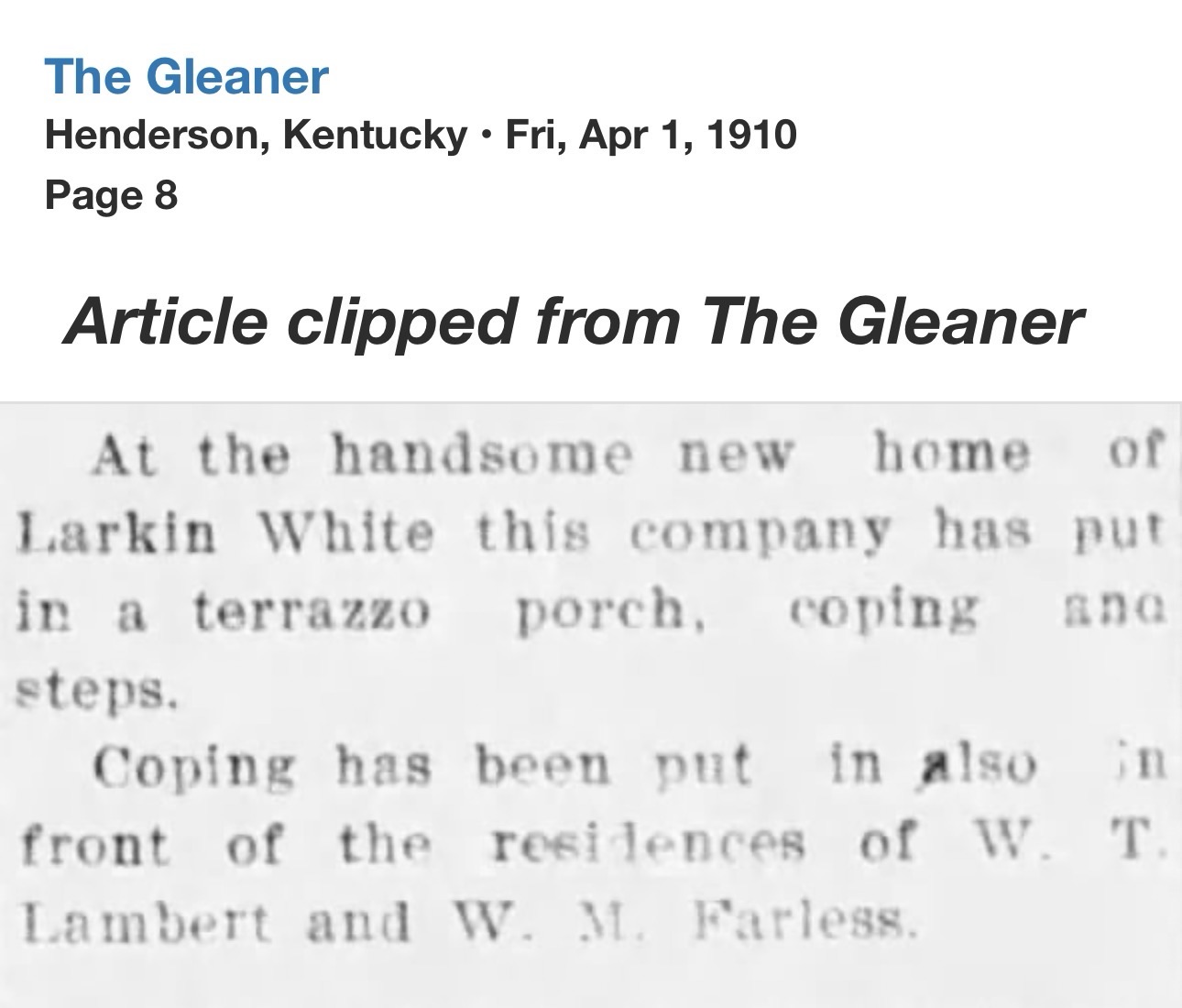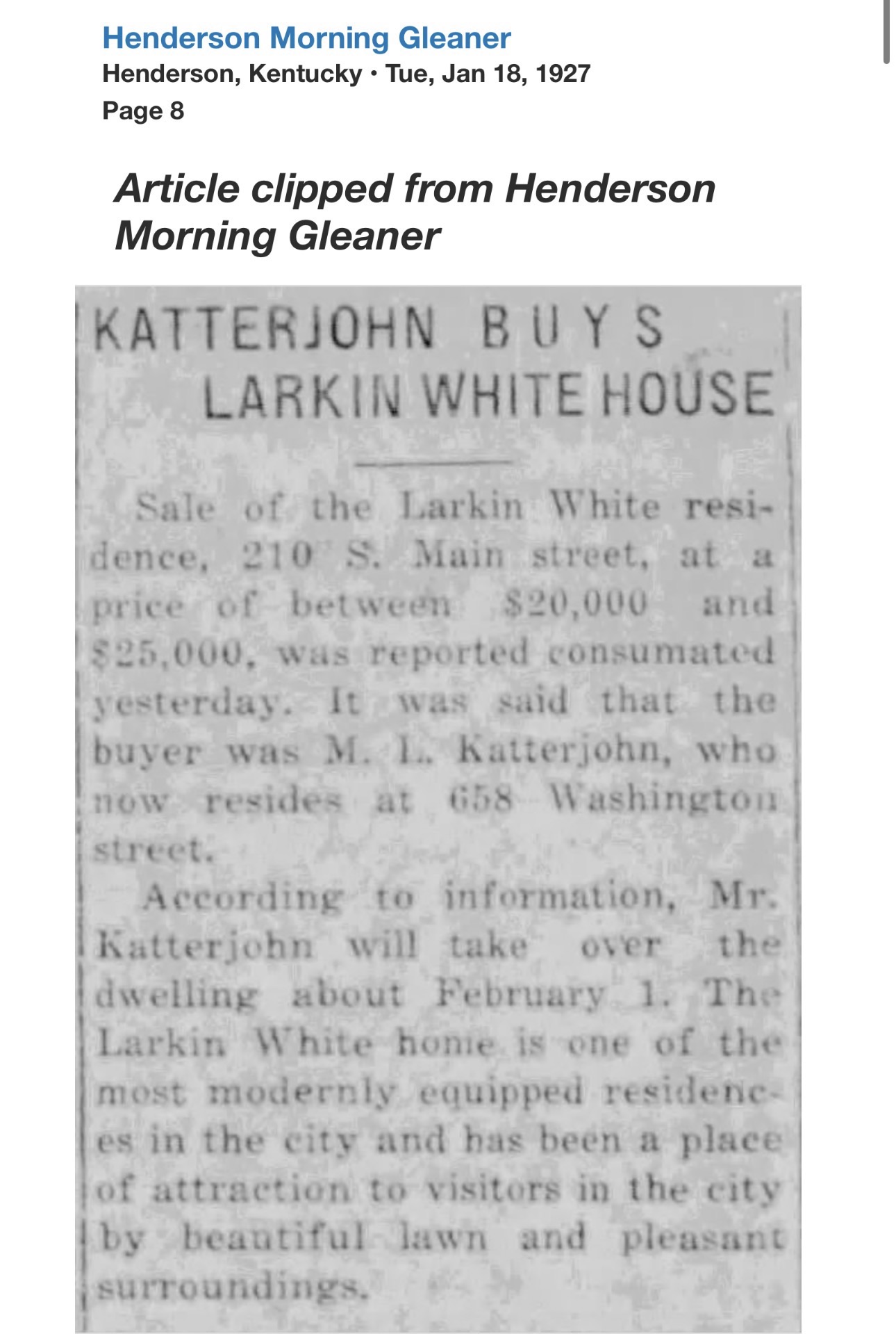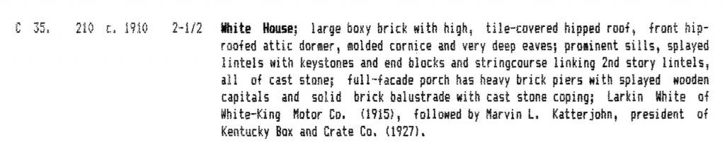 Historic records identify early occupants as Larkin White, associated with the White-King Motor Company by 1915, followed by Marvin L. Katterjohn, president of the Kentucky Box and Crate Company by 1927, both figures reflecting the prominence of the home and its location along South Main Street. Today, the house remains a visually striking landmark, retaining its original brickwork, massing, and decorative stone elements, and stands as a well-preserved reminder of Henderson’s early 20th century residential architecture and industrial-era prosperity.