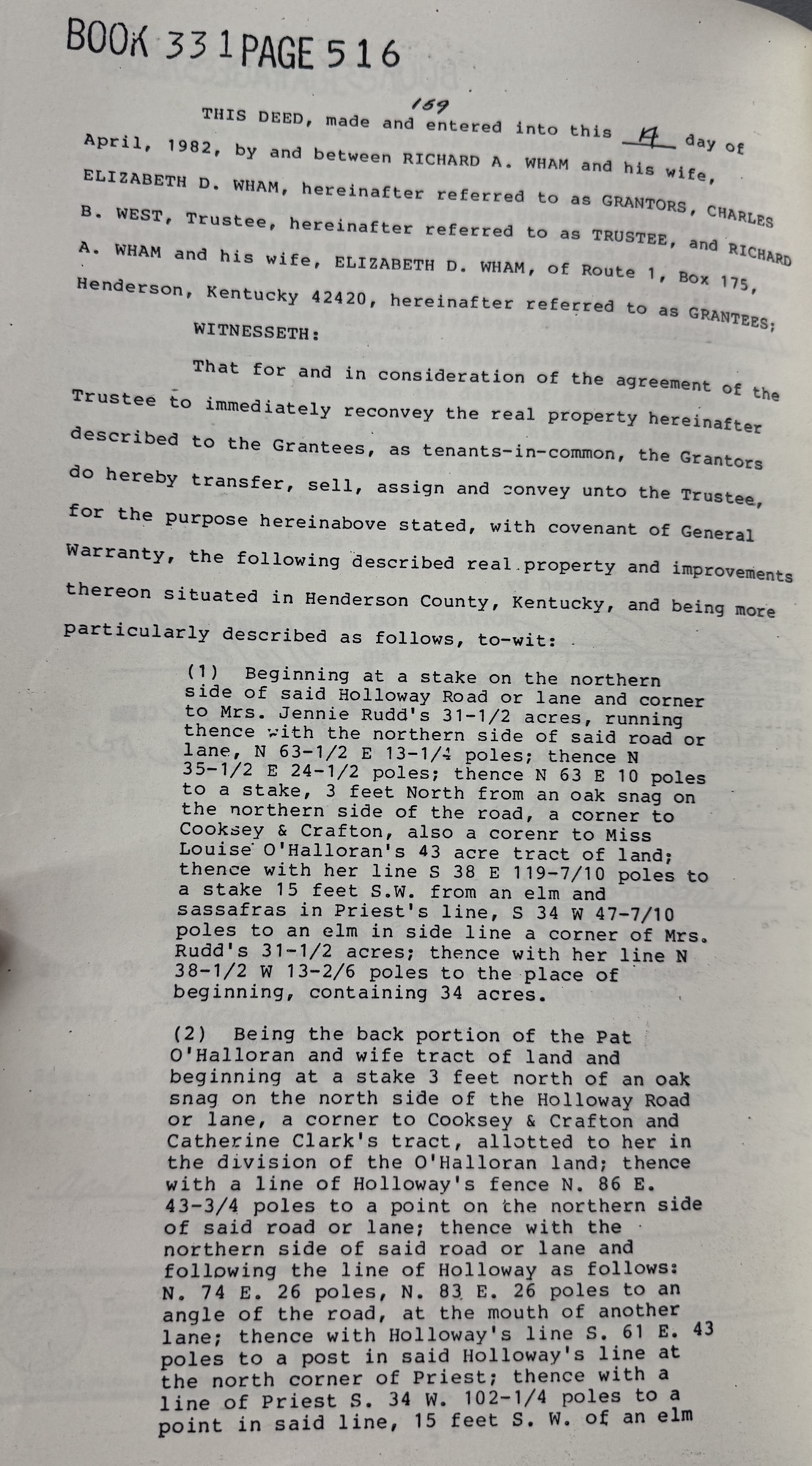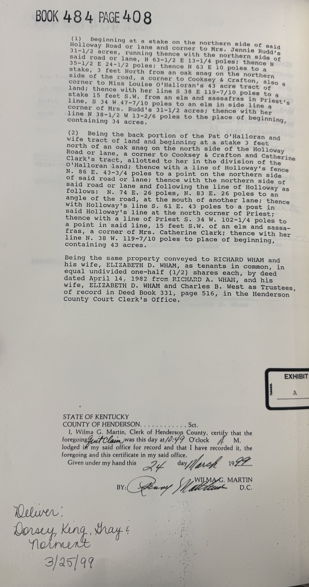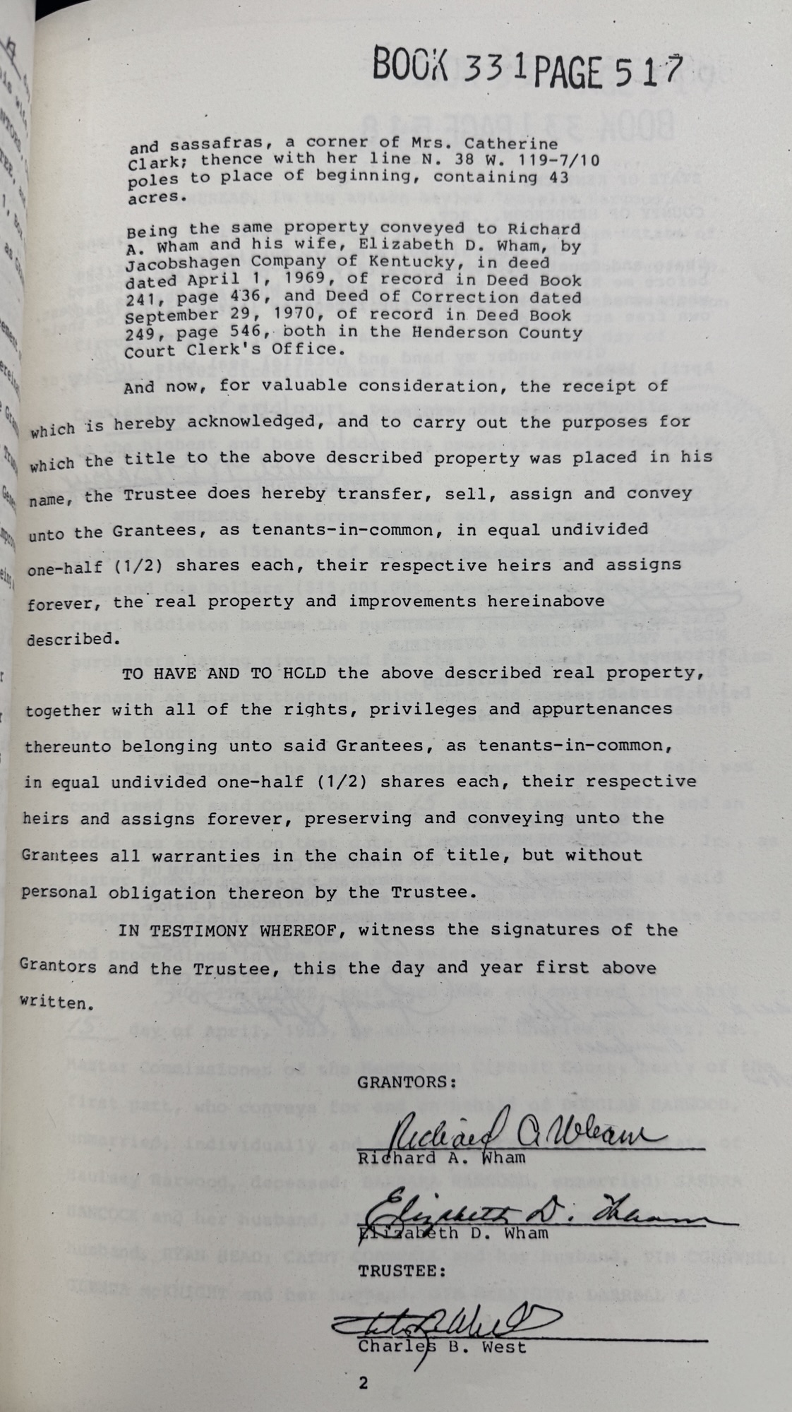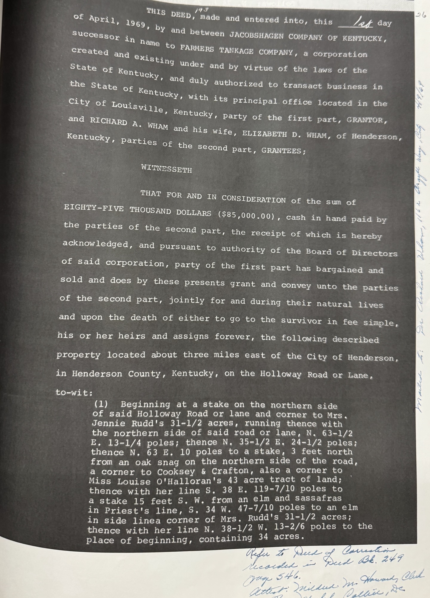 In 1969, a 34-acre portion was conveyed by Jacobshagen Company of Kentucky to Richard A. Wham and wife Elizabeth D. Wham for $85,000 (Deed Book 241, page 436; corrected in Deed Book 249, page 546A). The acreage consolidated into the approximately 75-acre farm shown today in the PVA records.