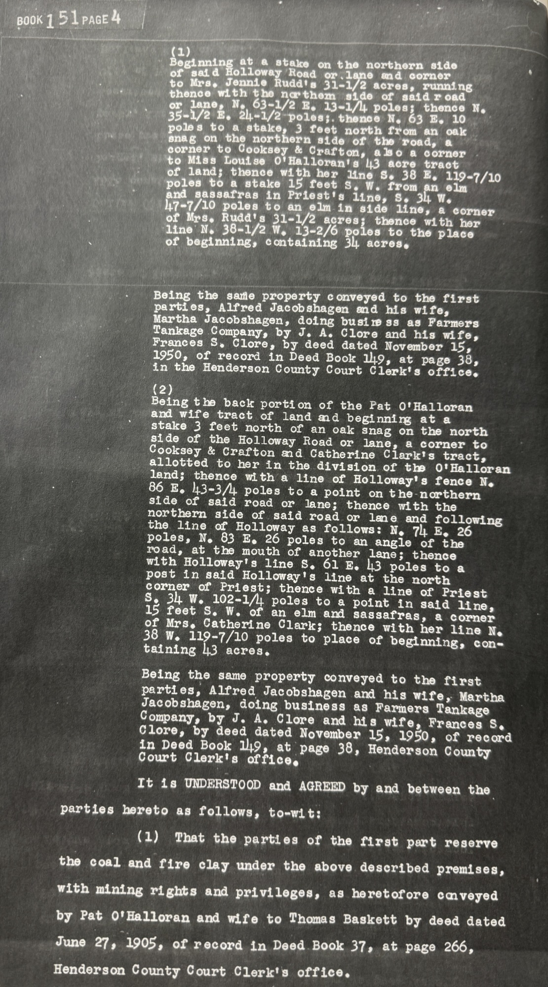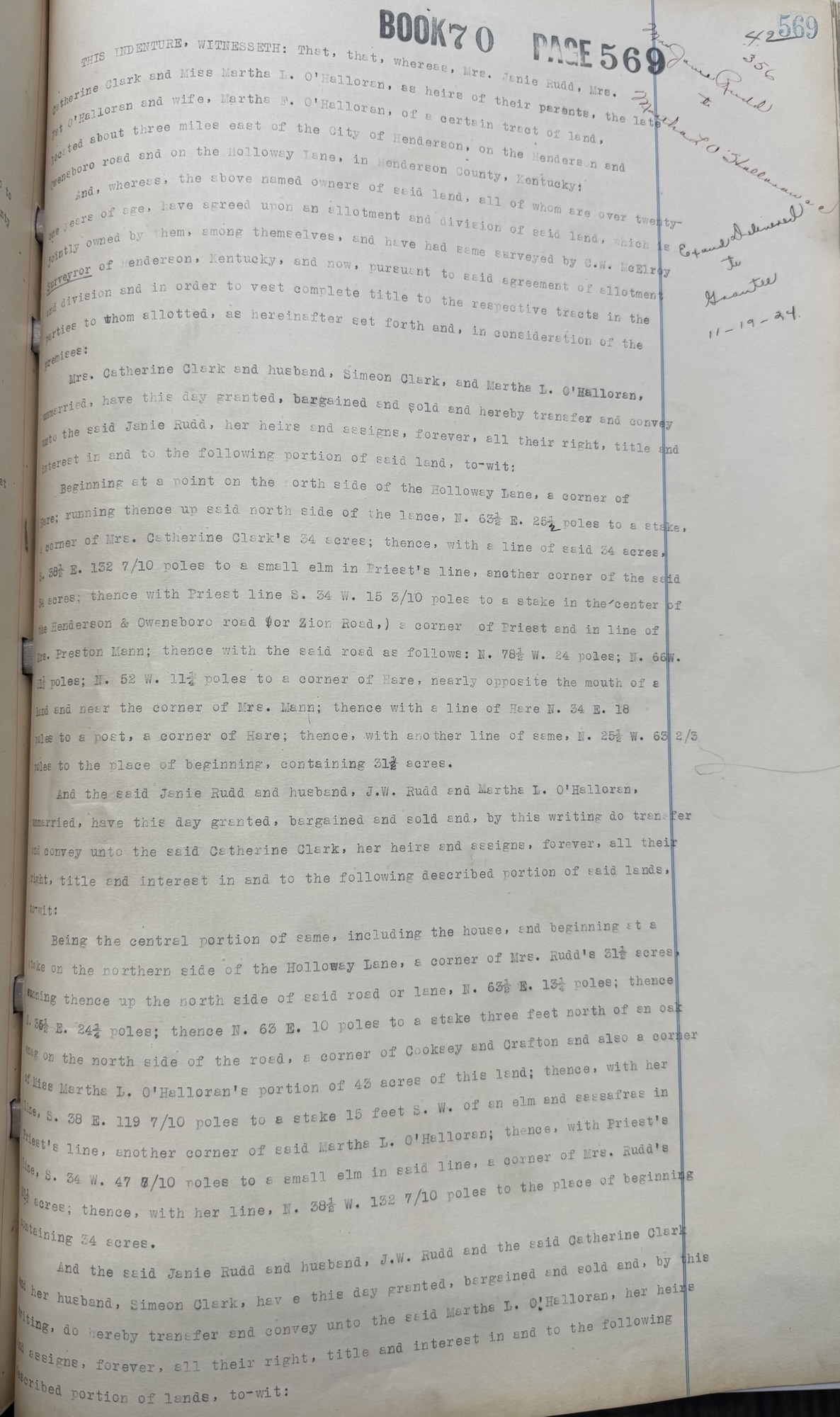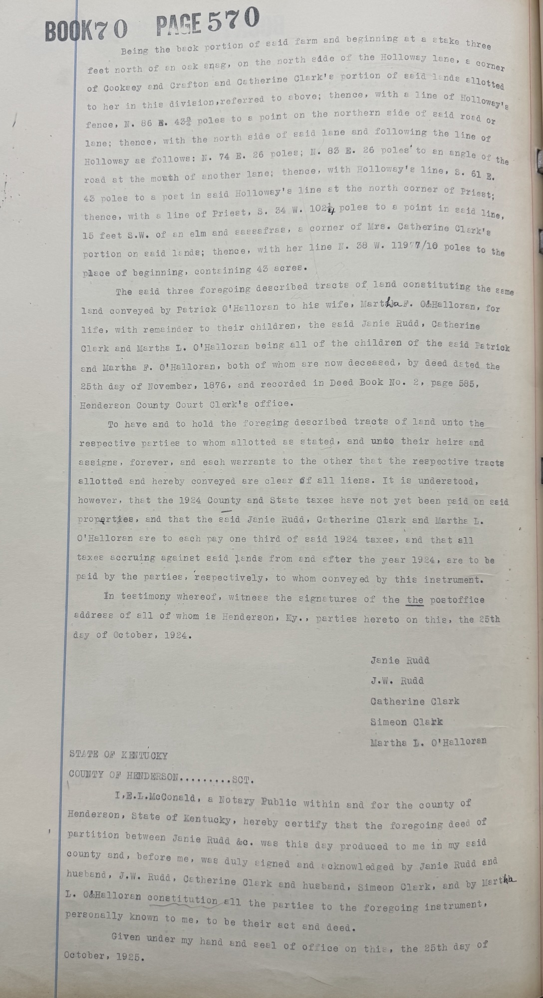 In 1876, Patrick O’Halloran conveyed the property to his wife, Martha F. O’Halloran, for life, with remainder to their children (Deed Book 2, page 585). The heirs partitioned the land in 1924 (Deed Book 70, page 569), dividing the Holloway Road farm into defined tracts marked by stakes, fence lines, oak snags, and adjoining neighbors including Jennie Rudd and the Priest line.