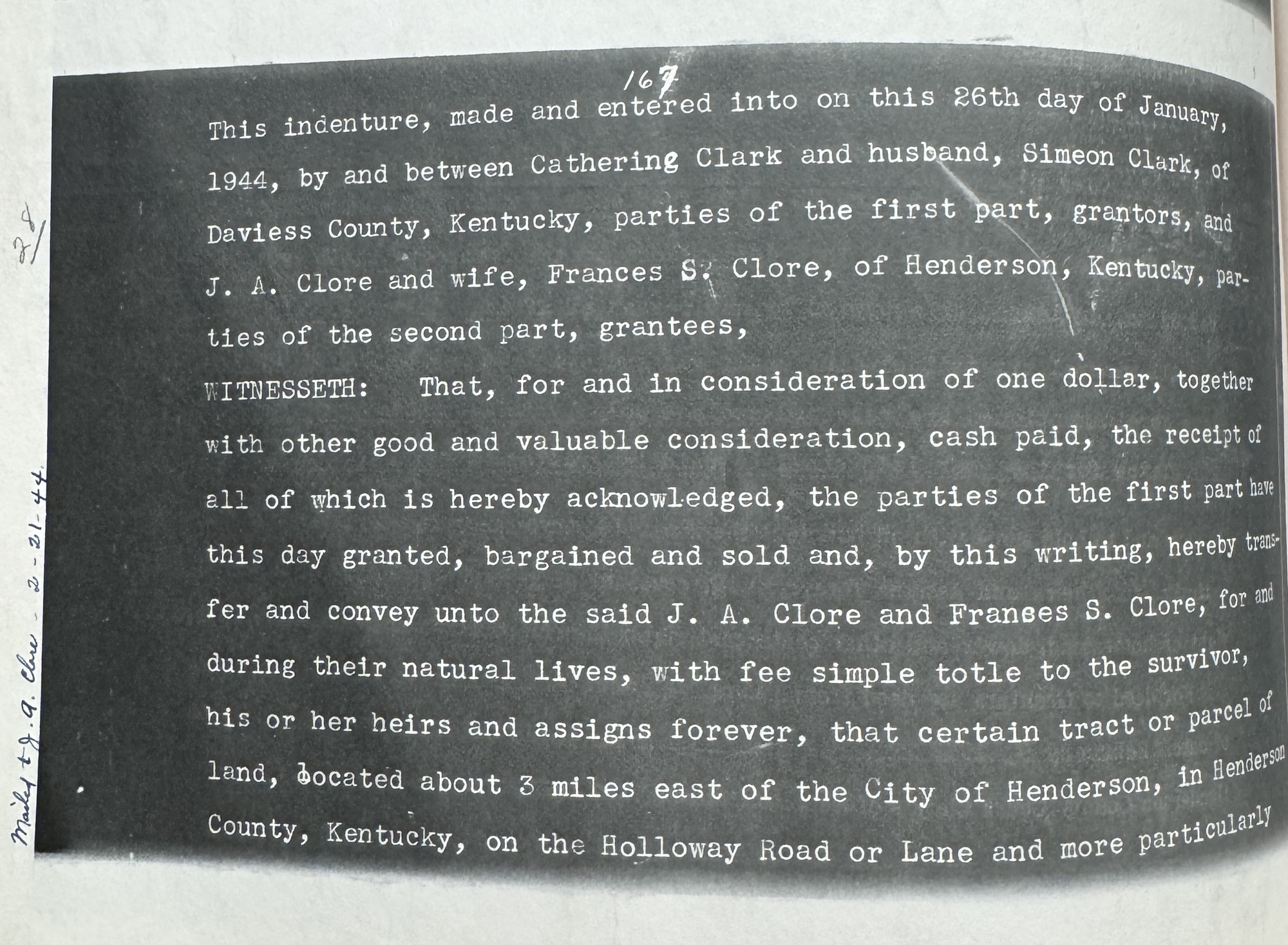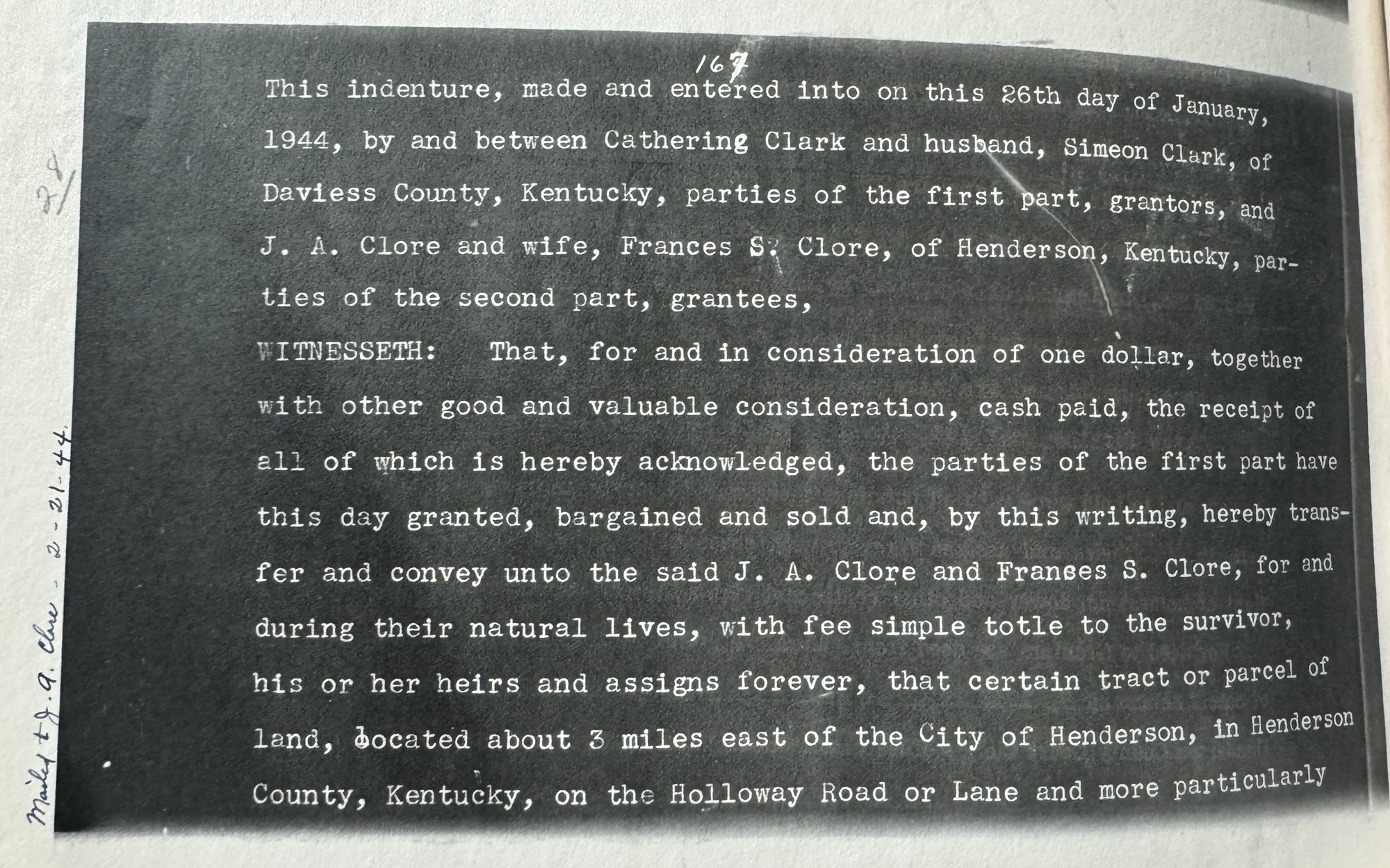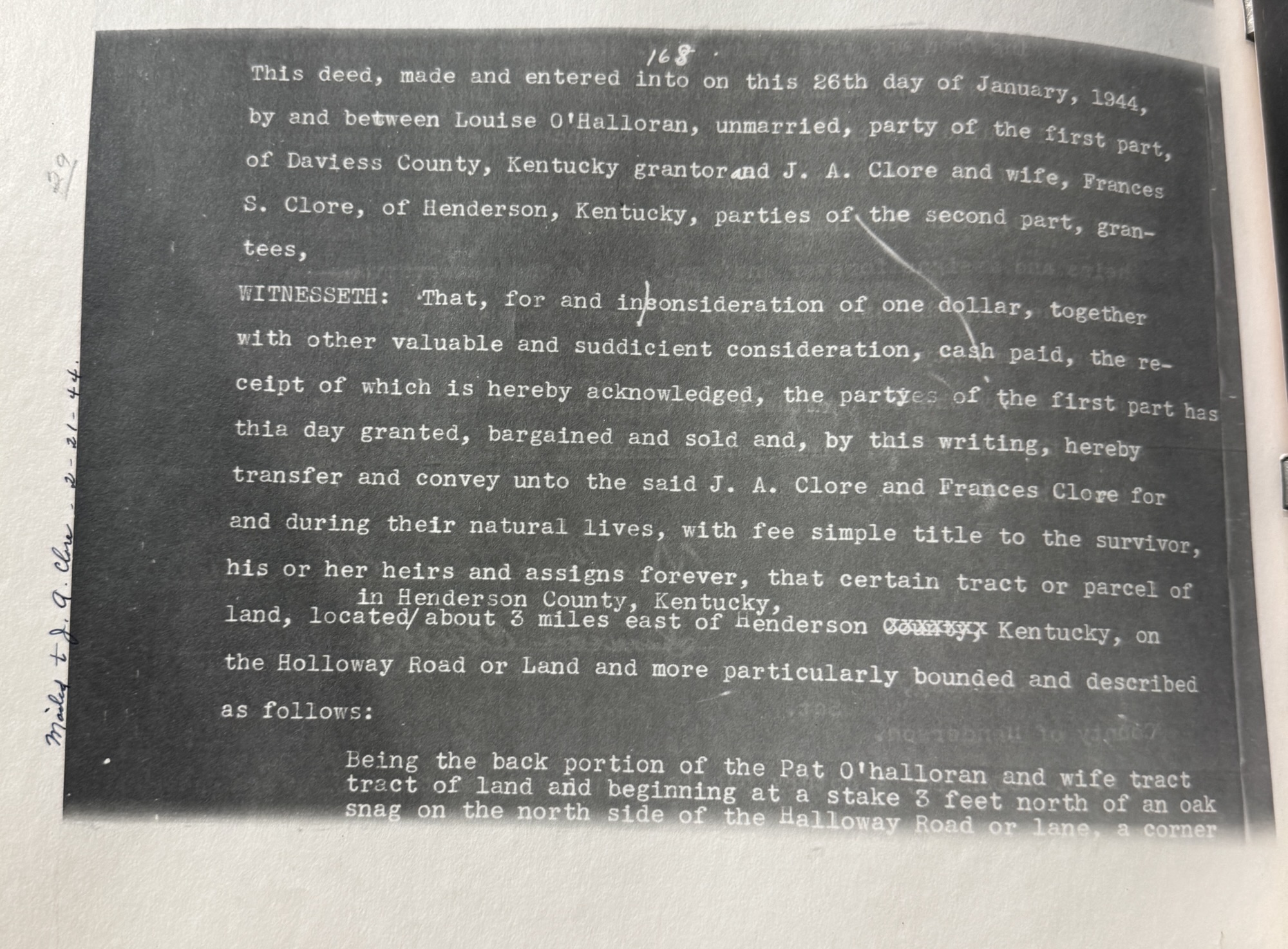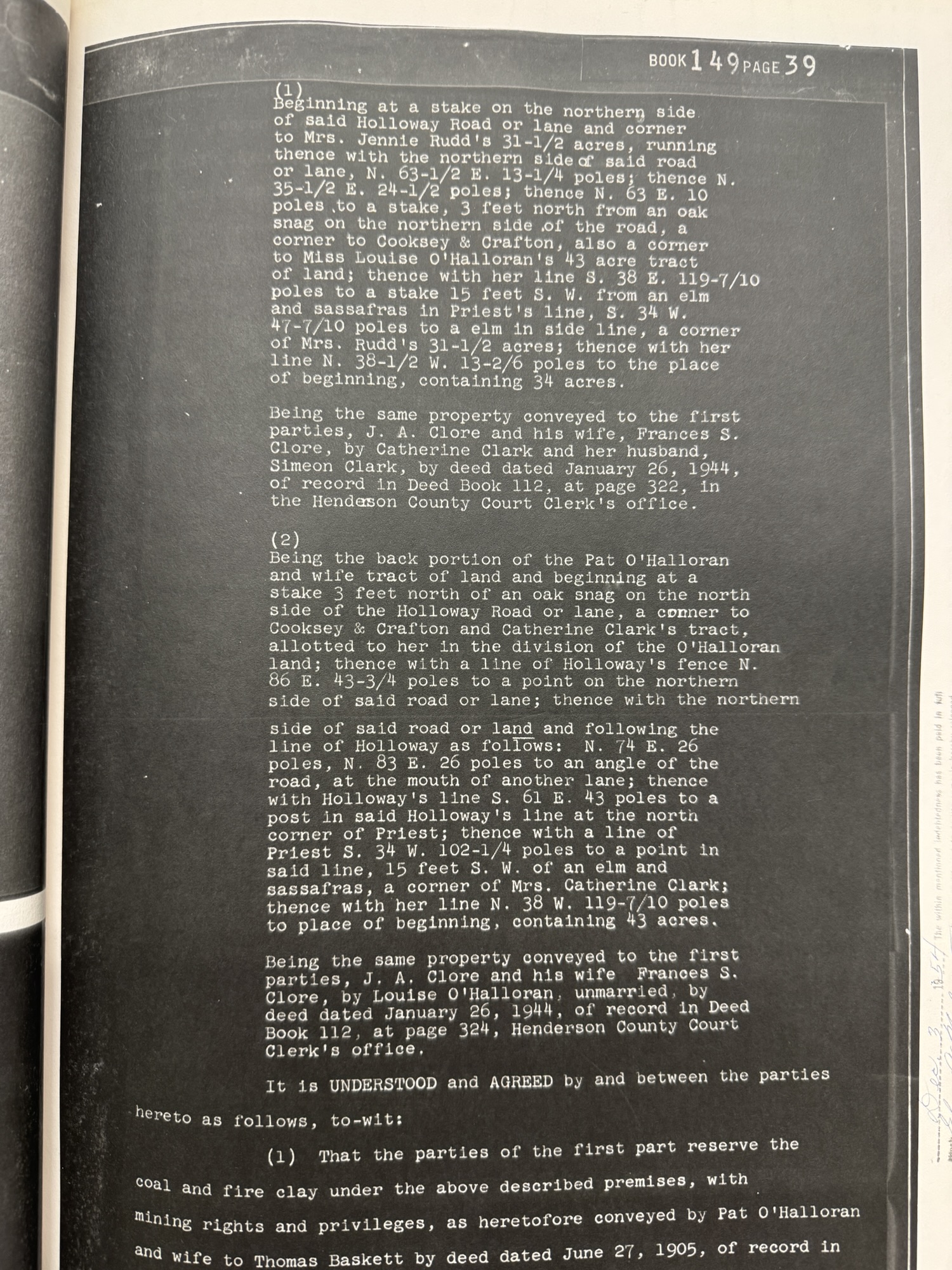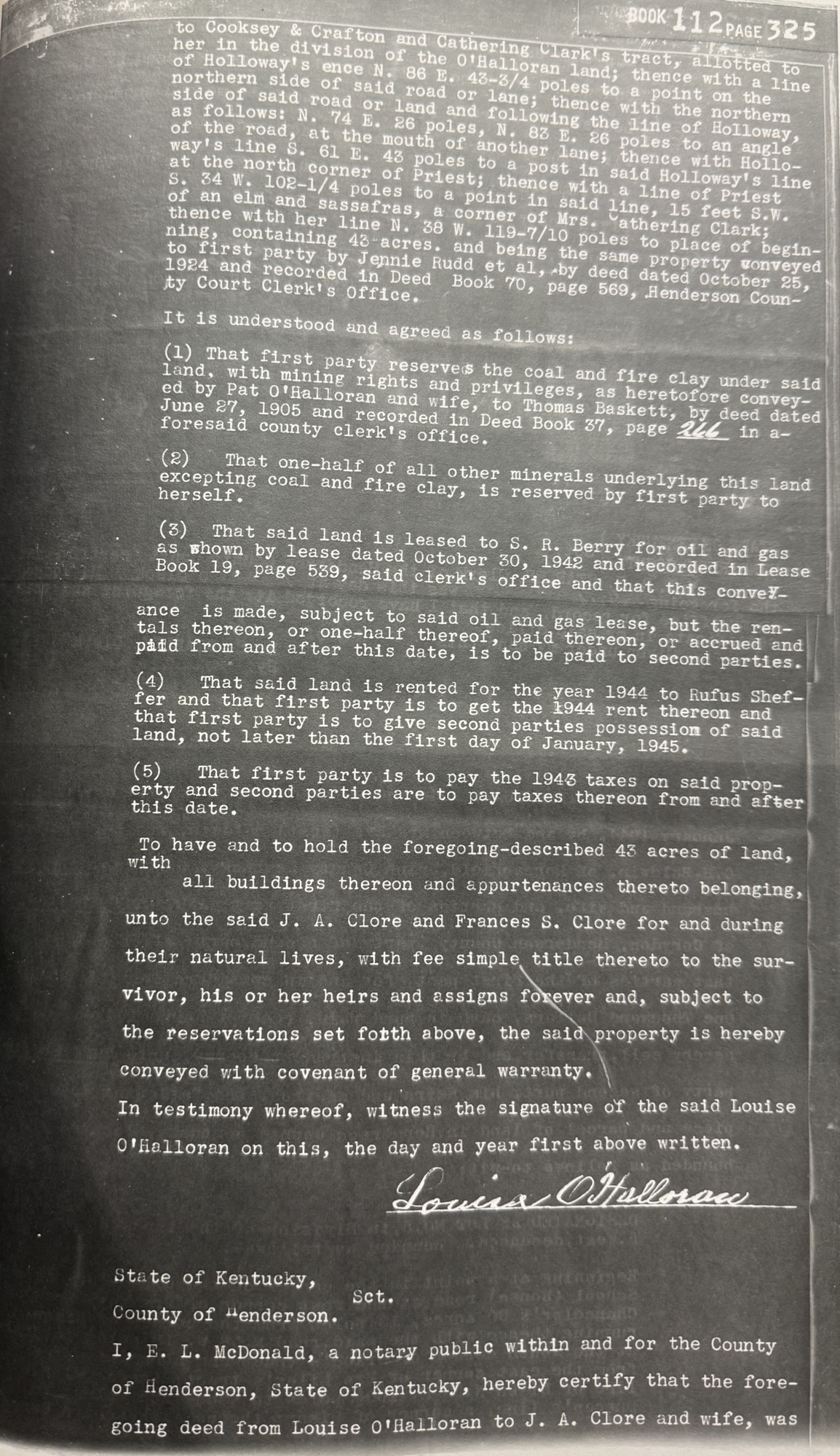 On January 26, 1944, Catherine Clark and husband Simeon Clark conveyed a 34-acre tract fronting Holloway Road to J. Alves Clore and wife Frances S. Clore (Deed Book 112, page 322). That same day, Louise O’Halloran conveyed the adjoining 43-acre back portion (Deed Book 112, page 325). Together, the transfers placed roughly 77 acres along the south side of Holloway into Clore ownership.