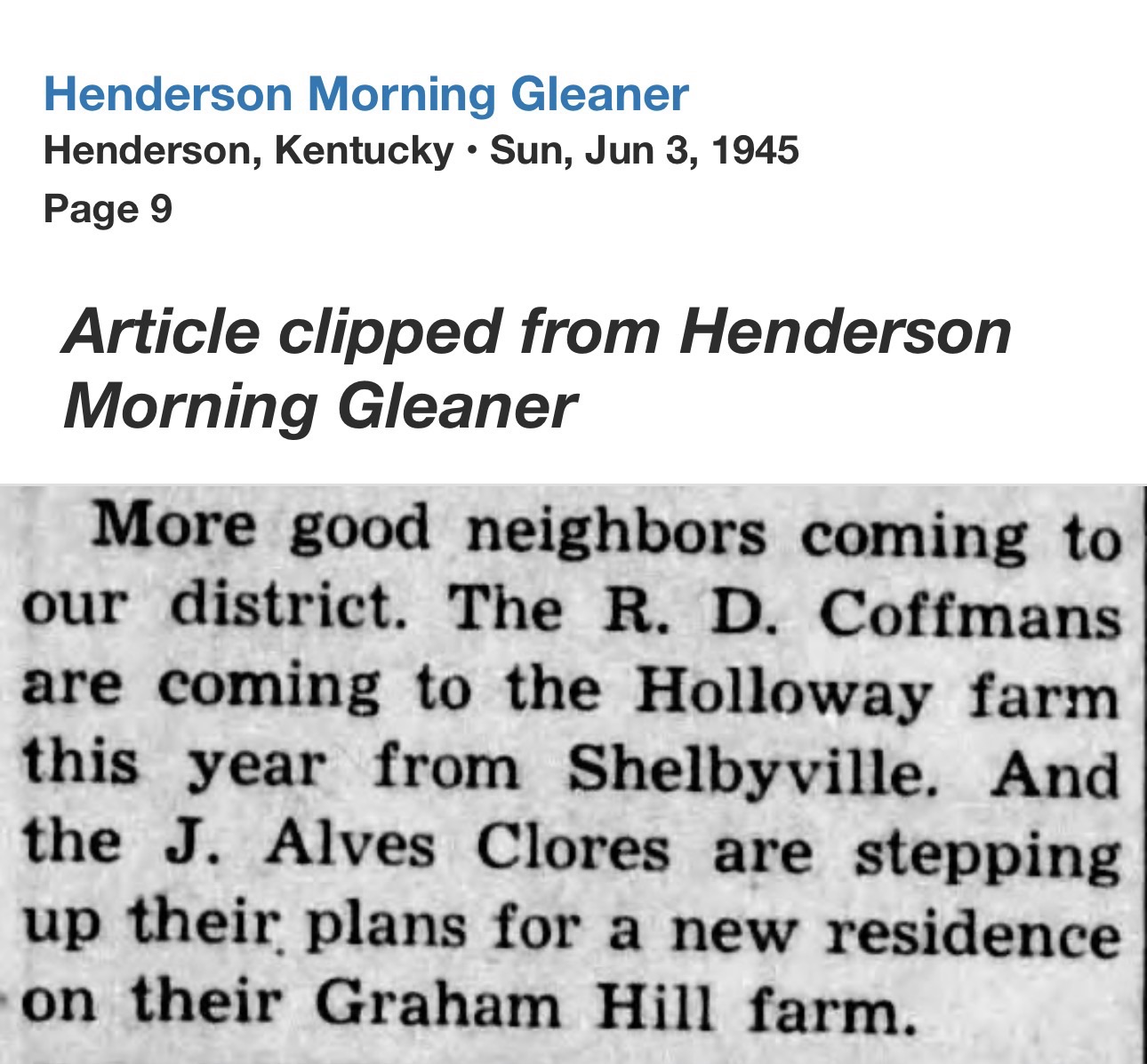 J. Alves Clore was serving as Mayor of Henderson from 1942 to 1946, and contemporary newspaper accounts noted the Clores’ plans to build a home on their Graham Hill farm, including construction of a lake.