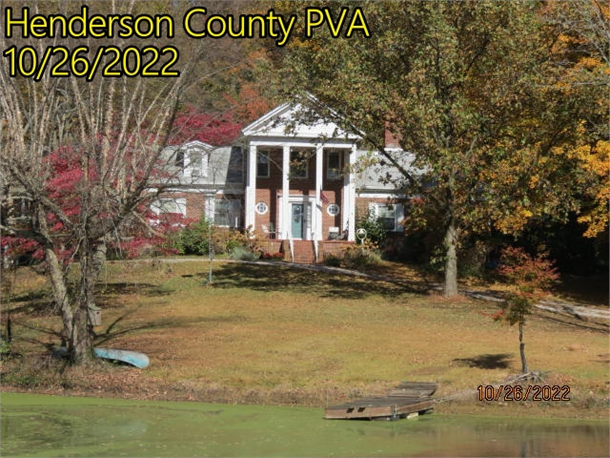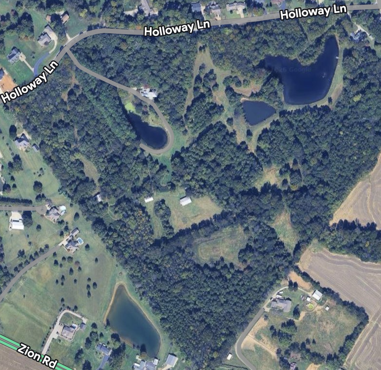 The present residence on the property dates to 1944, aligning with that period of development. The house is a two-story, wood-frame structure with brick veneer, gabled roof, and full basement (including a sunken basement configuration). It contains approximately 3,854 square feet of living space, with five bedrooms, three full baths, and one half bath. The home includes a two-car basement garage, central air, forced-air heat, two fireplaces, and an open porch overlooking one of the property’s ponds. A gravel drive winds back from Holloway Lane through the wooded hillside to the residence.