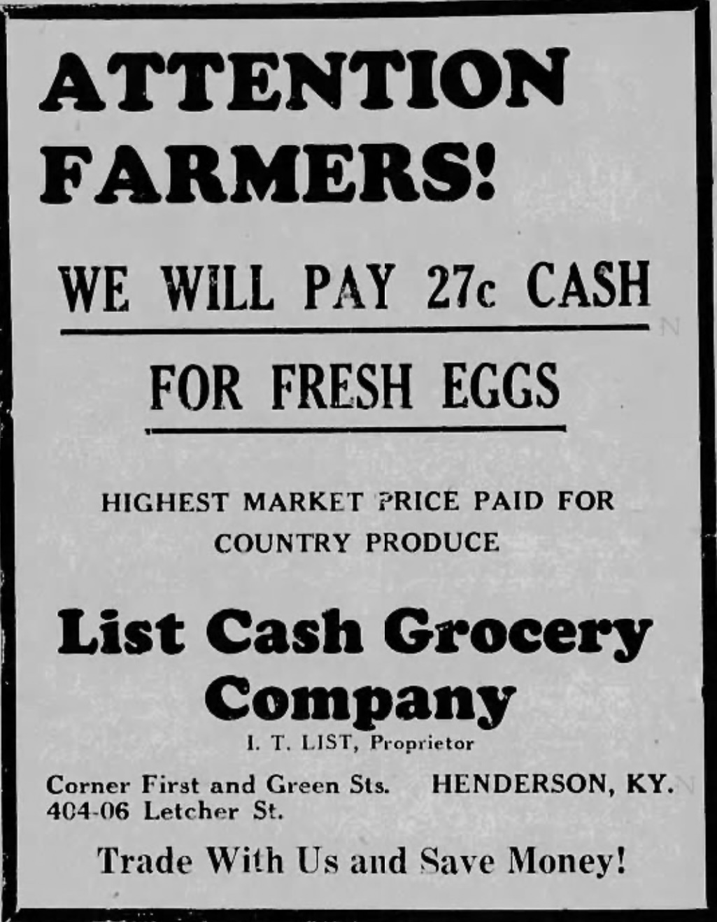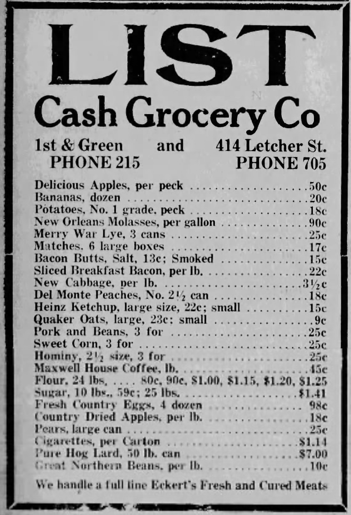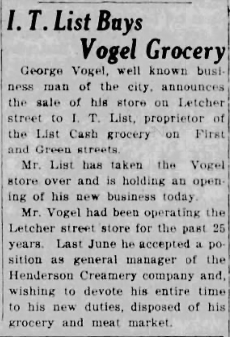 414 Letcher 414 Letcher, originally George Vogel Grocery (then 404 Letcher), sold to I. T. List in 1929 and became List Grocery #2. List sold his business in 1939. The building has since been demolished. Share this:Post November 10, 2025 In Business ← Previous post