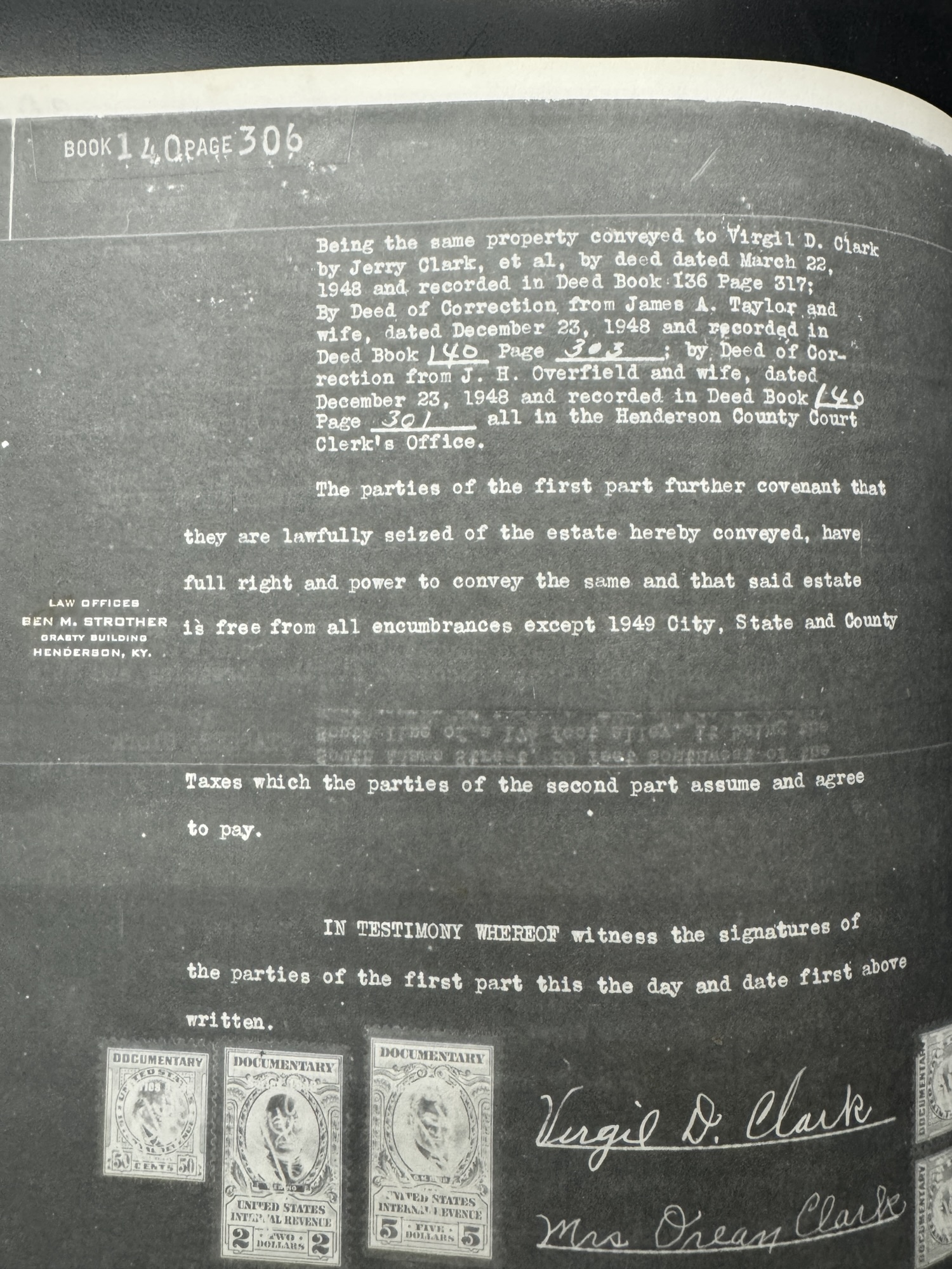 • March 22, 1948 – conveyed to Virgil D. Clark (DB 136, p. 317)
