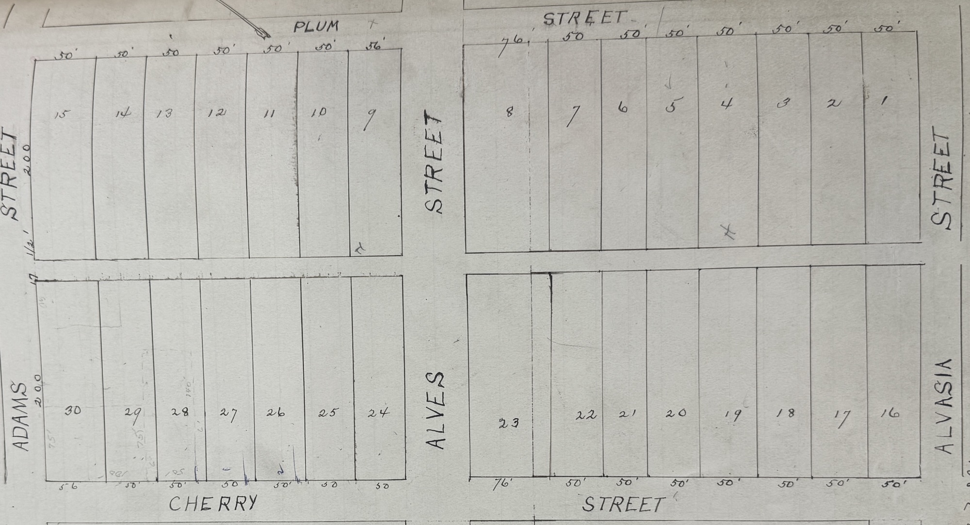 616 S. Adams Street sits on part of Lots 29 and 30 of the Alves Addition, recorded in Deed Book 39, page 190. The parcel fronts 64 feet on the east side of Adams Street and runs back 100 feet, containing approximately 6,400 square feet.