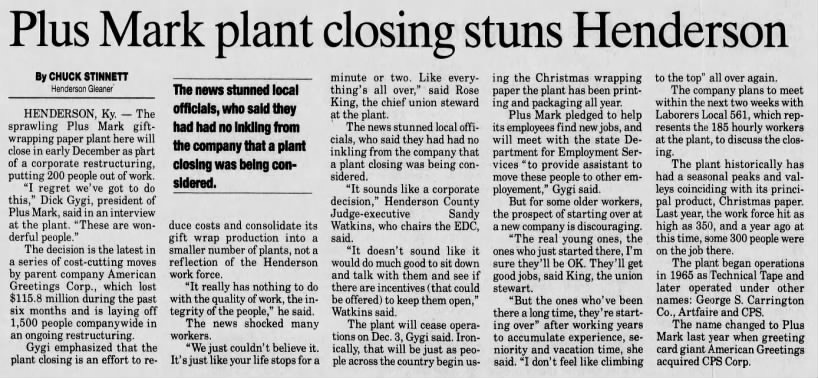The property later operated under several corporate names, including CPS Corporation (The Giftwrap Company) and Plus Mark, reflecting shifts in ownership and changes within the packaging industry. Those changes culminated in the early 2000s, when corporate restructuring led to the plant’s closure, a moment that stunned the community and marked the loss of one of Henderson’s largest industrial employers.