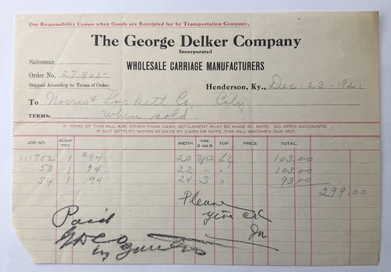 The Henderson Buggy Co. continued to run for a few years, until their capital was exhausted, at which time their plant and good-will were bought by the George Delker Co.