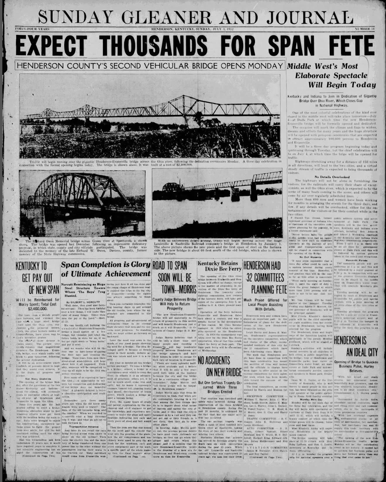 The Evansville-Henderson Bridge cost $2.4 million to construct and opened to traffic on July 4, 1932.
