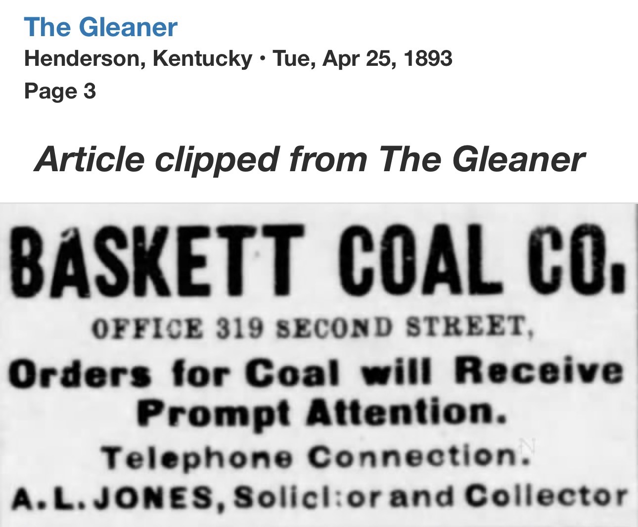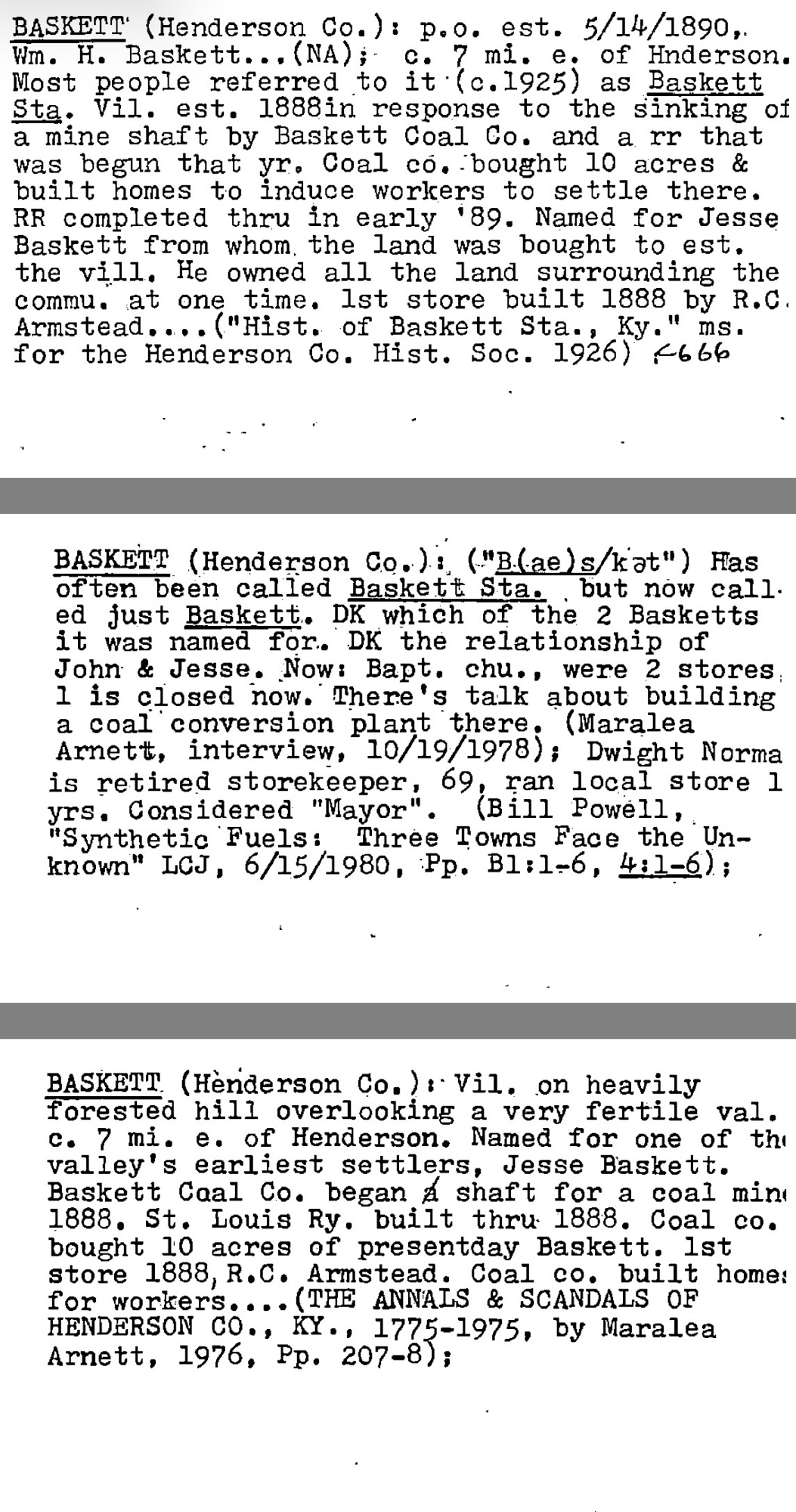 BASKETT, Ky., Feb. 21 (Special.) On the Louisville, Henderson and St. Louis railroad, about seven miles east of Henderson, is located, what most people call “Baskett Station”. This little village was formed during the year 1888, and is now entering its 38th year.