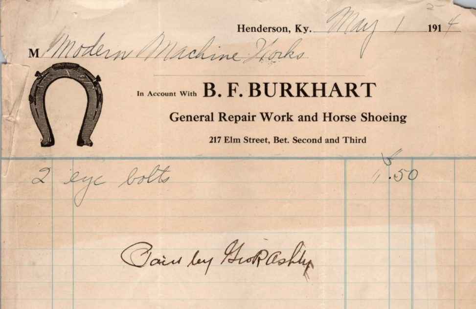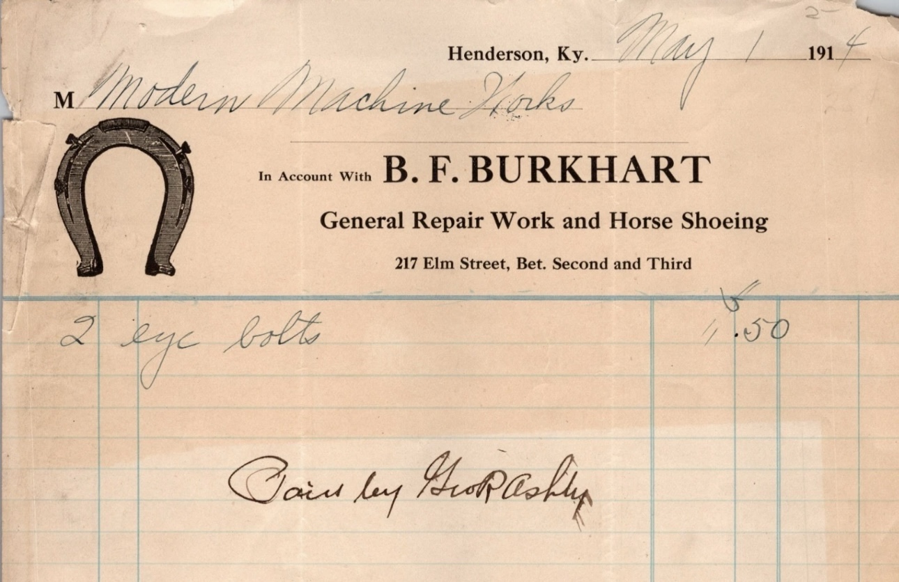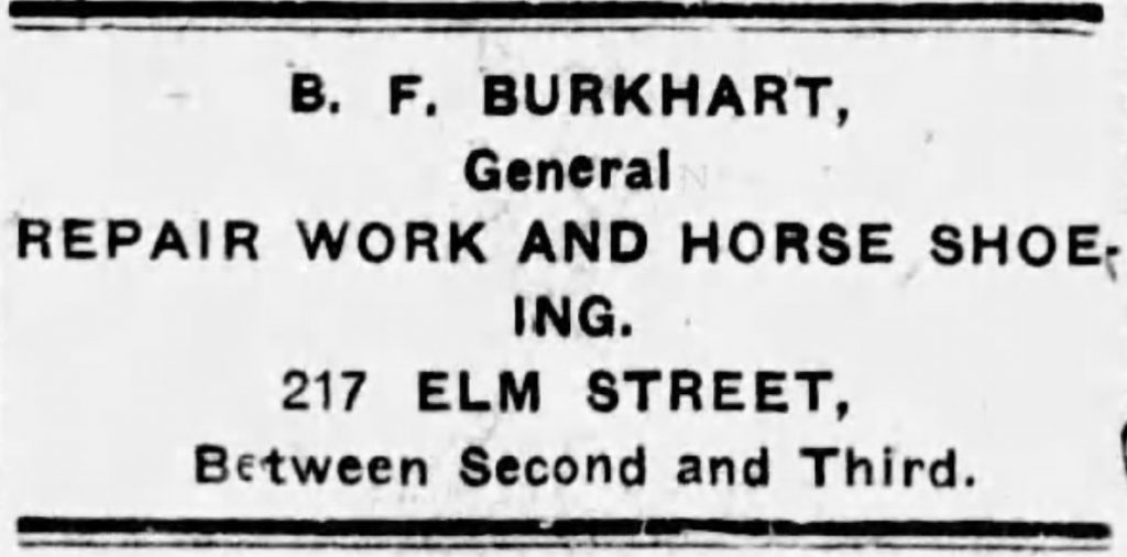 Benjamin Franklin Burkhardt Benjamin Franklin Burkhardt was born 16 November 1871. He was married to Ida Sutton. B F Burkhart operated a general repair work and horse shoeing business at 217 N Elm. B. F. Burkhart died 22 May 1955 in Louisville, KY. Share this:Post November 6, 2025 In People ← Previous post