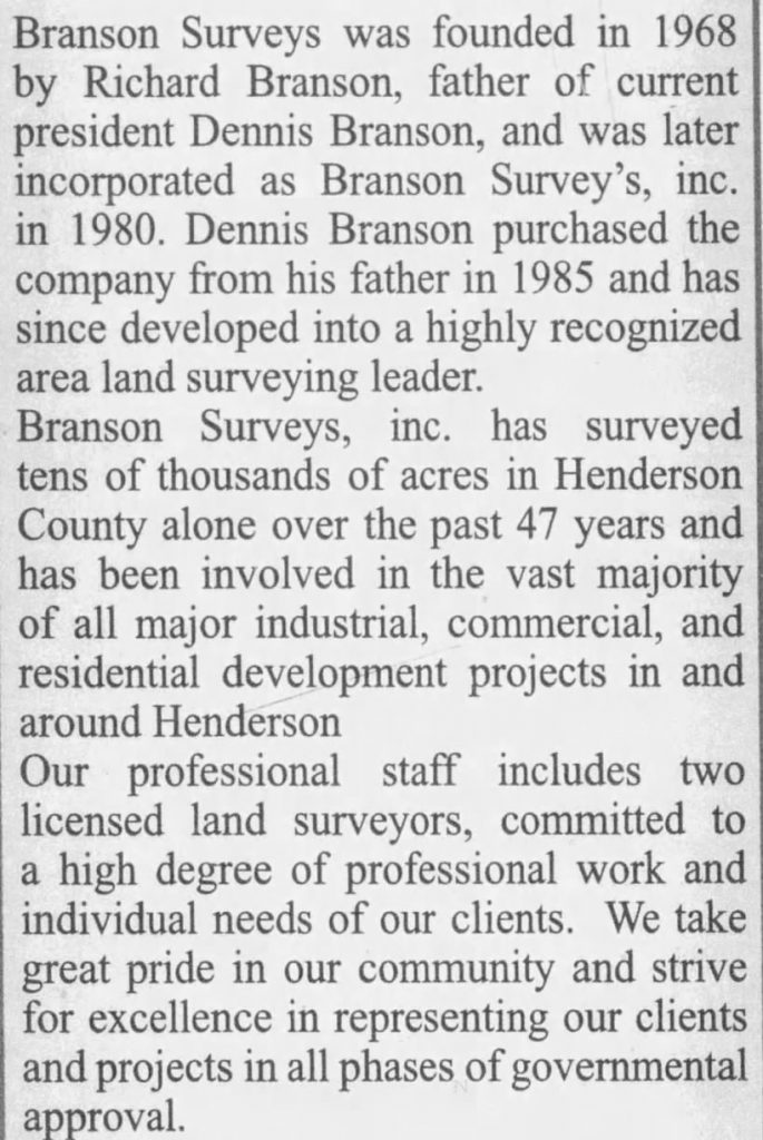 In Henderson, the work of Branson Surveys is still visible today, etched into property lines, roadways, developments, and neighborhoods across the county. It is quiet work, often unnoticed, but lasting in every sense, shaping the city one boundary line at a time.