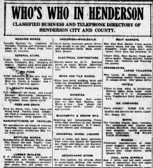 Who’s Who In Henderson CLASSIFIED BUSINESS AND TELEPHONE DIRECTORY OF HENDERSON CITY AND COUNTY. MACHINE WORKSCorydon Machine Co., repairers of Portable, Traction and Stationary Engines, etc. W. A….