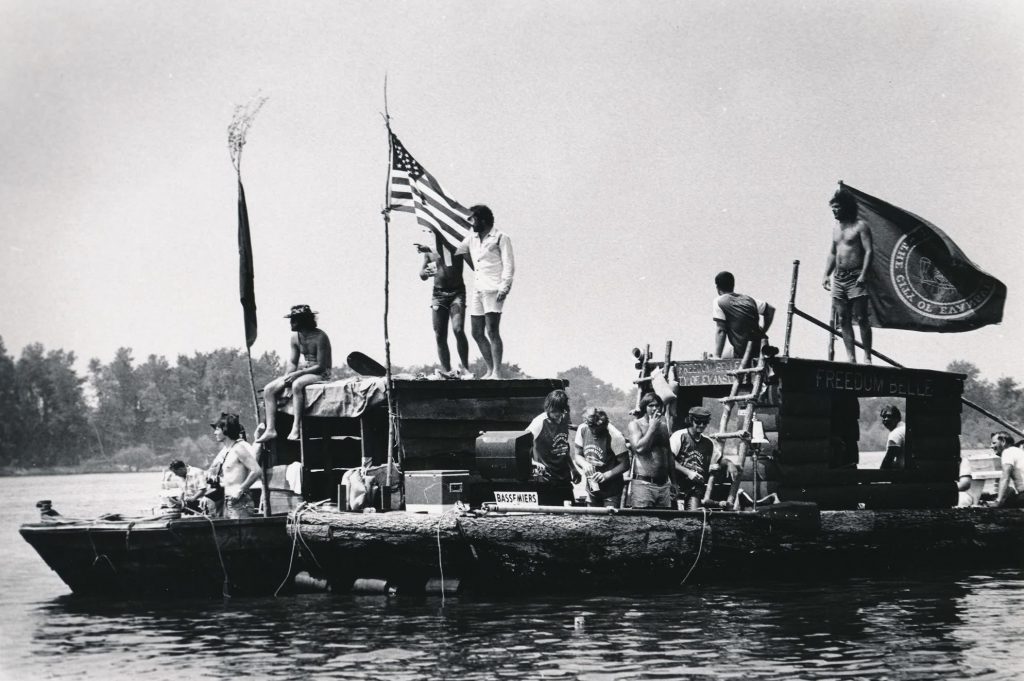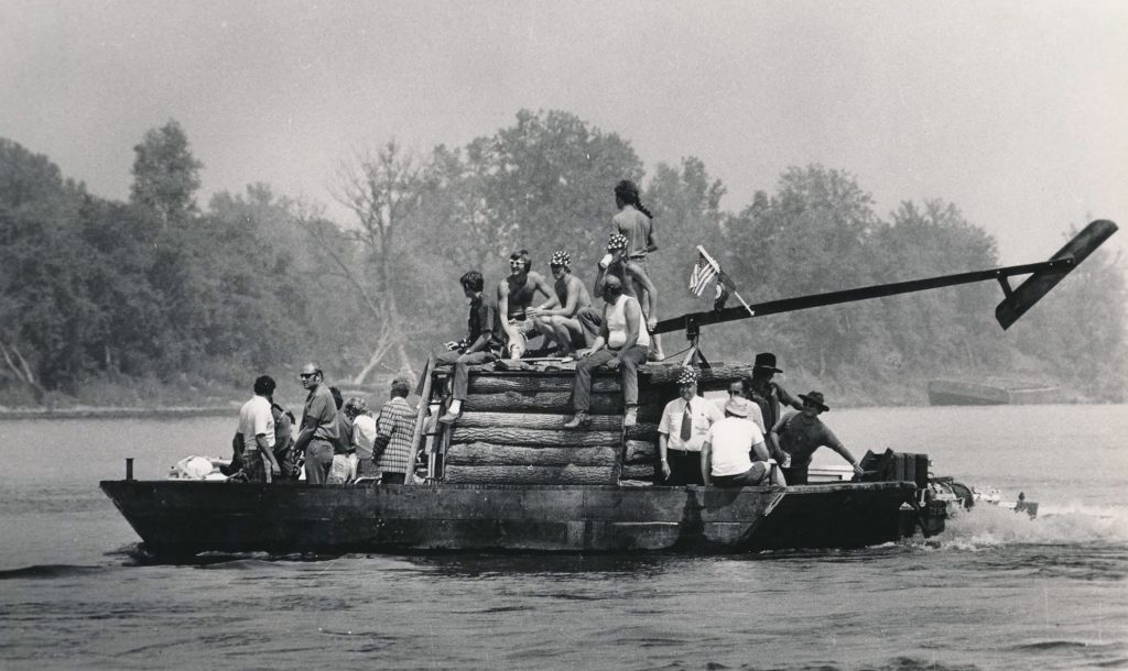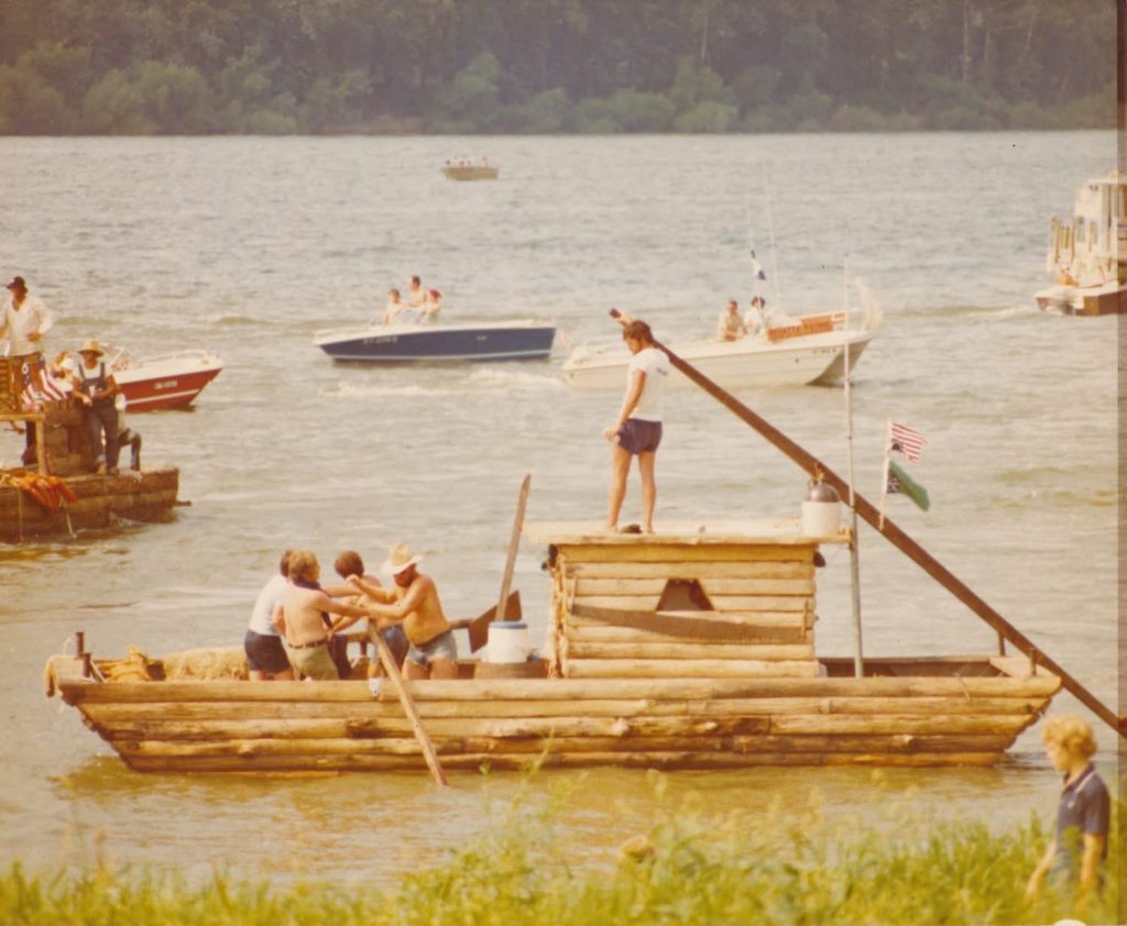 Gleaner. “The Queen is more rustic and looks more authentic because of the logs we used for the cabin. The only thing is the guys went a little sophisticated with the green shag carpet on the deck.” (By 1980 crews of the more authentic – and heavier – flatboats tended to sit out the actual race and focus on socializing, competing in beachside contests – and drinking beer.)