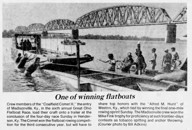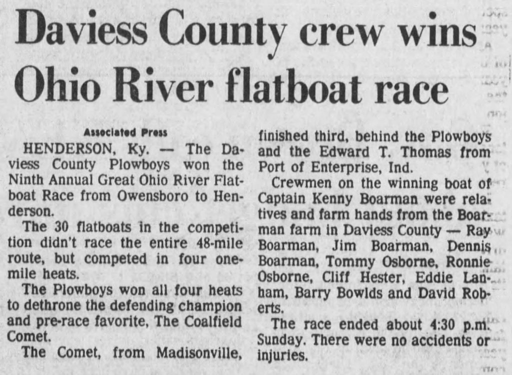 The Great Ohio River Flatboat Race was to continue through 1986 but that was the last time Henderson came in first. To local chagrin, Owensboro won six times during the race’s 14-year run.