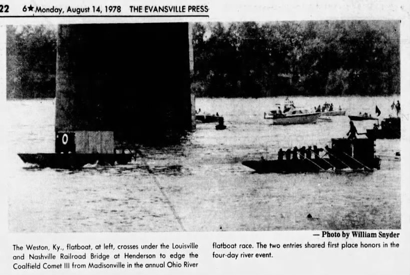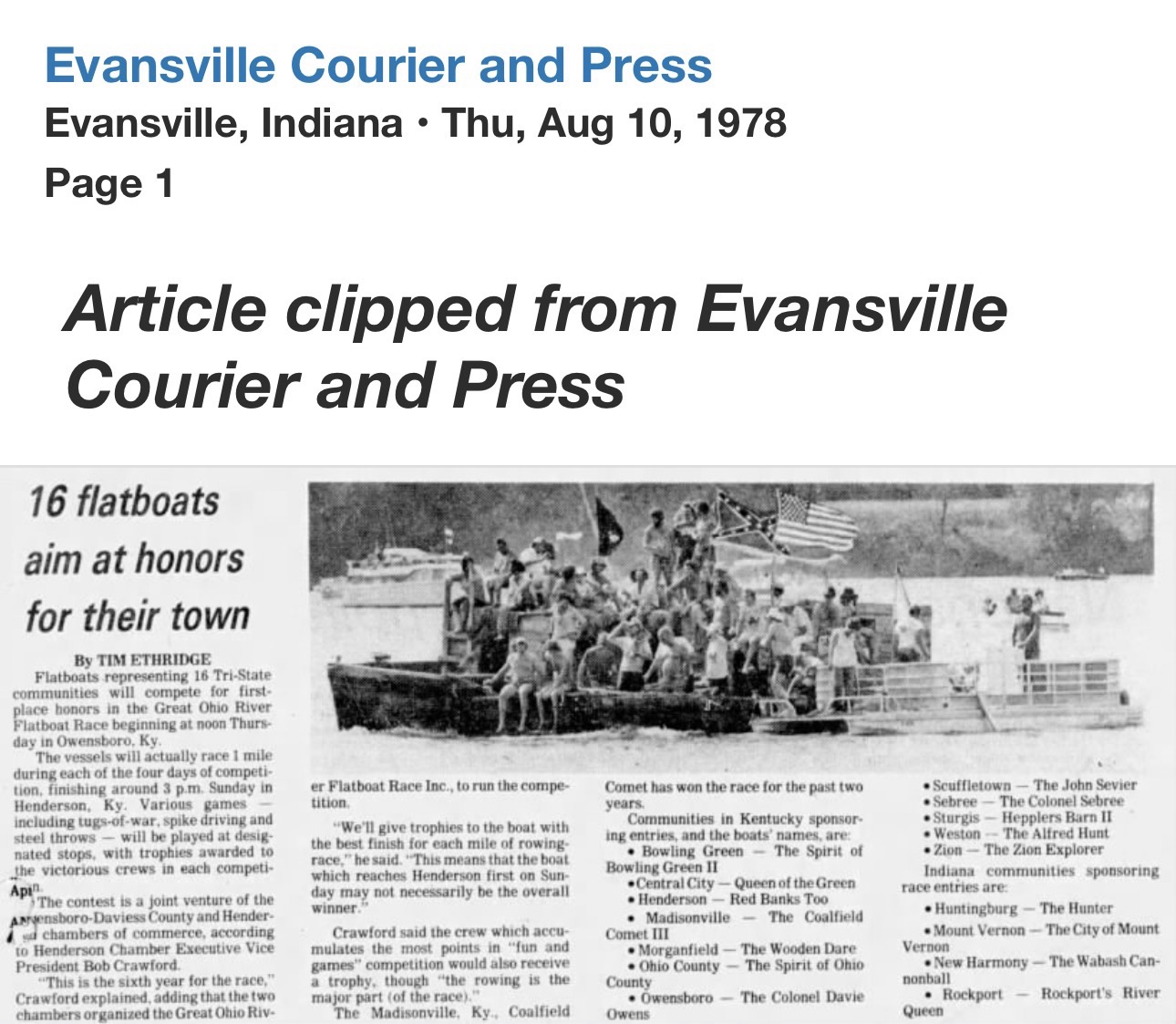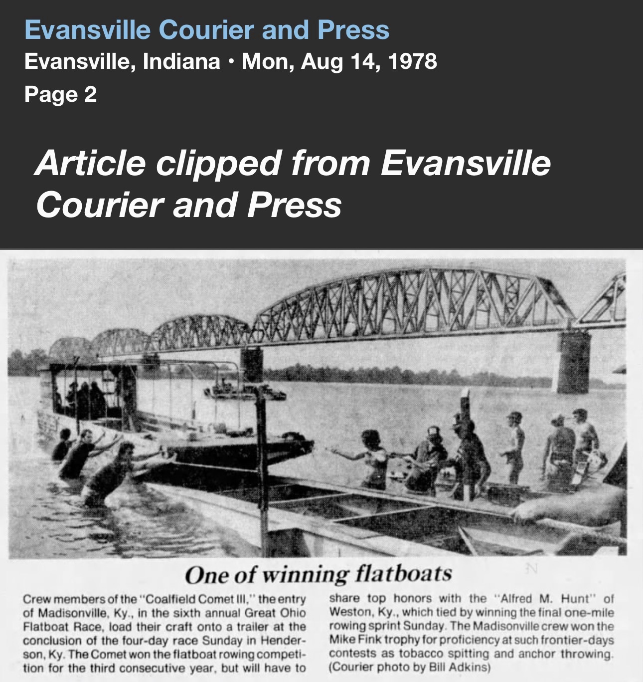 That race ended at Dogtown Marina, which was a last-minute change made during a meeting of flatboat captains, according to The Gleaner of Aug. 12, which referred to “the now defunct Flatboat Days” celebration.