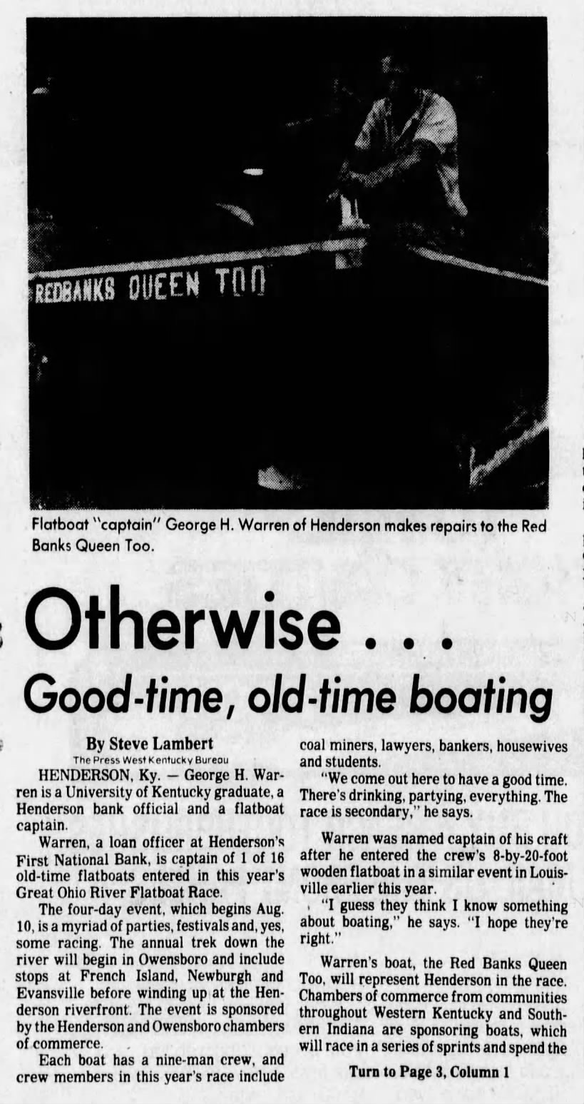 They pulled hard in the last stretch and caught the Owensboro entry near Evansville. A band struck up the “Bal-lad of Davy Crockett” as the Redbanks Queen pulled into the Second Street boat ramp a football field length ahead of the opposition, according to The Gleaner of Aug. 28.