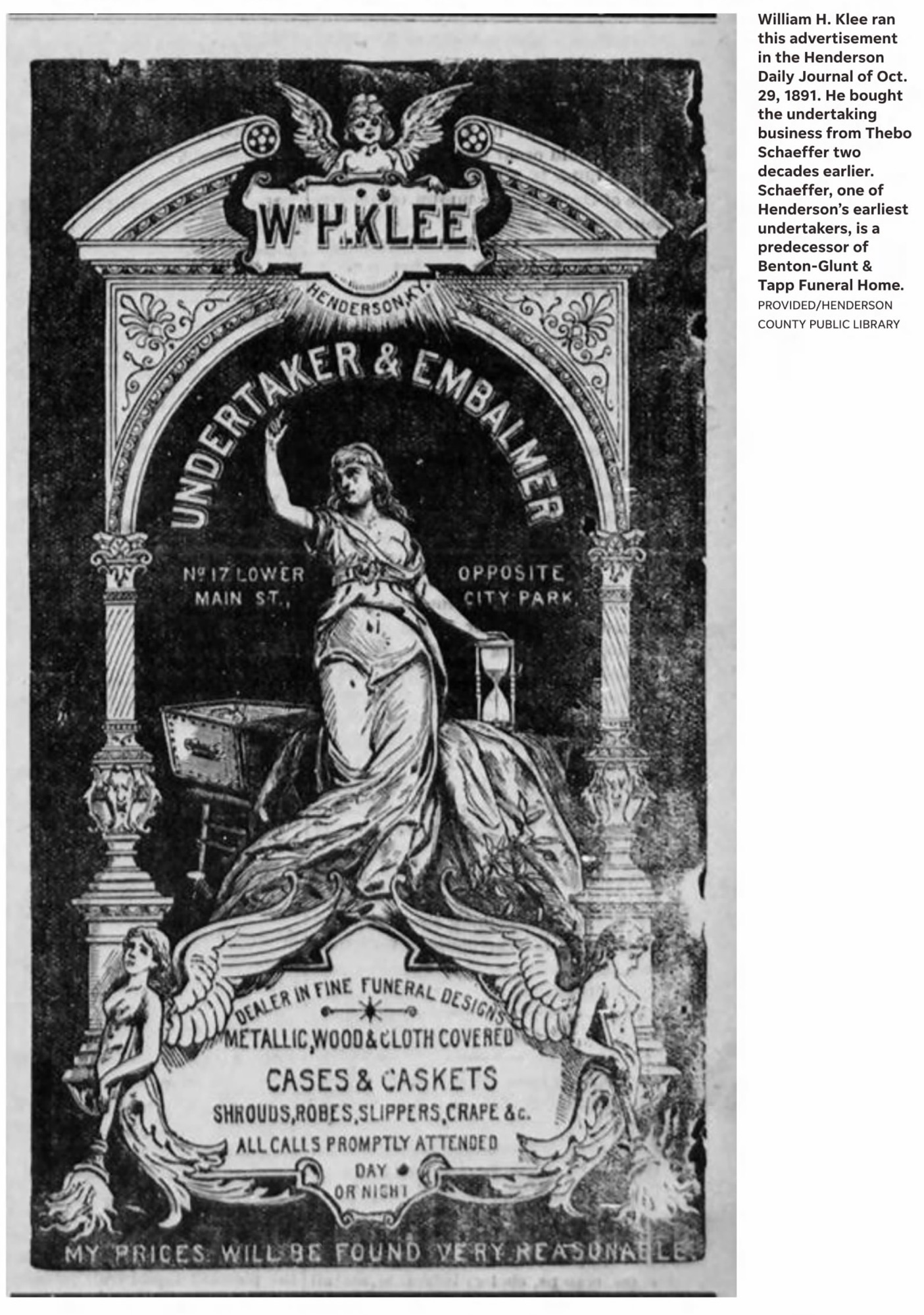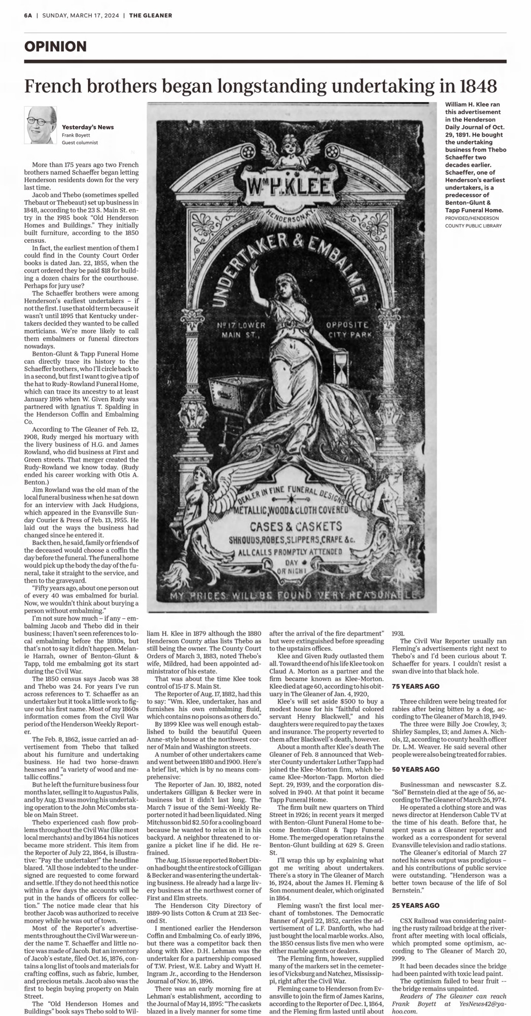 Benton-Glunt & Tapp Funeral Home can directly trace its history to the Schaeffer brothers, who I’ll circle back to in a second, but first I want to give a tip of the hat to Rudy-Rowland Funeral Home, which can trace its ancestry to at least January 1896 when W. Given Rudy was partnered with Ignatius T. Spalding in the Henderson Coffin and Embalming Co.