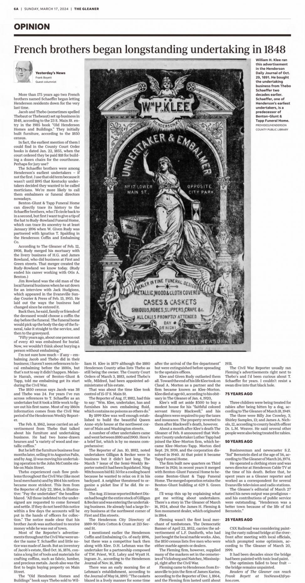 Benton-Glunt & Tapp Funeral Home can directly trace its history to the Schaeffer brothers, who I’ll circle back to in a second, but first I want to give a tip of the hat to Rudy-Rowland Funeral Home, which can trace its ancestry to at least January 1896 when W. Given Rudy was partnered with Ignatius T. Spalding in the Henderson Coffin and Embalming Co.