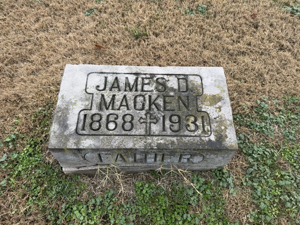 Following his death, James D. Macken was returned to Henderson, Kentucky, for burial. Funeral services were held at the Church of the Assumption, and he was interred in Saint Louis Cemetery. His gravestone bears the inscription “Father,” marking his enduring role within his family.