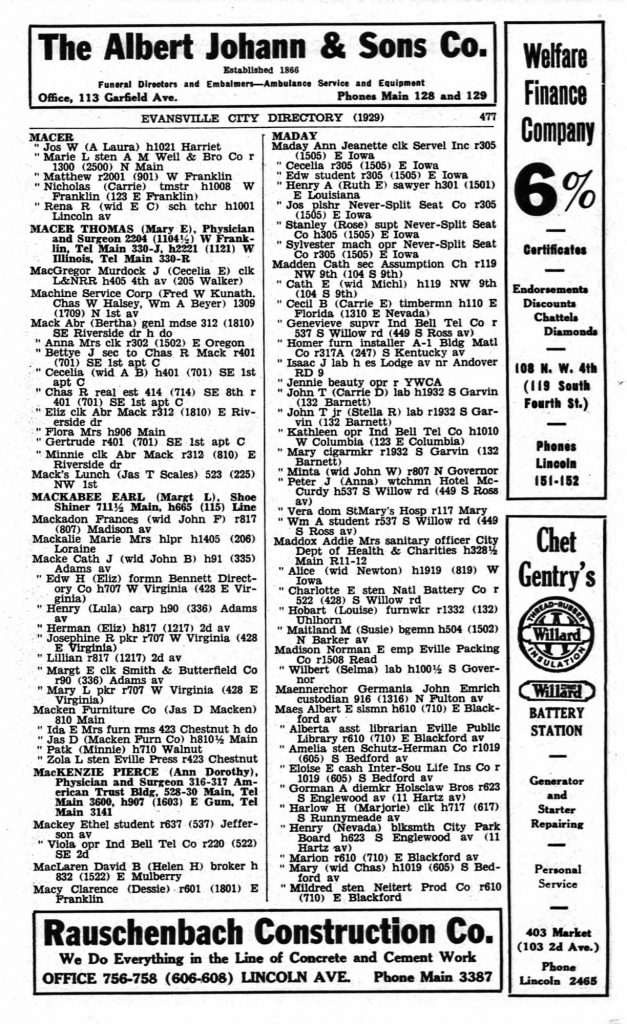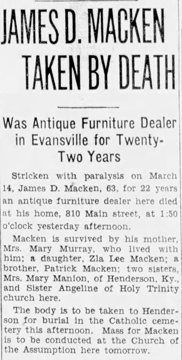By the early twentieth century, Macken had settled in Evansville, Indiana, where he became a prominent antique furniture dealer. For twenty-two years, he operated his business on Main Street, working and residing at 810 Main Street, placing him at the center of Evansville’s commercial life.