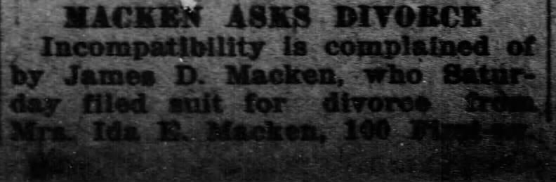 On December 3, 1909, at the age of forty-one, James married Ida E. Gardner in Vanderburgh County, Indiana. The marriage later ended in divorce, documented in 1919, and by the 1930 census Macken was living alone as head of household at 810½ Main Street. He was the father of Zita Lee Macken and remained closely connected to his family throughout his life. His sister, Mrs. Mary Manion, lived in Henderson.