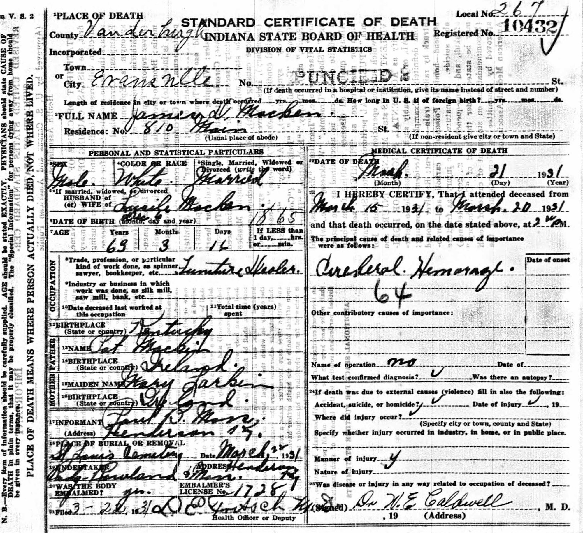 In mid-March 1931, Macken was stricken with paralysis caused by a cerebral hemorrhage. He died at his Evansville home on March 21, 1931, at 1:50 p.m., at the age of sixty-two. His death was widely noted in the local press.