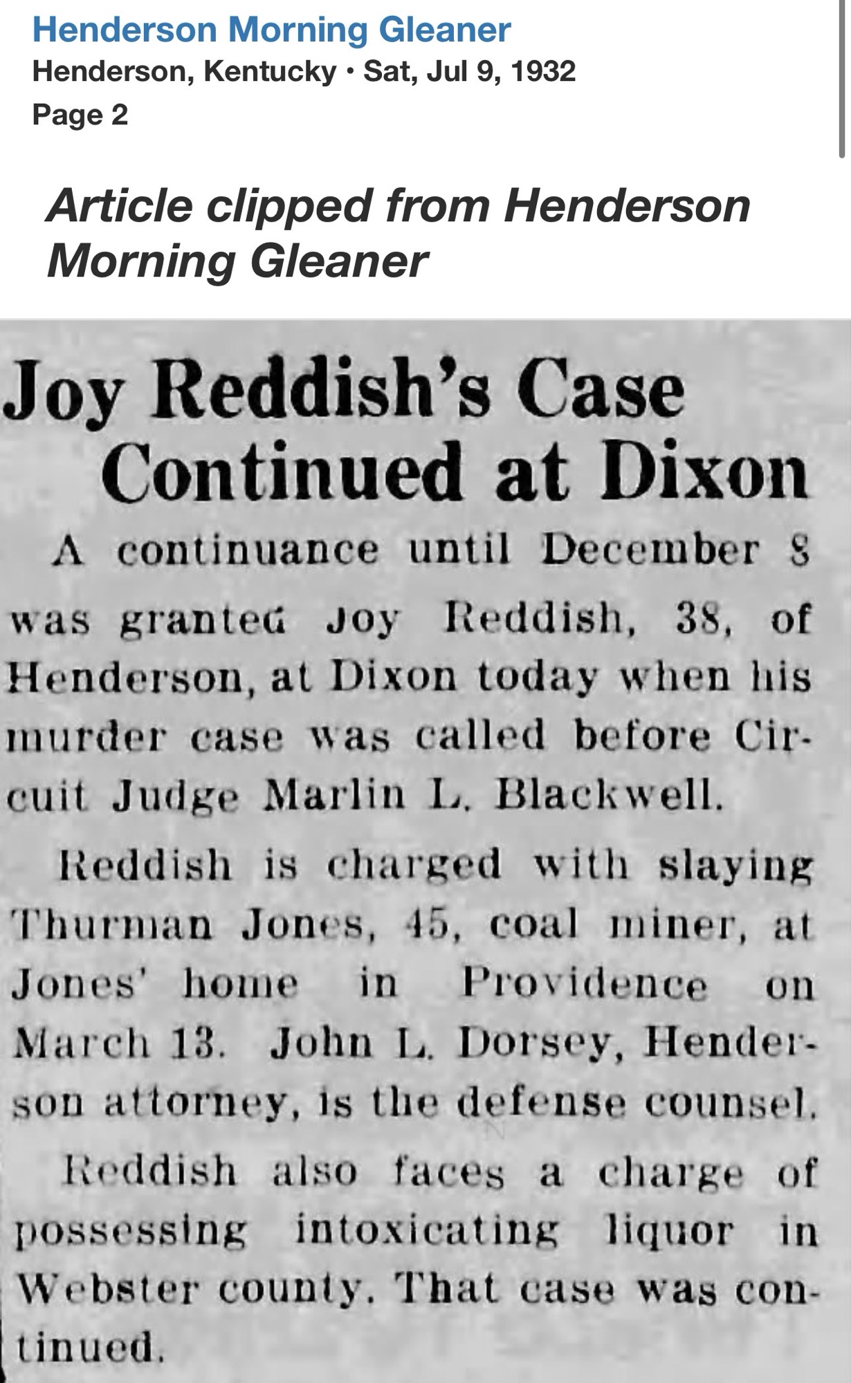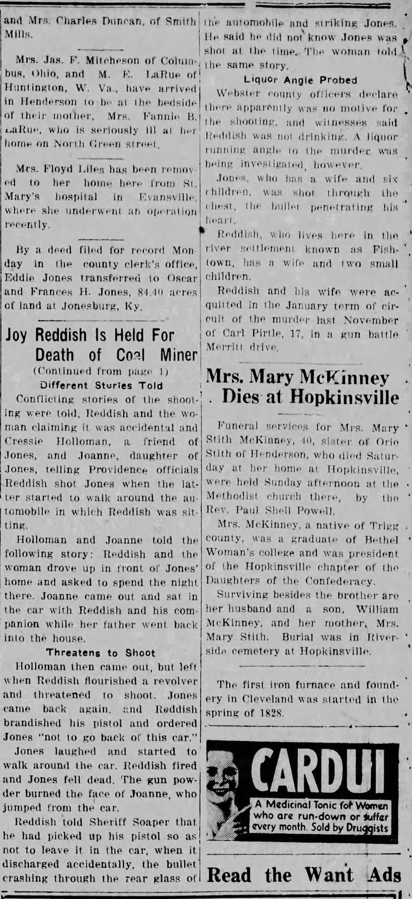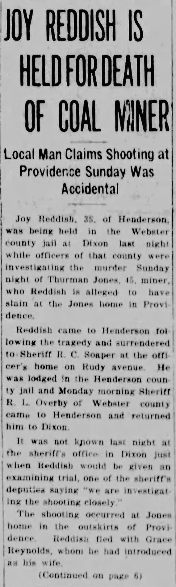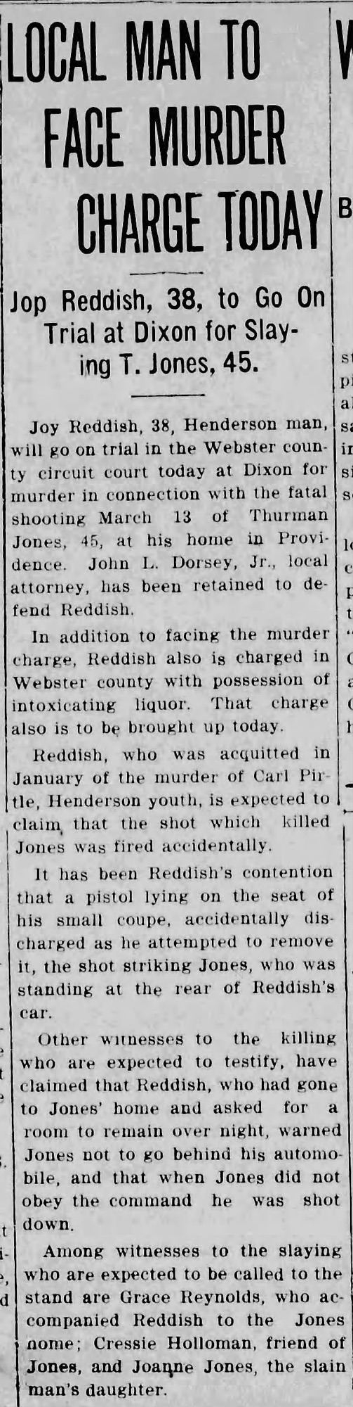 Only weeks later, Reddish’s name returned to the headlines, this time from Webster County. At the Providence home of Thurman Jones, a 45-year-old coal miner, a shot was fired. Jones fell dead. Reddish surrendered to Henderson Sheriff R.C. Soaper and was transported to Dixon.