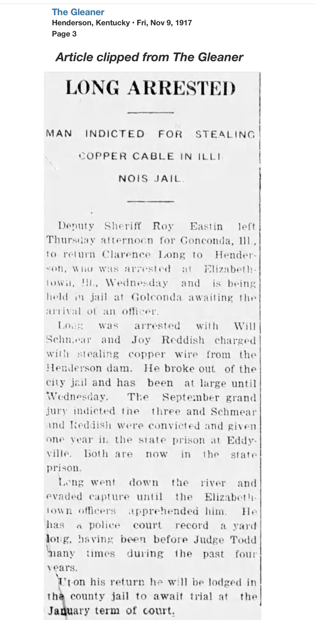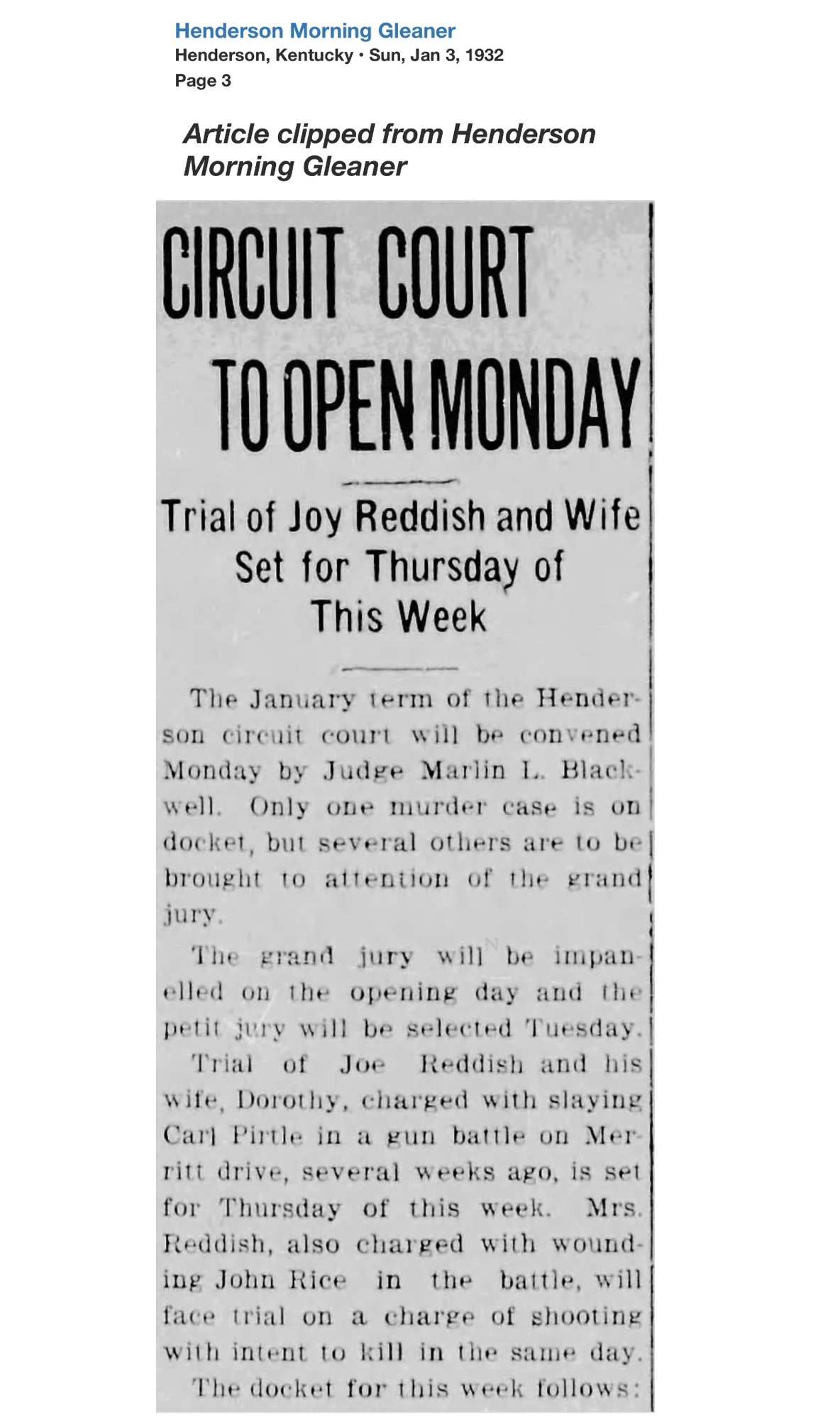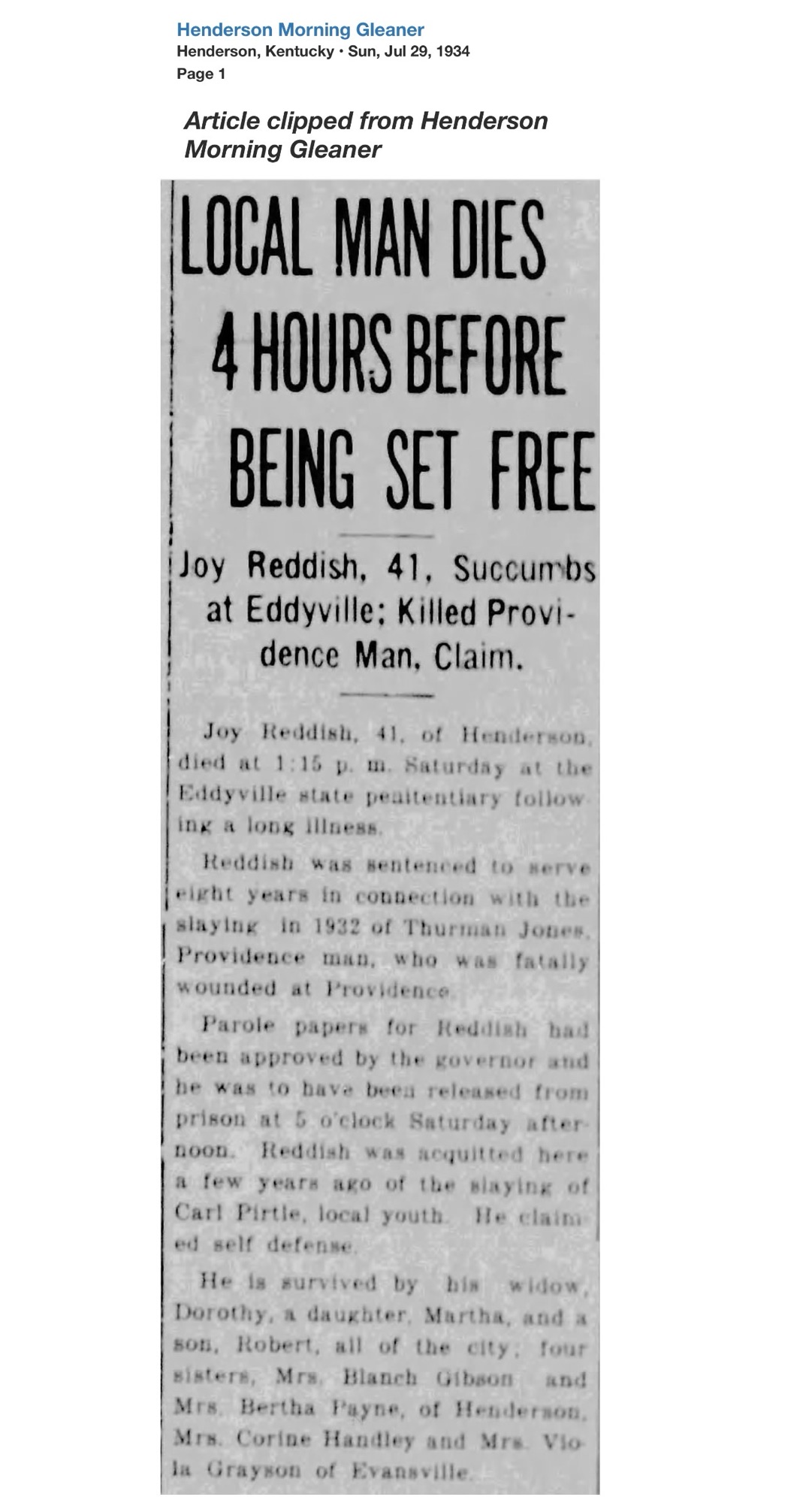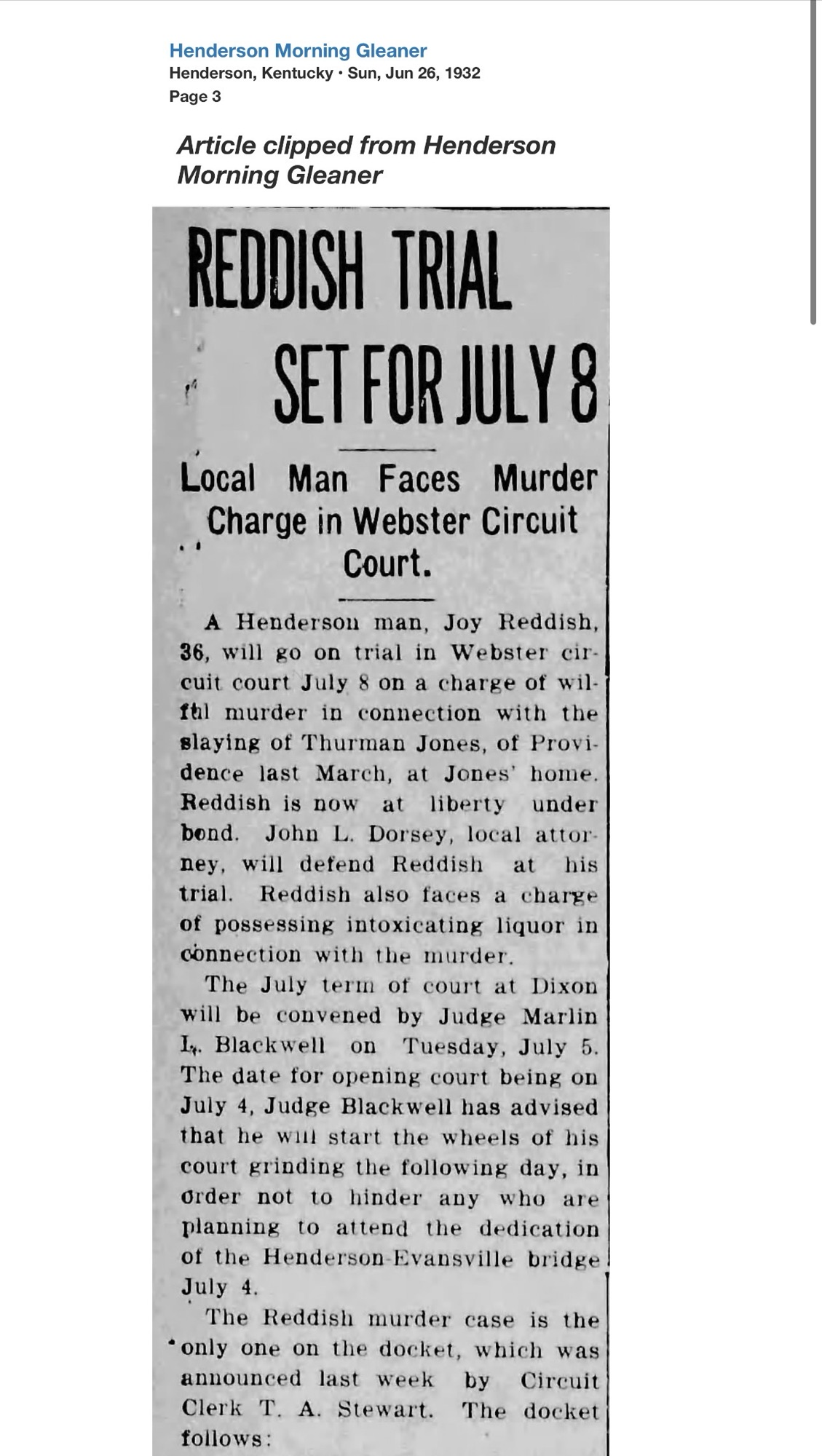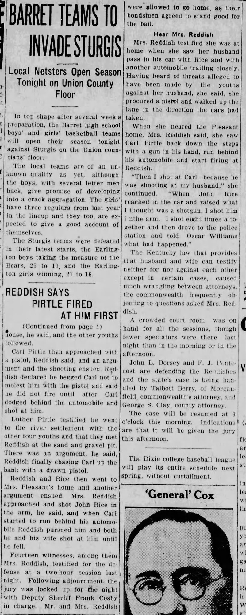 Only weeks later, Reddish’s name returned to the headlines, this time from Webster County. At the Providence home of Thurman Jones, a 45-year-old coal miner, a shot was fired. Jones fell dead. Reddish surrendered to Henderson Sheriff R.C. Soaper and was transported to Dixon.