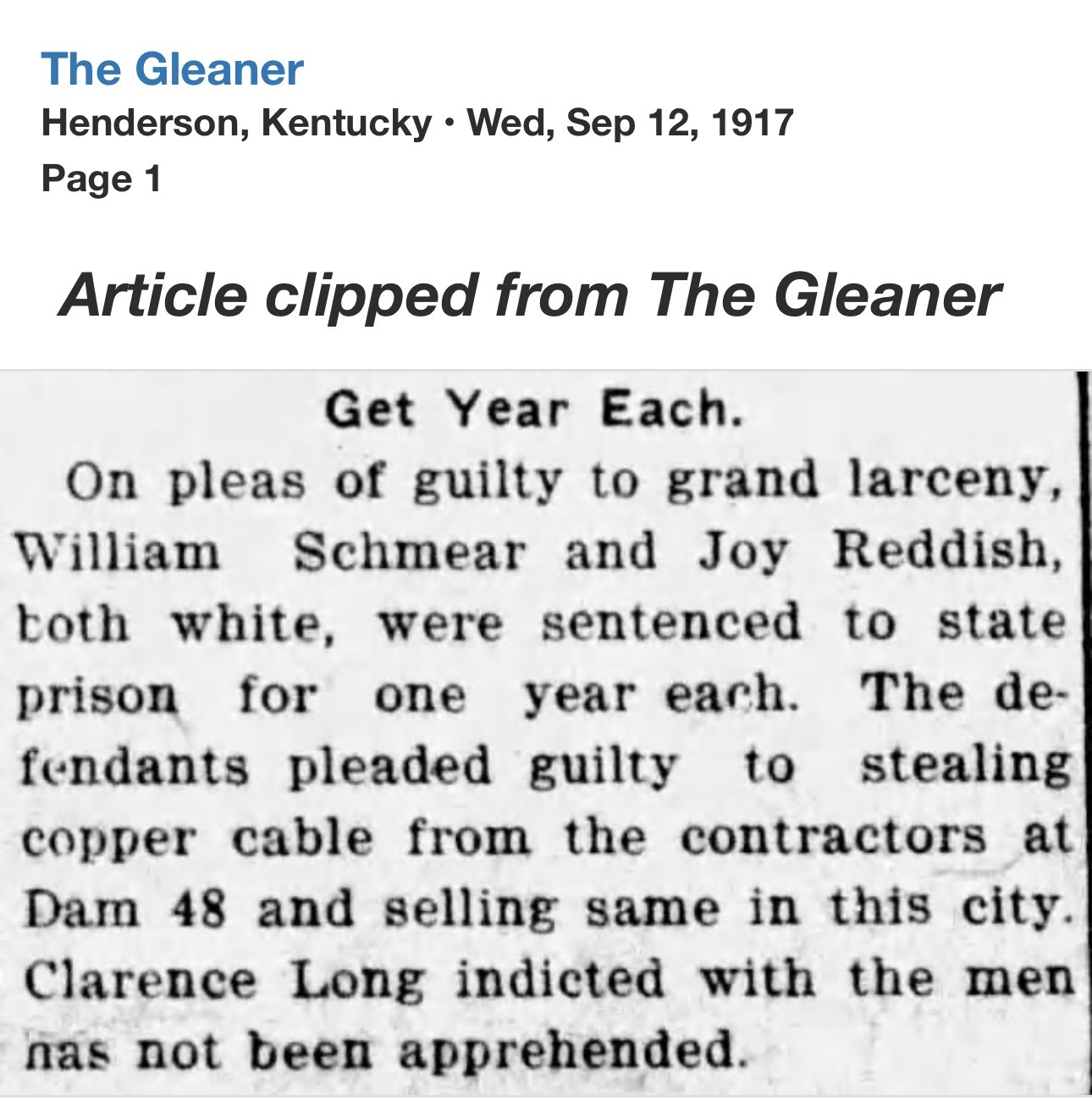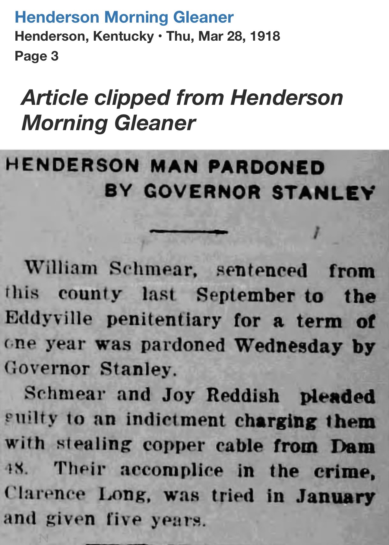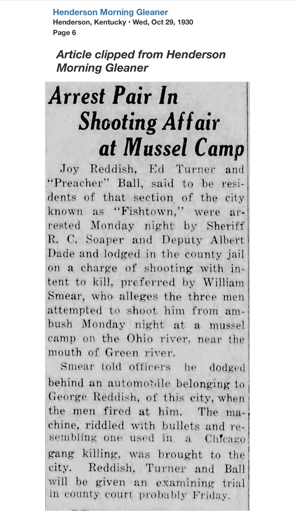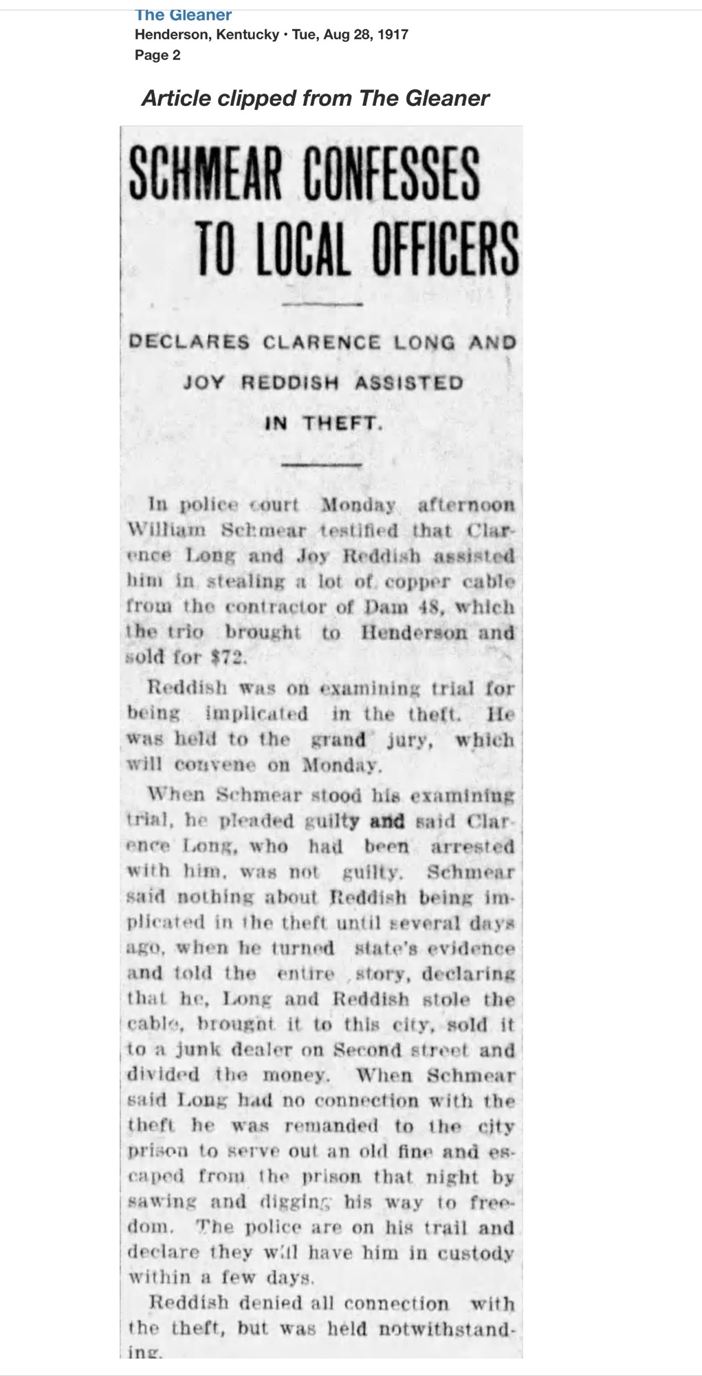 Only weeks later, Reddish’s name returned to the headlines, this time from Webster County. At the Providence home of Thurman Jones, a 45-year-old coal miner, a shot was fired. Jones fell dead. Reddish surrendered to Henderson Sheriff R.C. Soaper and was transported to Dixon.
