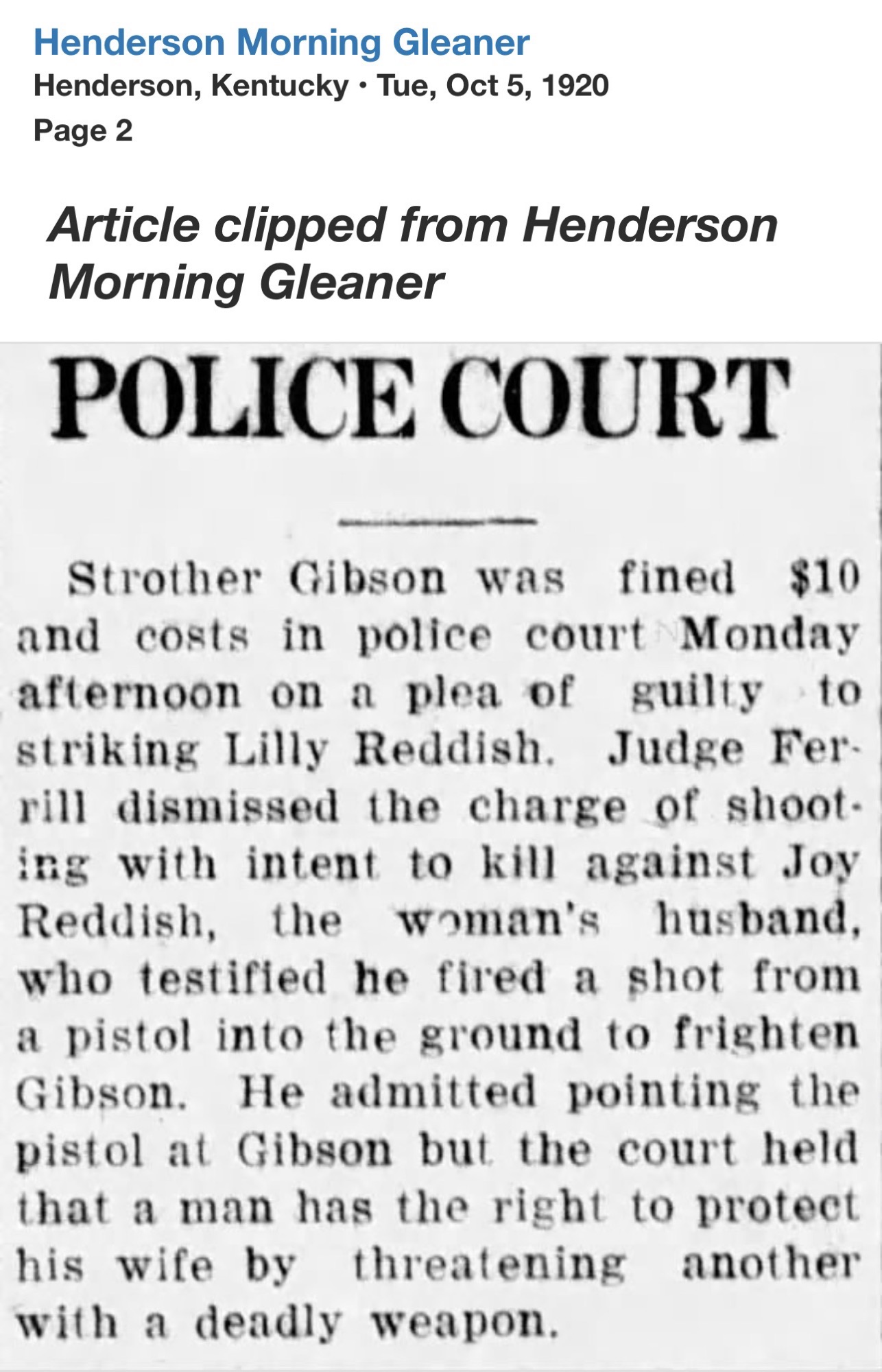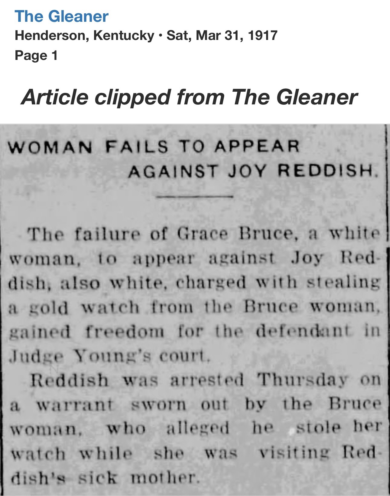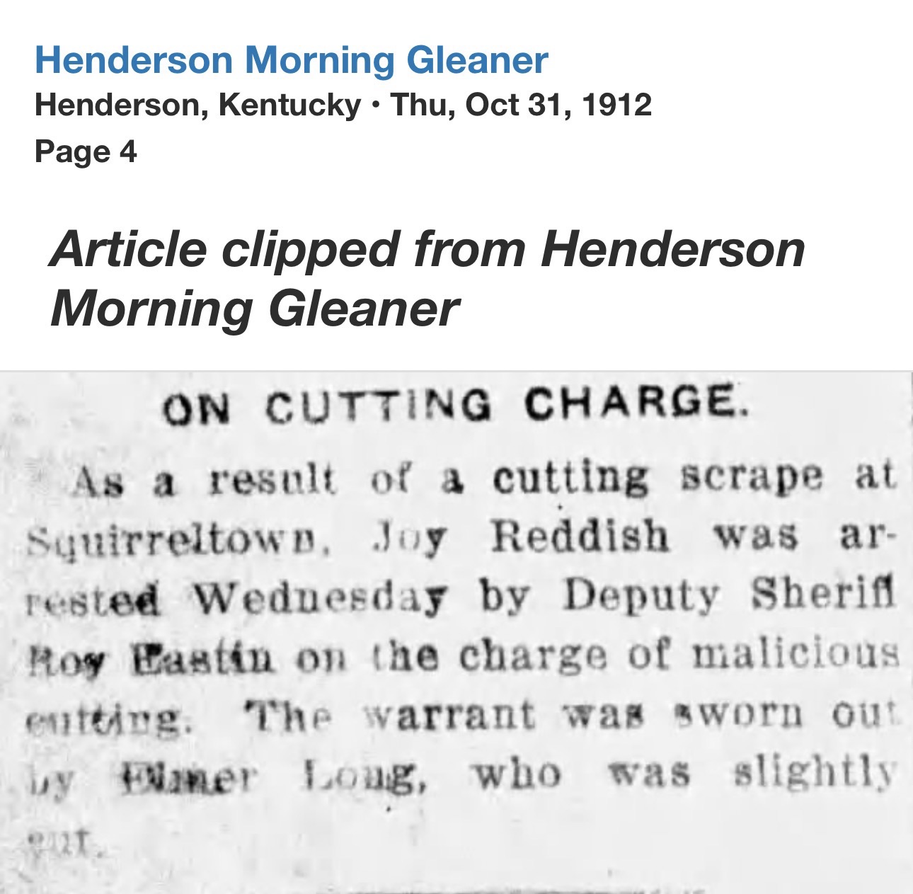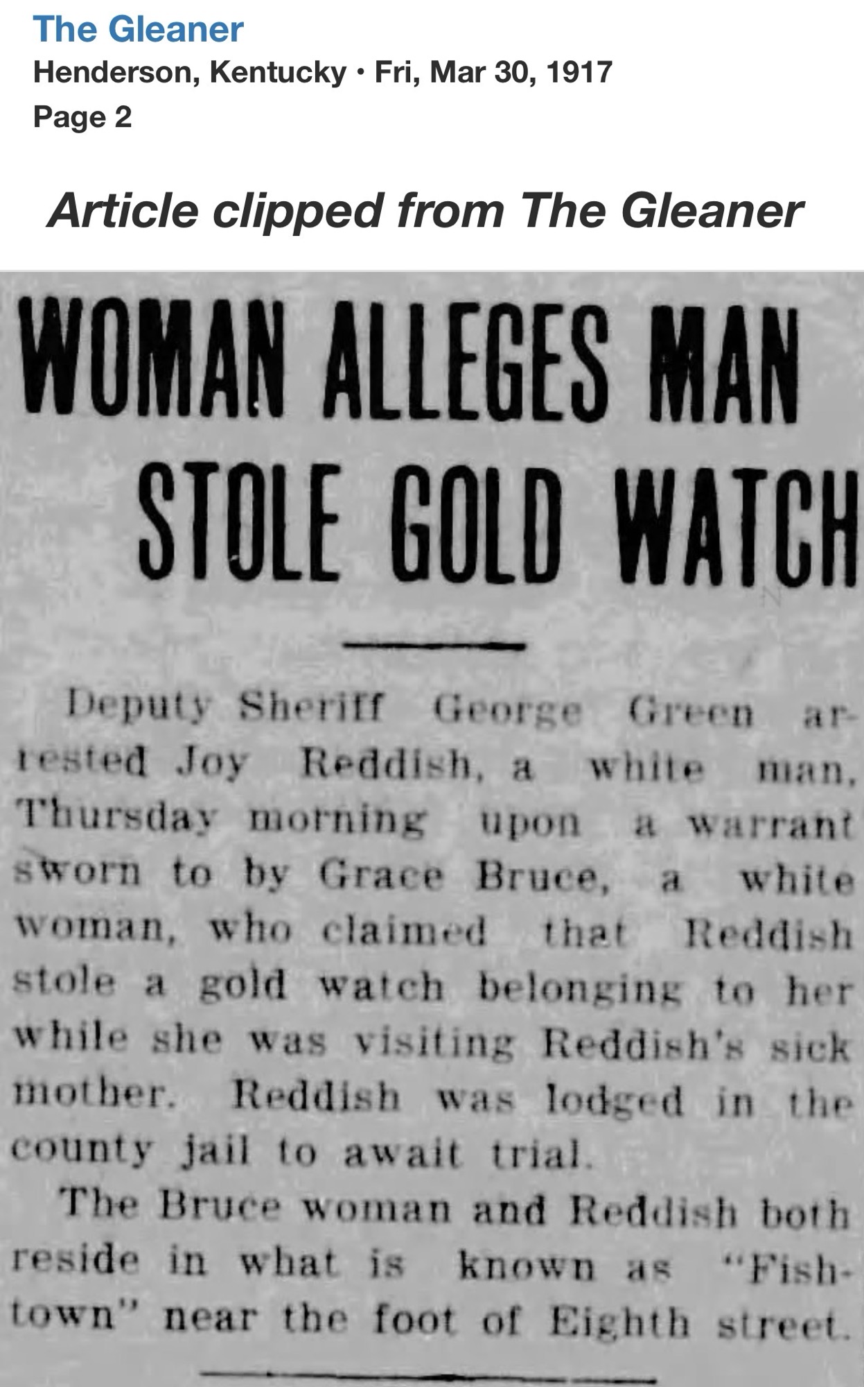 Only weeks later, Reddish’s name returned to the headlines, this time from Webster County. At the Providence home of Thurman Jones, a 45-year-old coal miner, a shot was fired. Jones fell dead. Reddish surrendered to Henderson Sheriff R.C. Soaper and was transported to Dixon.