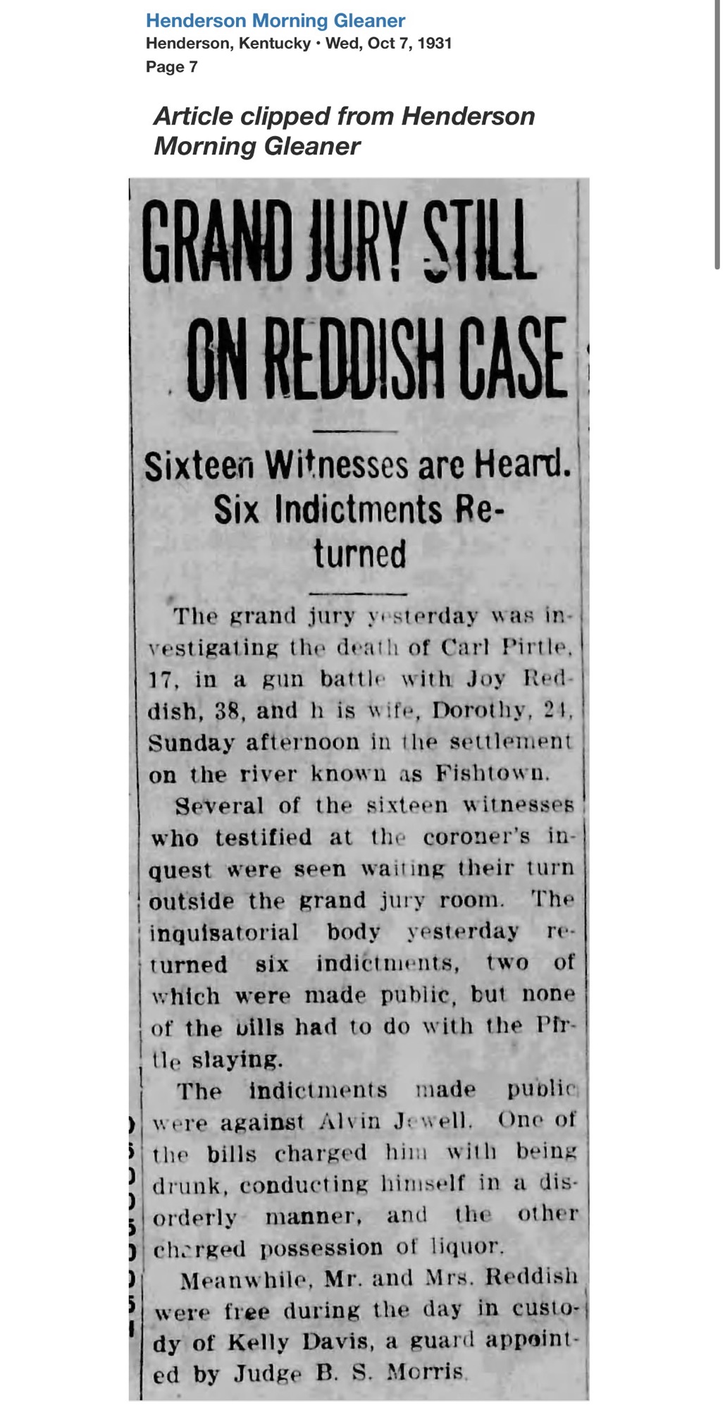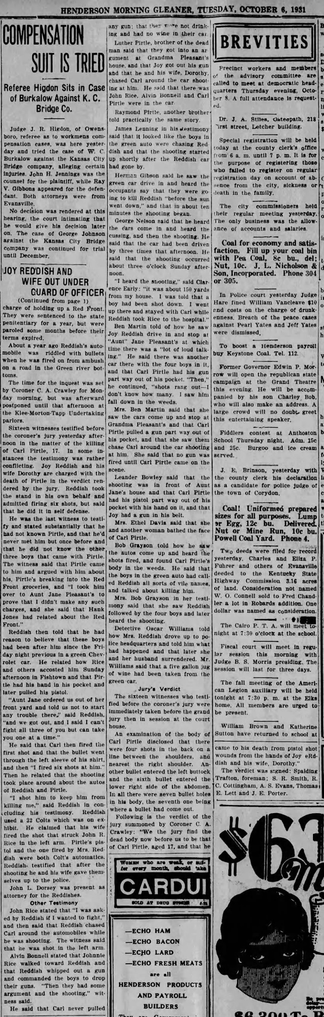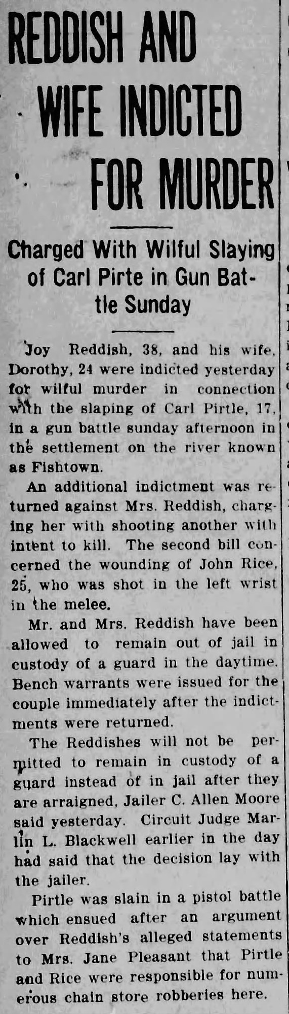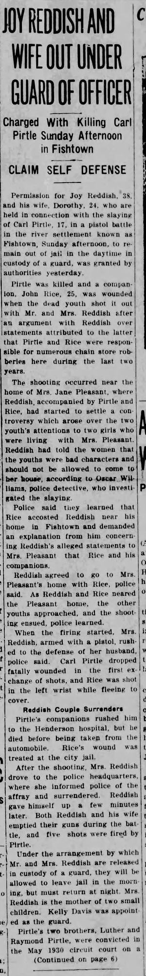 The incident that made him widely known occurred in October 1931. Seventeen-year-old Carl Pirtle was killed during a gun battle in Fishtown near Merritt Drive. John Rice was wounded. Joy Reddish and his wife, Dorothy, were indicted for willful murder.