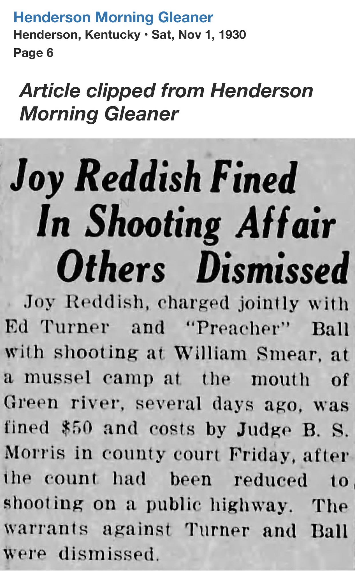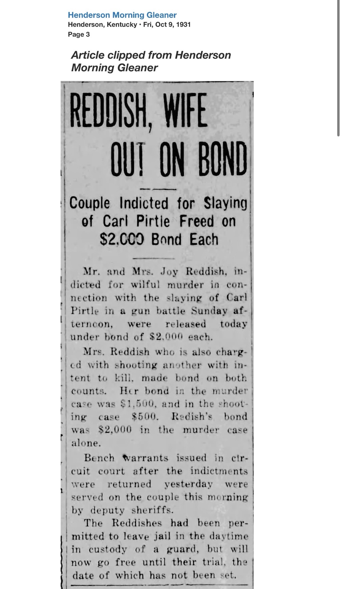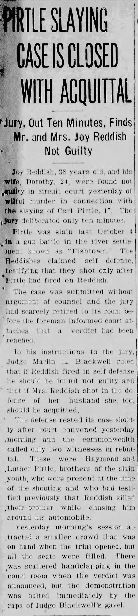 The incident that made him widely known occurred in October 1931. Seventeen-year-old Carl Pirtle was killed during a gun battle in Fishtown near Merritt Drive. John Rice was wounded. Joy Reddish and his wife, Dorothy, were indicted for willful murder.