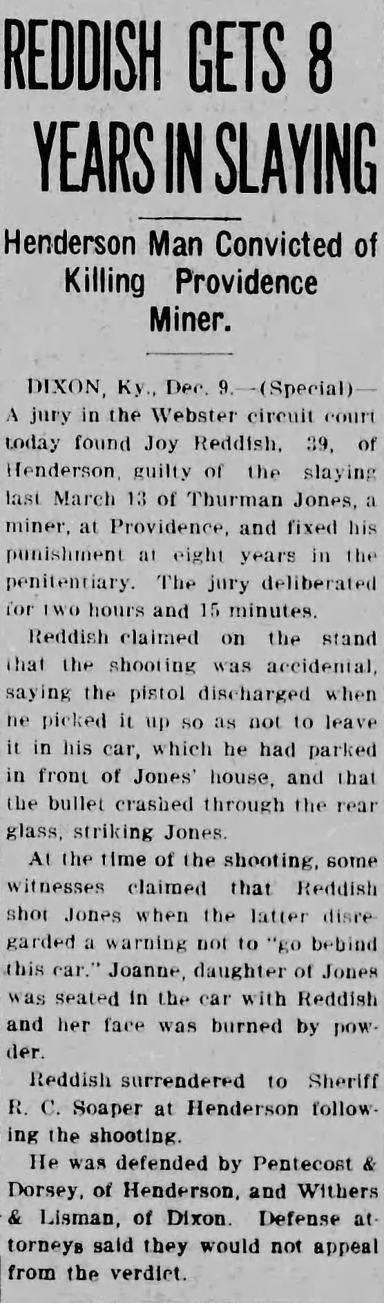 Joy Reddish, 39, was sentenced to eight years in the Kentucky State Penitentiary for the slaying of Thurman Jones. Defense attorneys announced they would not appeal. The river laborer from Fishtown was taken to Eddyville.