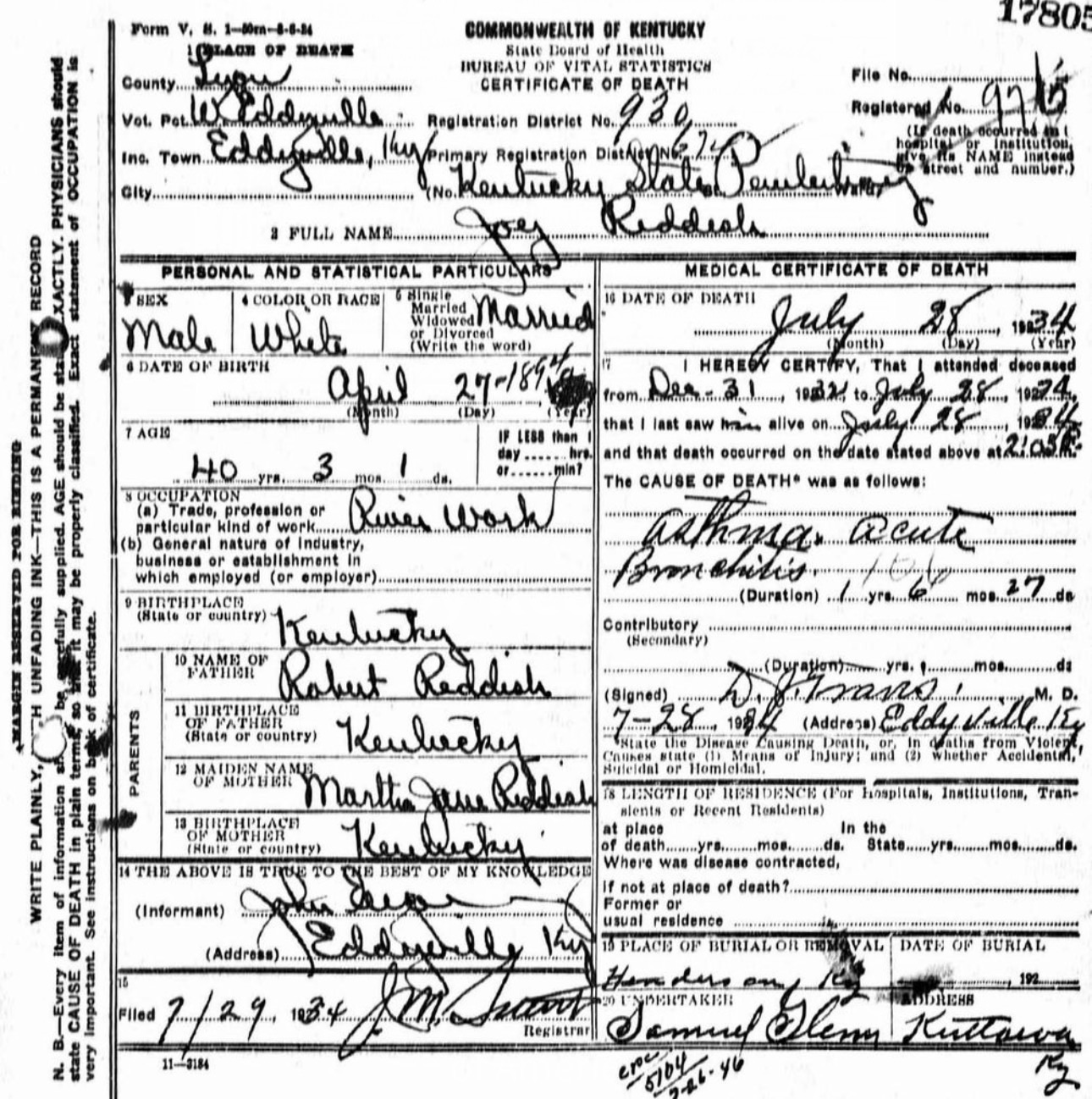 His death certificate lists the cause as acute bronchitis following illness. His occupation: river work. Age: 41 years, 3 months, 1 day.