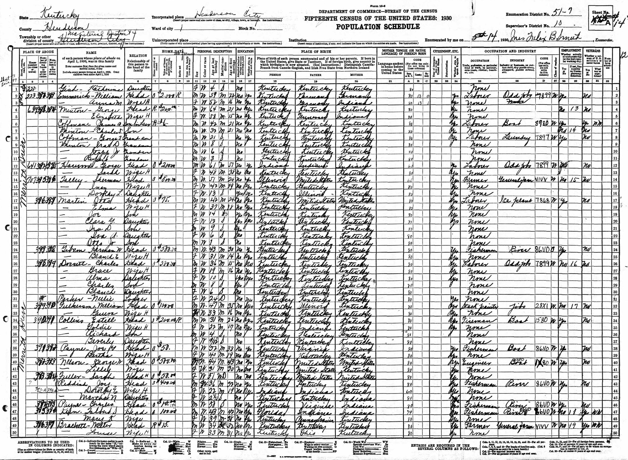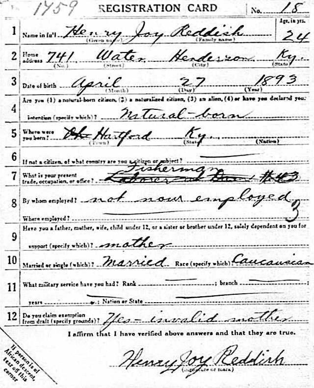 By adulthood, Joy’s life centered around Henderson’s river district. His World War I draft registration card lists him at 741 Water Street, working in fishing – Boat No. 3. That address placed him squarely in the river settlement known as Fishtown, a rough, working-class strip beneath the riverbank near Merritt Drive.