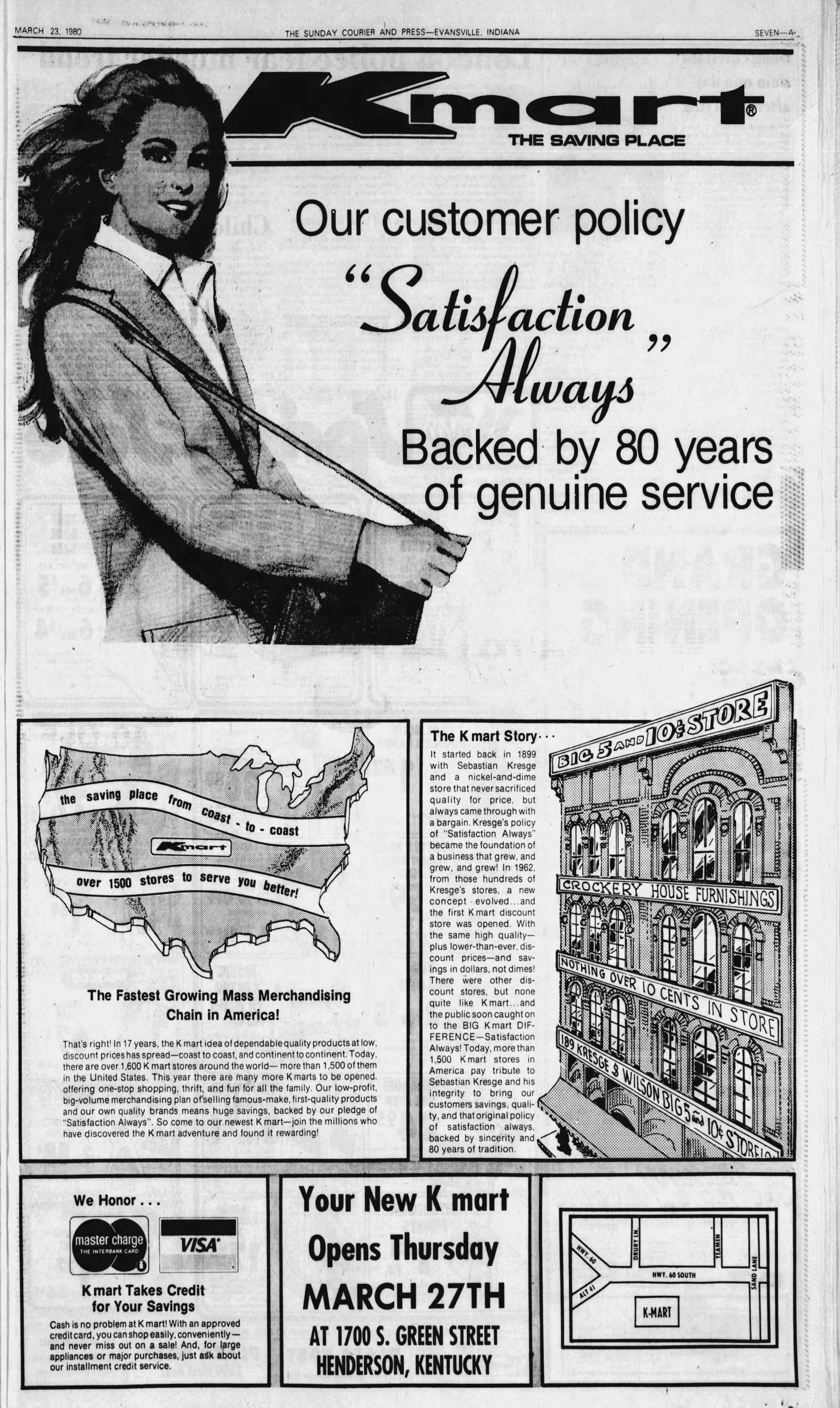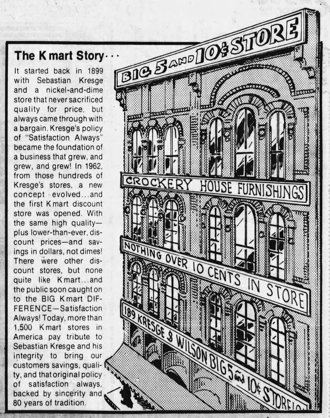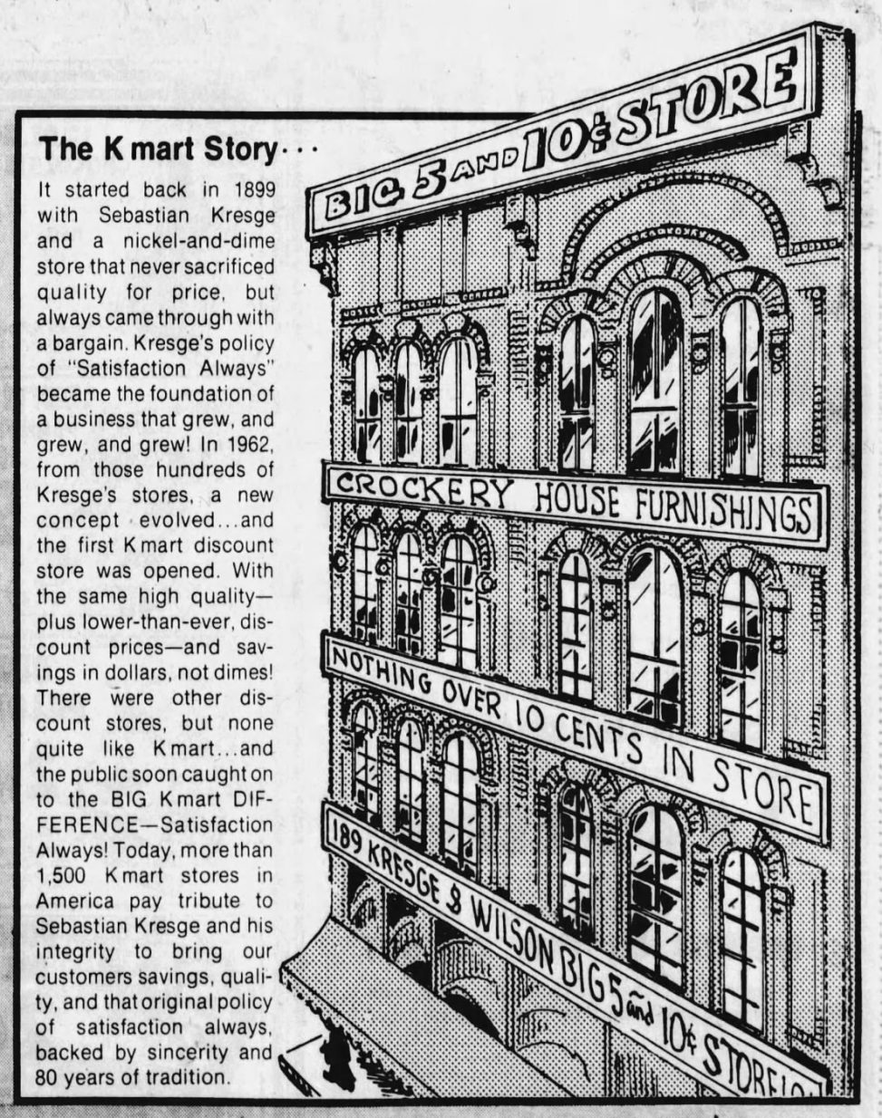 It started back in 1899 with Sebastian Kresge and a nickel-and-dime store that never sacrificed quality for price, but always came through with a bargain. Kresge’s policy of “Satisfaction Always” became the foundation of a business that grew, and grew, and grew! In 1962, from those hundreds of Kresge’s stores, a new concept evolved…and the first K mart discount store was opened. With the same high quality-plus lower-than-ever, discount prices-and savings in dollars, not dimes!