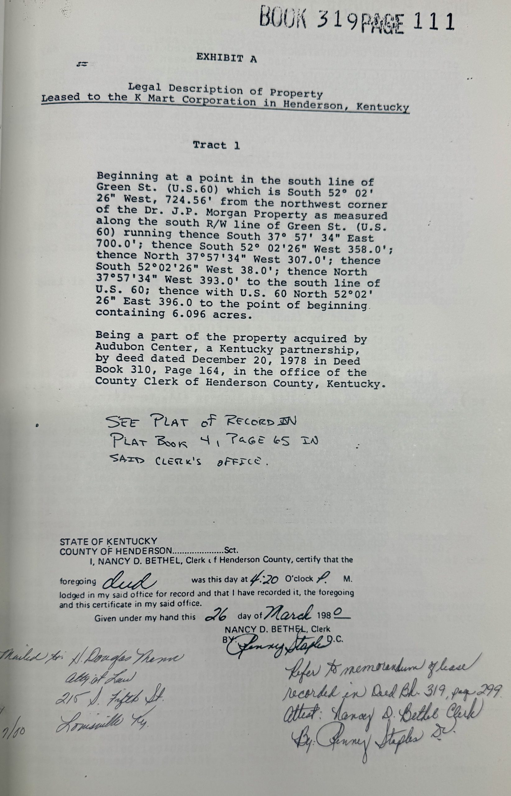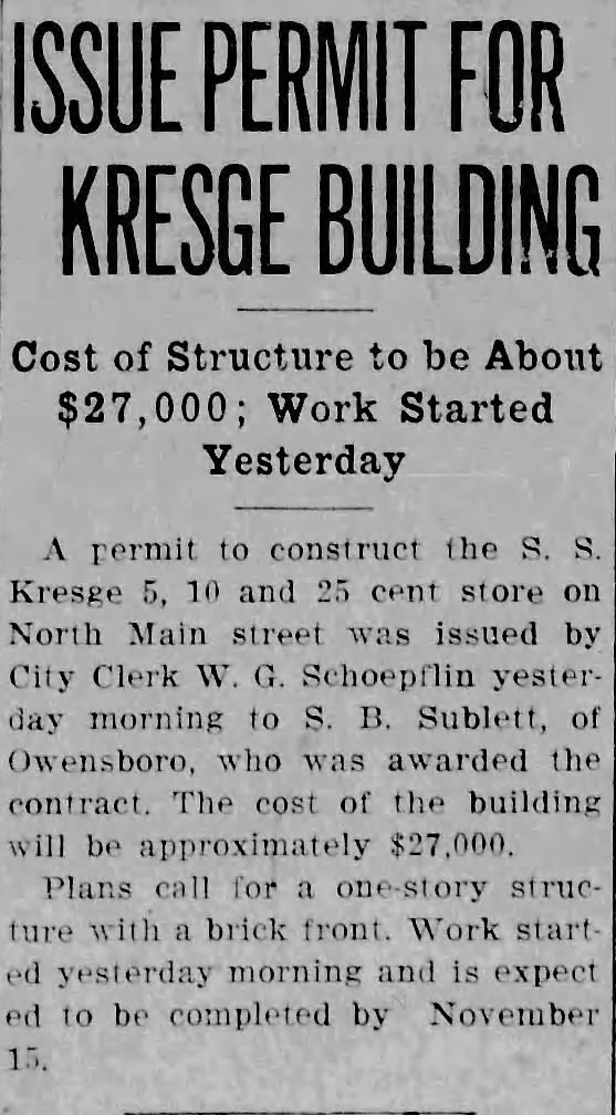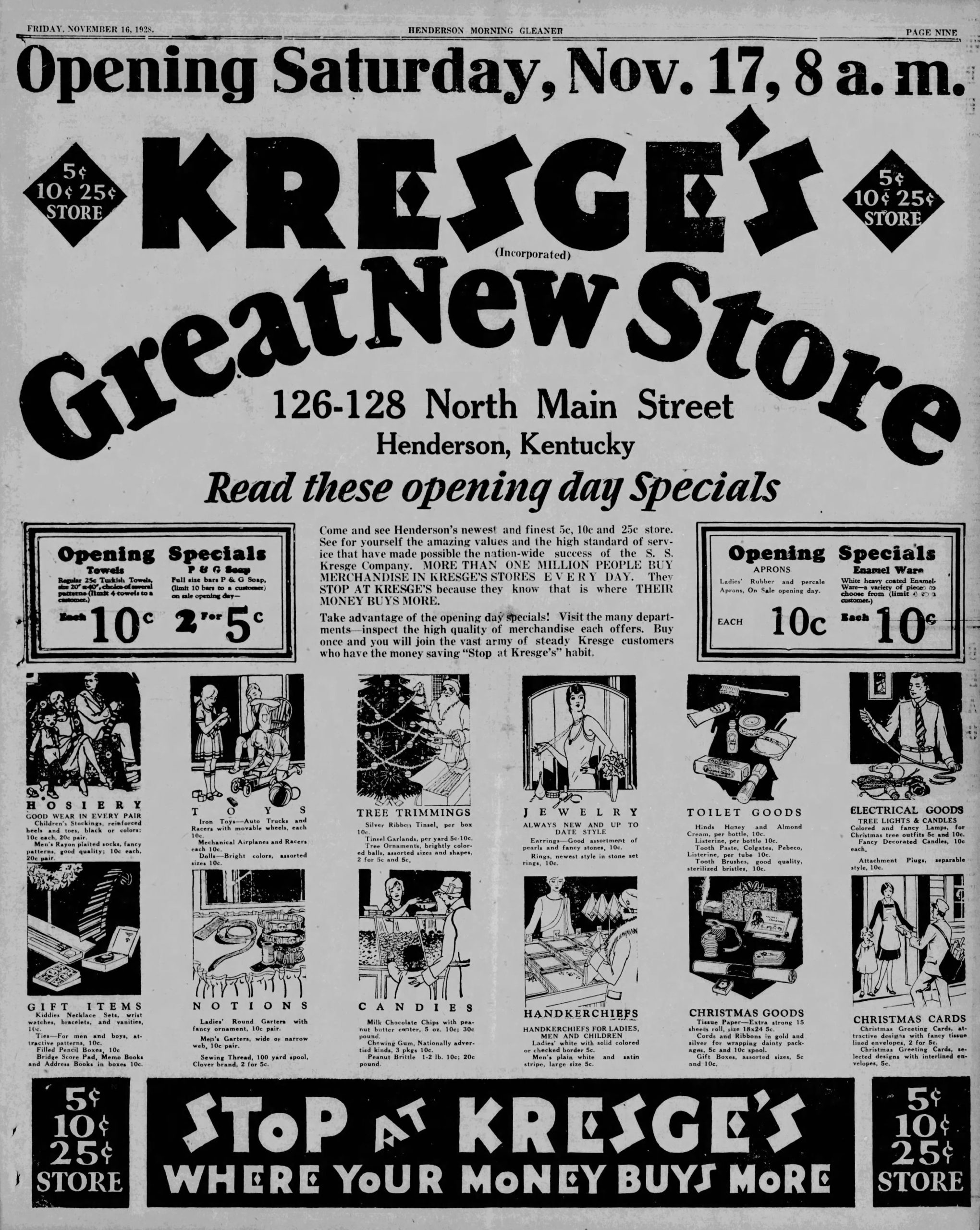 I just recently learned the story behind Kresge Drive. It’s named after Sebastian Kresge, the founder of Kmart, which opened in Henderson at 1700 S Green Street (now Rural King) on 27 March 1980. The road was put in during the construction of the store. We actually had a Kresge’s 5c, 10c and 25c store located at 126-128 N Main Street in 1928.