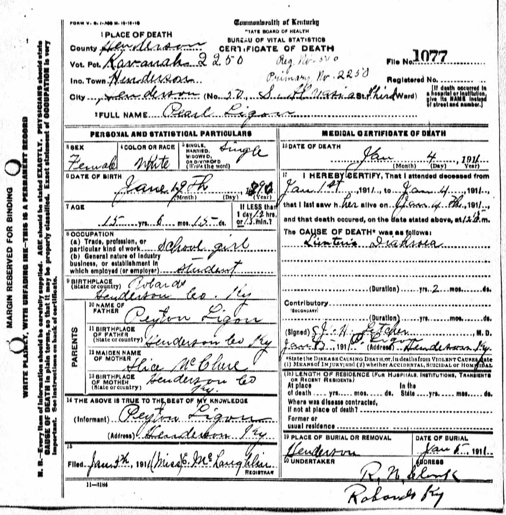 Pearl Ligon’s life, though tragically brief, left a deep impression on the Henderson community. Born in 1895, she was the daughter of Dr. Peyton Ligon and Alice McClure Ligon, a well-known family in early twentieth-century Henderson. By all contemporary accounts, Pearl was an exceptionally bright and promising young woman, admired by her classmates and teachers alike.