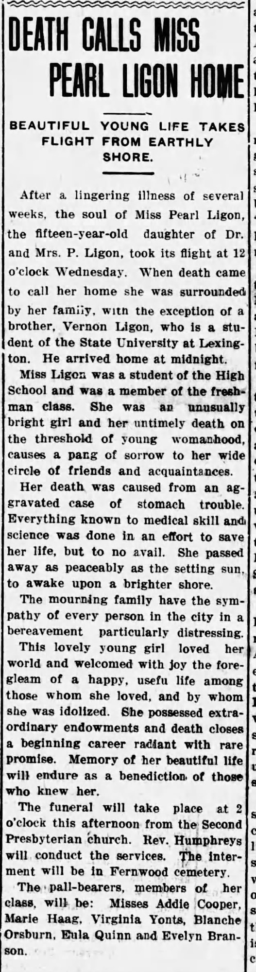 Pearl was a student at the local high school and a member of the freshman class. Her funeral, held at Second Presbyterian Church, was attended by many who came to mourn a life full of promise. Six of her classmates served as pallbearers, a poignant testament to the bonds she formed in her short time. She was laid to rest in Fernwood Cemetery, where she remains among other members of the Ligon family.