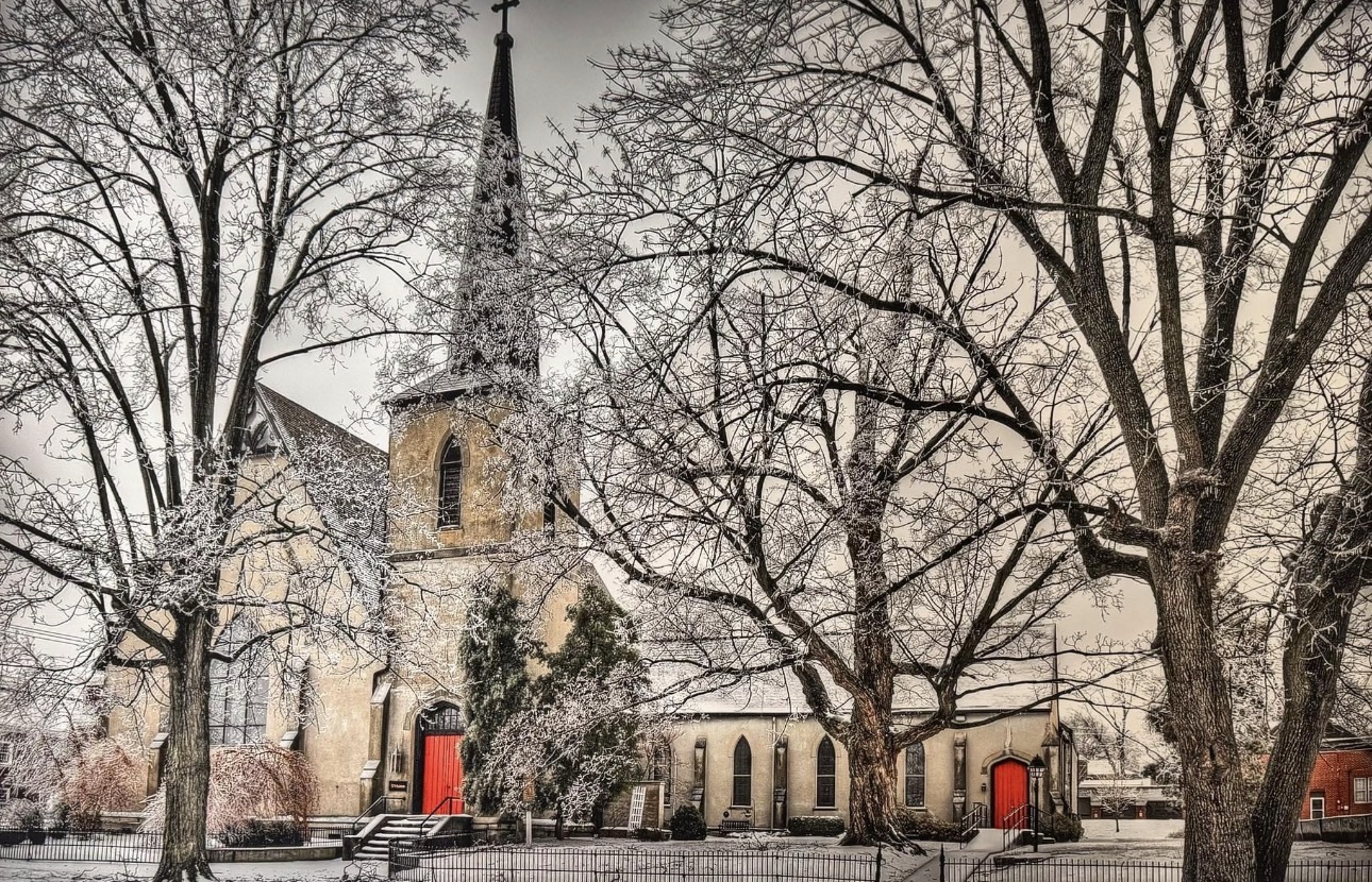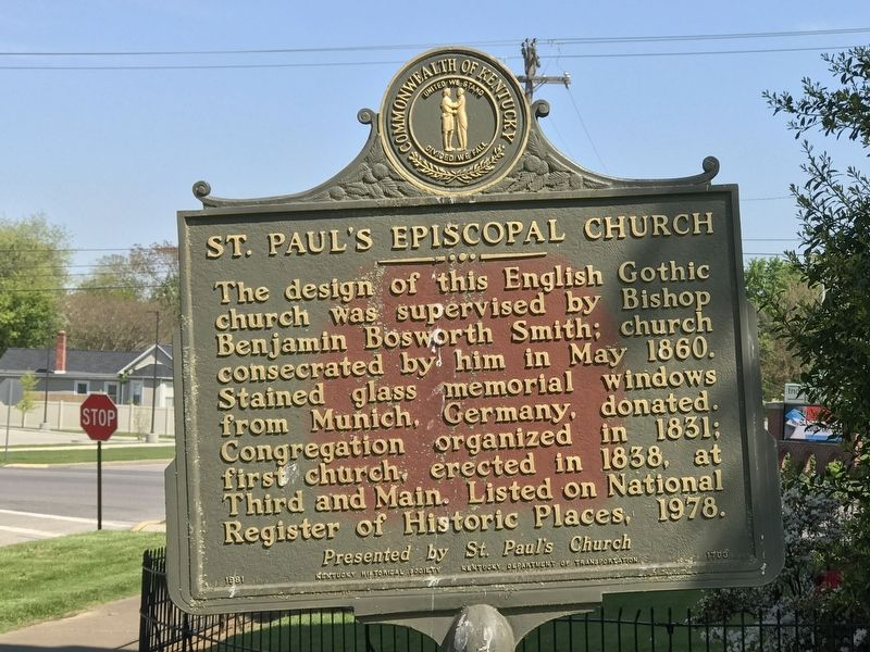 The parish was formally organized in 1831, with early Episcopal services held in public spaces before the congregation completed its first church building in 1838 at Third and Main Streets. Continued growth led to the construction of the present church at the southwest corner of Green and Center Streets, where the new building was erected in 1859-1860 and consecrated on May 31, 1860, by Bishop Benjamin Bosworth Smith, the first Bishop of the Diocese of Kentucky.