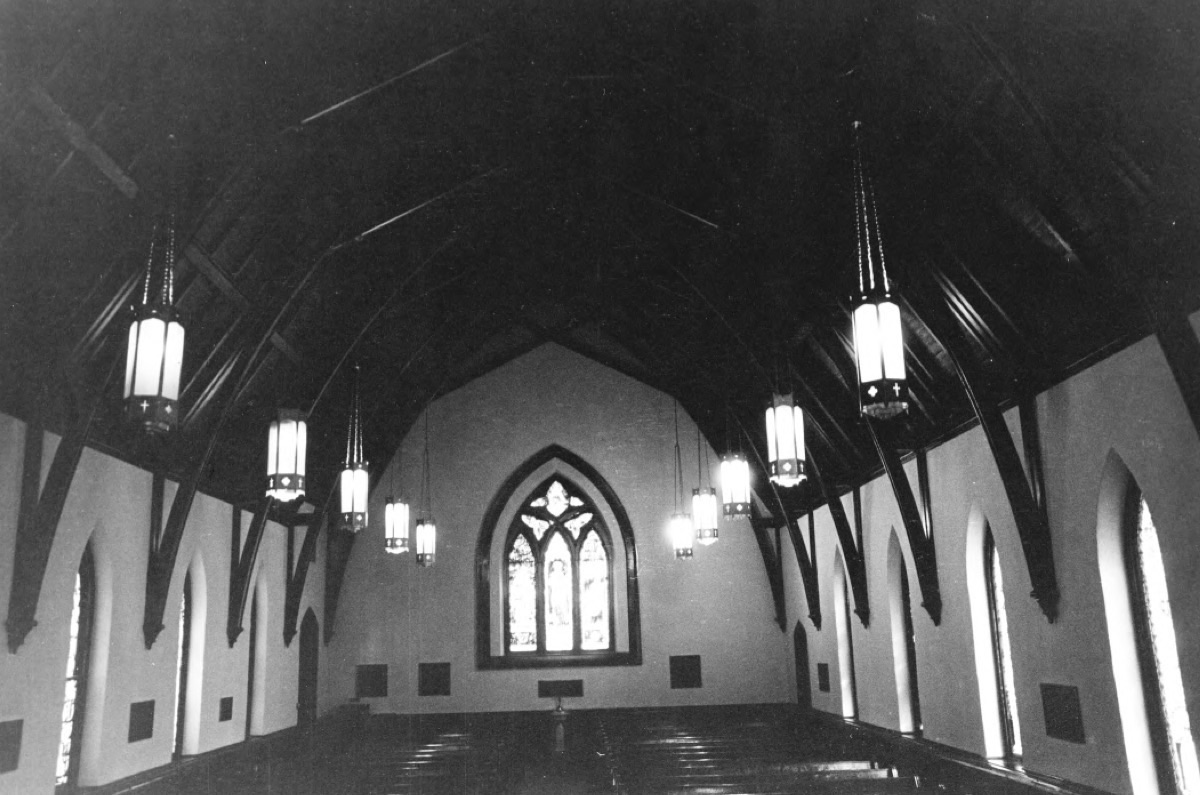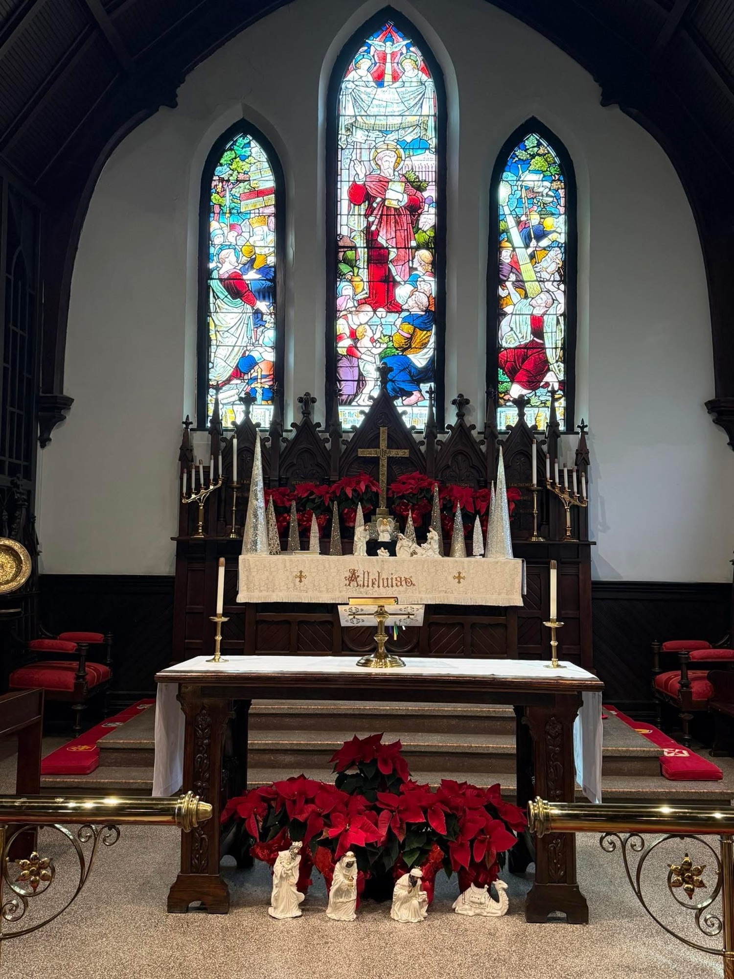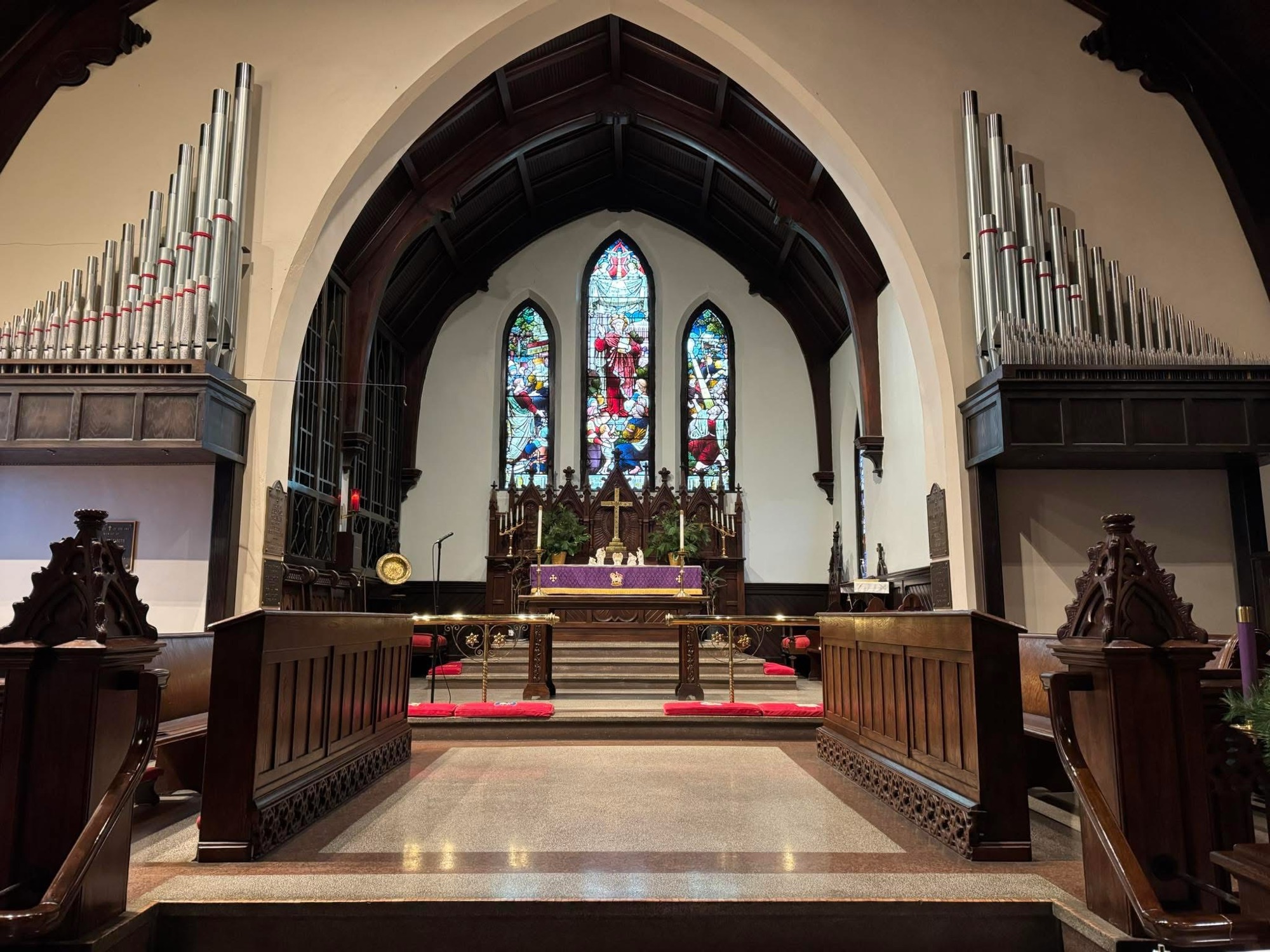 The interior retains much of its historic character, including original pews, dark walnut ceiling beams, and a prominent pointed arch framing the chancel. Above the altar is a striking three-part stained-glass window depicting scenes from the life of St. Paul, believed to have been imported from Holland, while other stained glass appears to be of domestic origin.