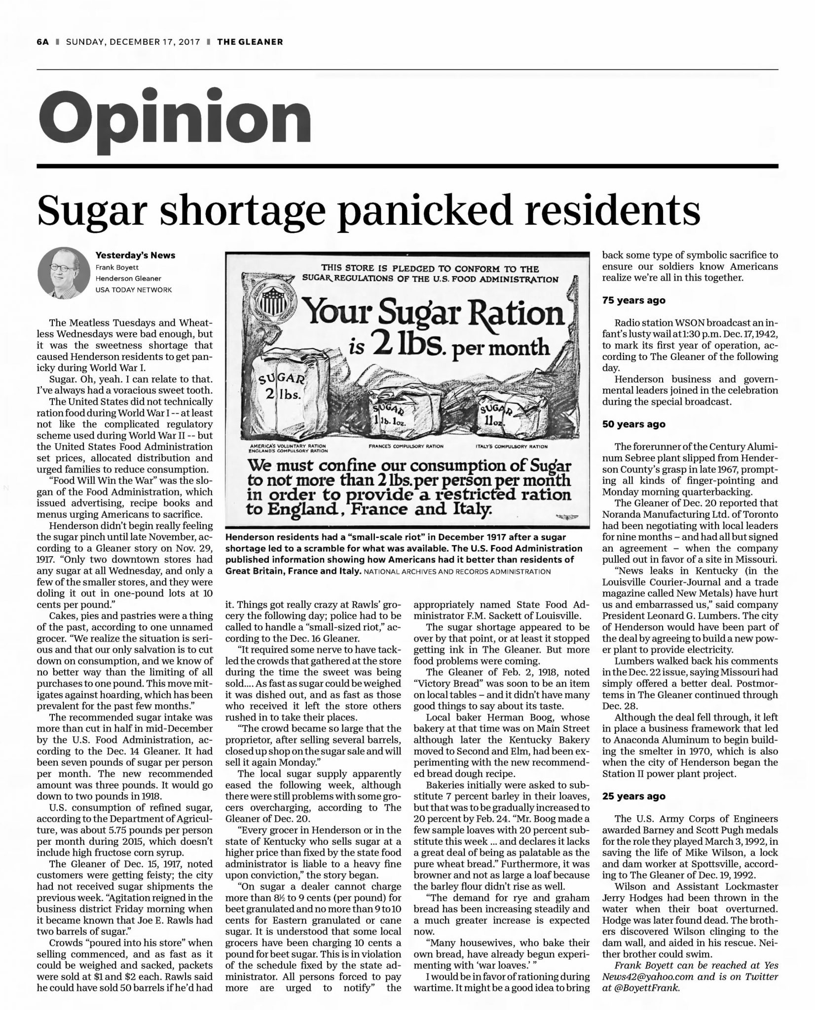 Henderson didn’t begin really feeling the sugar pinch until late November, according to a Gleaner story on Nov. 29, 1917. “Only two downtown stores had any sugar at all Wednesday, and only a few of the smaller stores, and they were doling it out in one-pound lots at 10 cents per pound.”