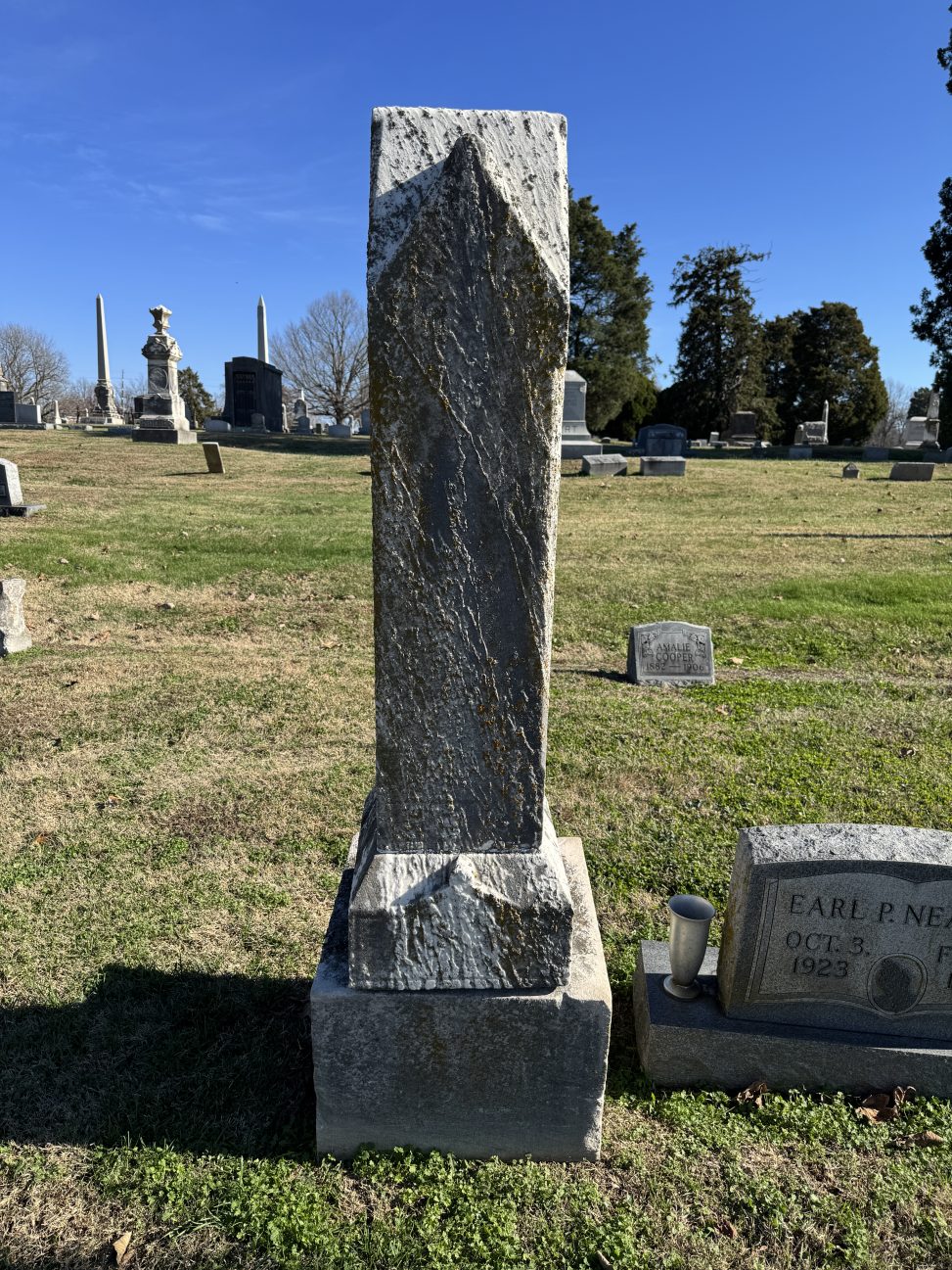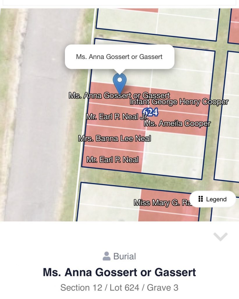 In Section 12, Lot 624 of Fernwood Cemetery stands a an aging, time-worn monument whose inscription has long since faded from the stone. Cemetery records list the grave simply as “Ms. Anna Gossert or Gassert”, Grave 3, beside Cooper and Neal family burials and a small concrete lot marker numbered 624.