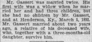 Later Montana obituaries for Harry Gassert add that he had first married Mrs. Annie Sweitzer at Butte in the autumn of 1884 and that she died at Henderson, Kentucky, on 5 March 1892. Harry himself died in 1896 and is buried far from Henderson, in Mountain View Cemetery at Livingston, Montana.