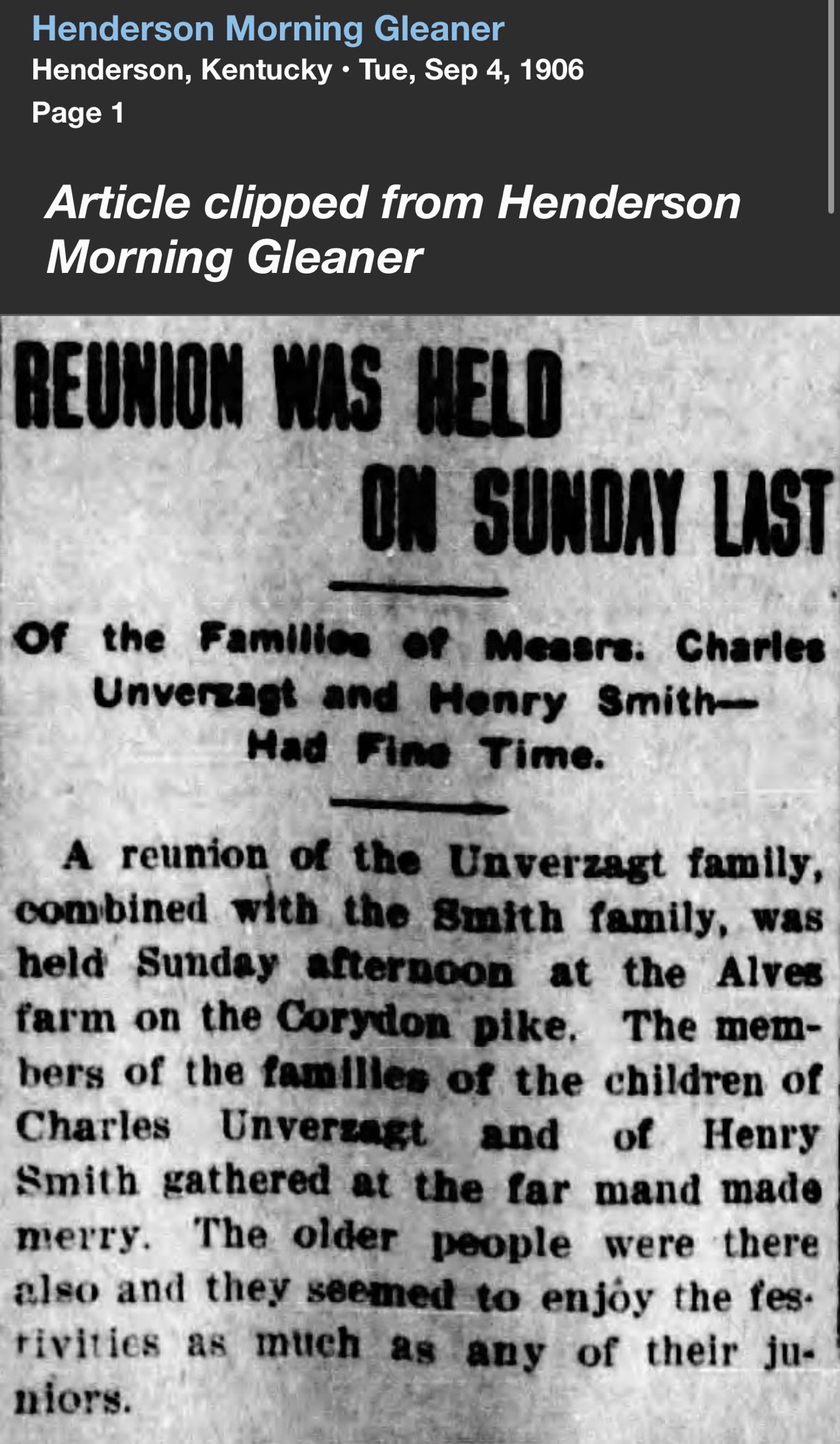 By the time a combined reunion of the Unverzagt and Smith families was held in 1906 at the Alves farm on the Corydon Pike, the two households were already permanently joined. The Henderson Morning Gleaner described older and younger generations gathered together for a day of merriment – not just neighbors, but one extended family.