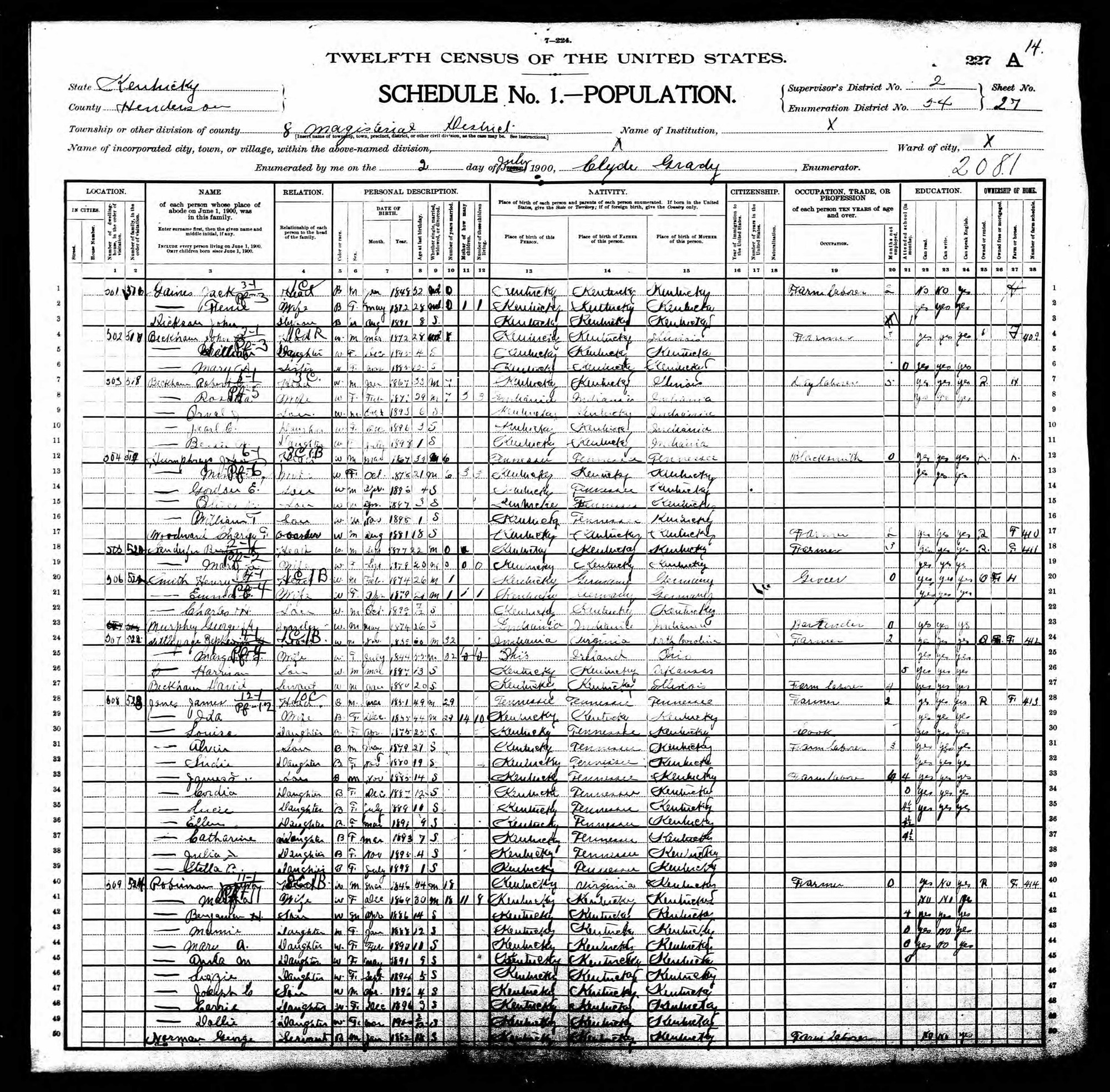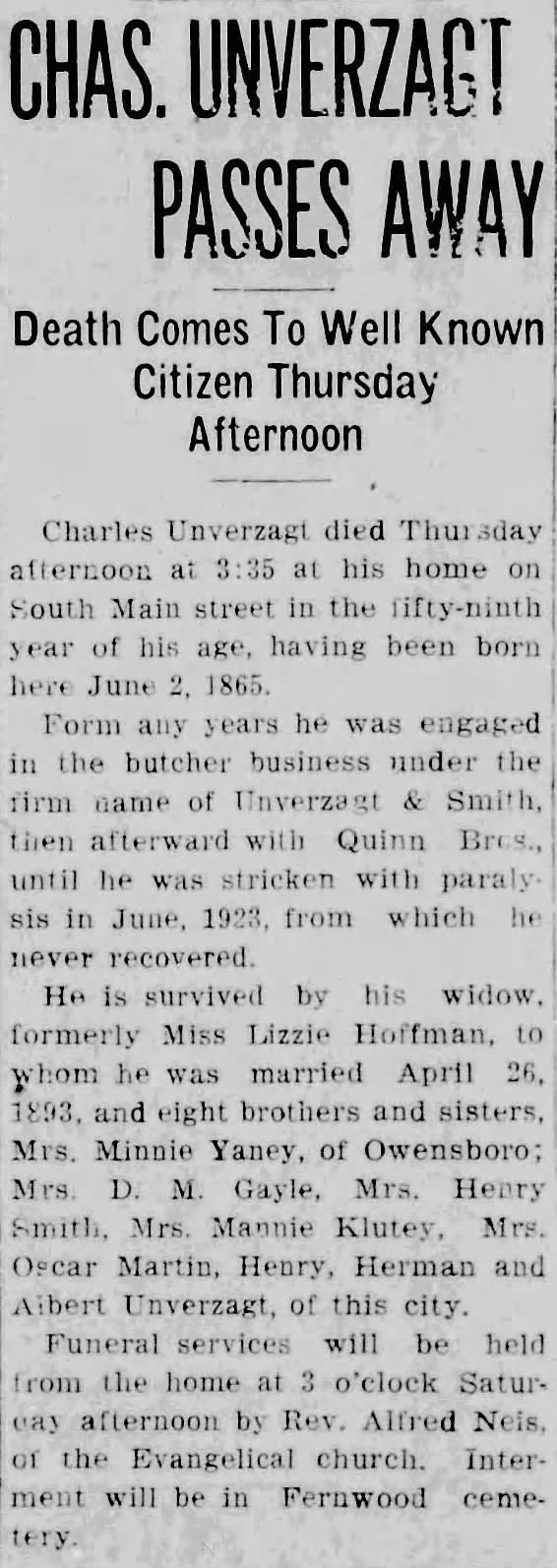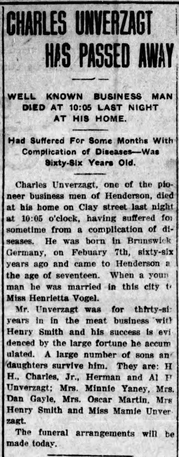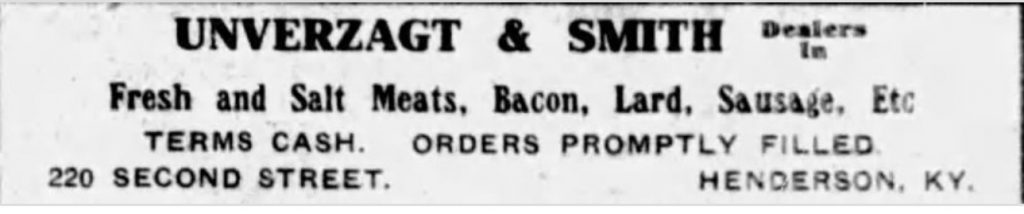 Charles Unverzagt, born in Brunswick, Germany, came to Henderson as a young man and spent thirty-six years in the meat business with Henry Smith. He died in May 1907 at his home on Clay Street and was remembered as one of Henderson’s pioneer business men.