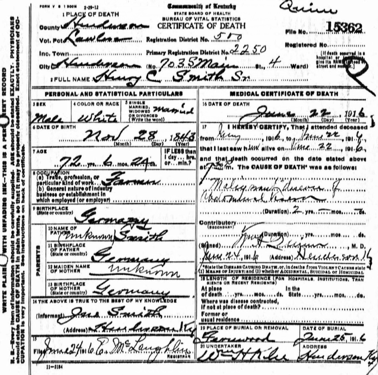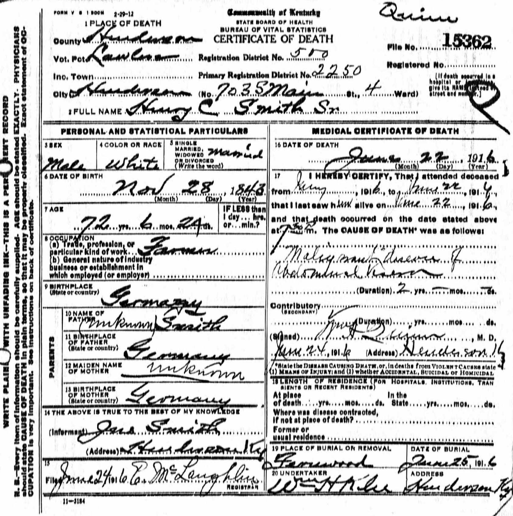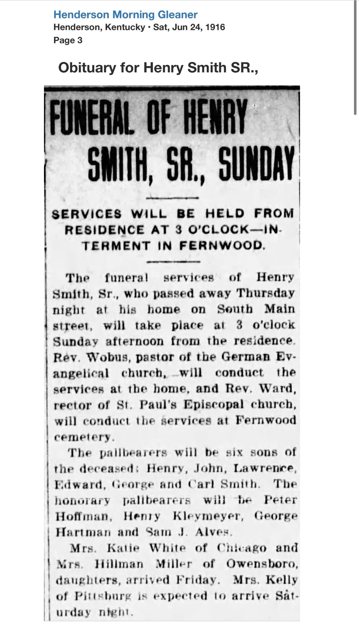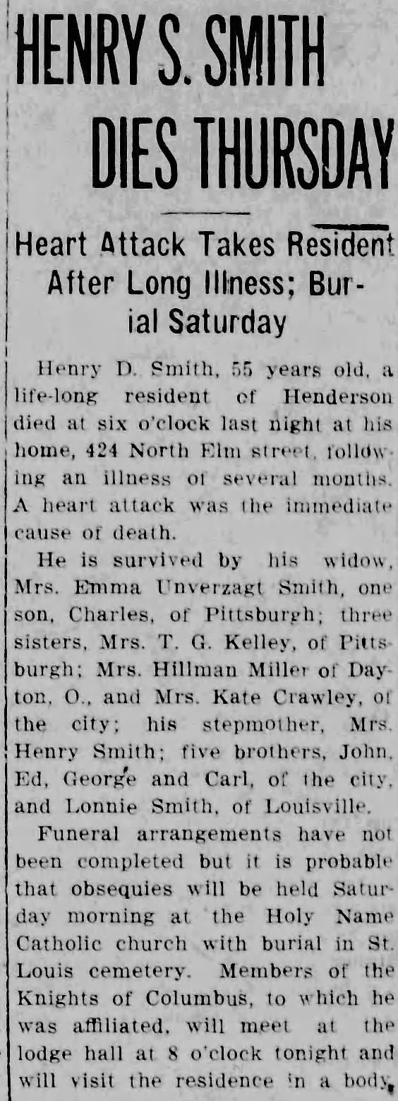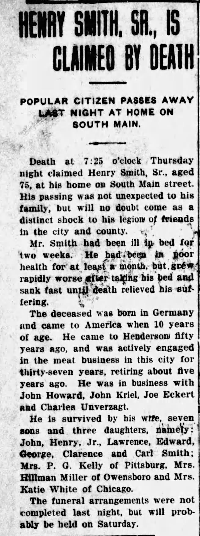 Henry C. Smith, Sr., born in Germany in 1841, died June 22, 1916, at his home on South Main Street after nearly four decades in the meat trade. The Gleaner described him as a popular citizen whose passing would be widely felt.