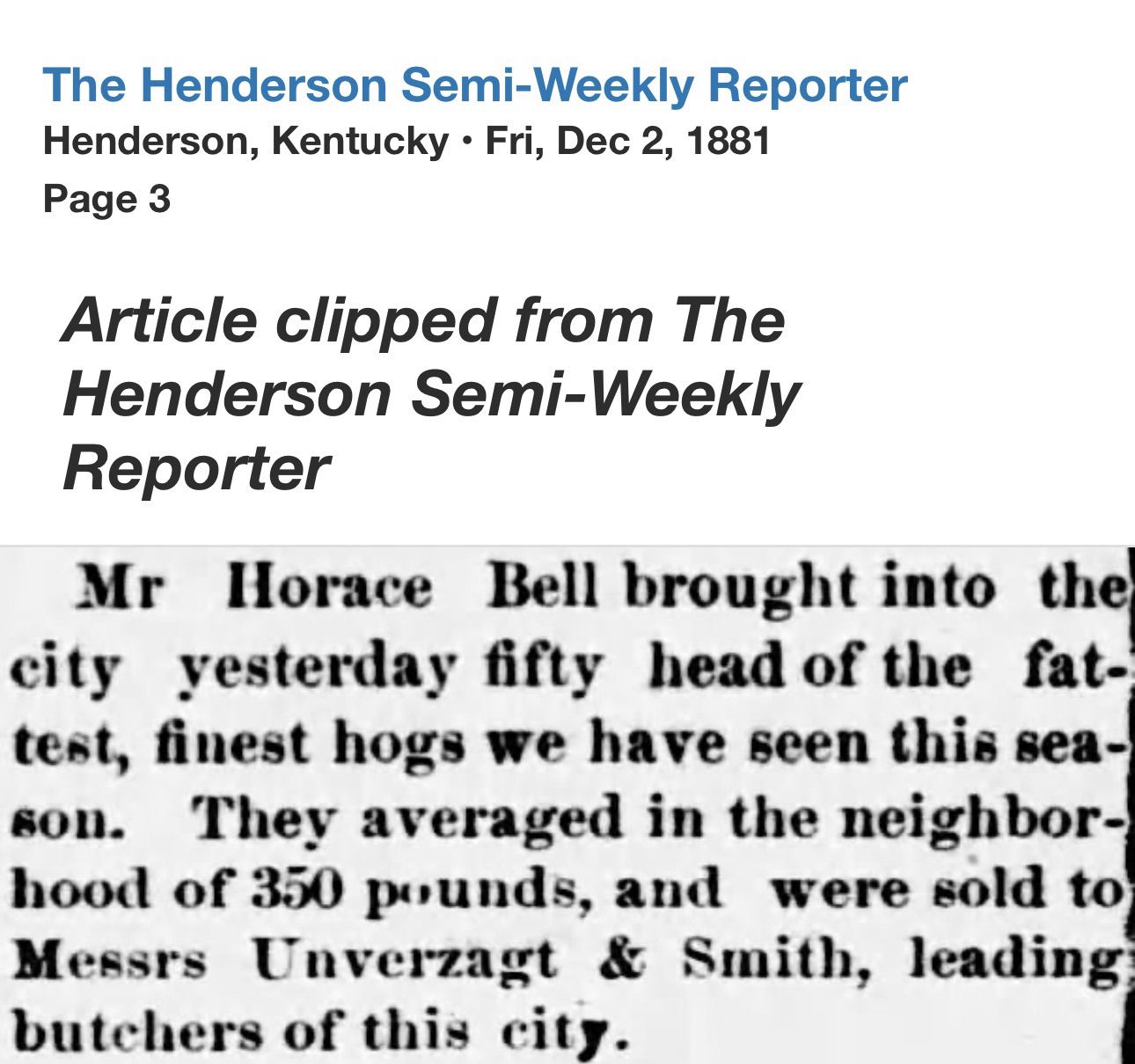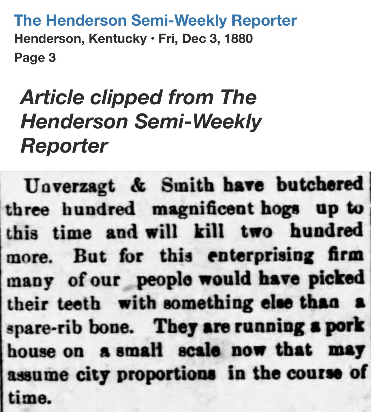 By 1880, the firm of Unverzagt & Smith was already being mentioned in the Henderson Semi-Weekly Reporter as leading butchers of the city. That December, the paper noted they had butchered three hundred “magnificent hogs” and would kill two hundred more. In another report, fifty head of fine hogs averaging 350 pounds were sold to the firm. These were not small operators – they were provisioning a growing river town.