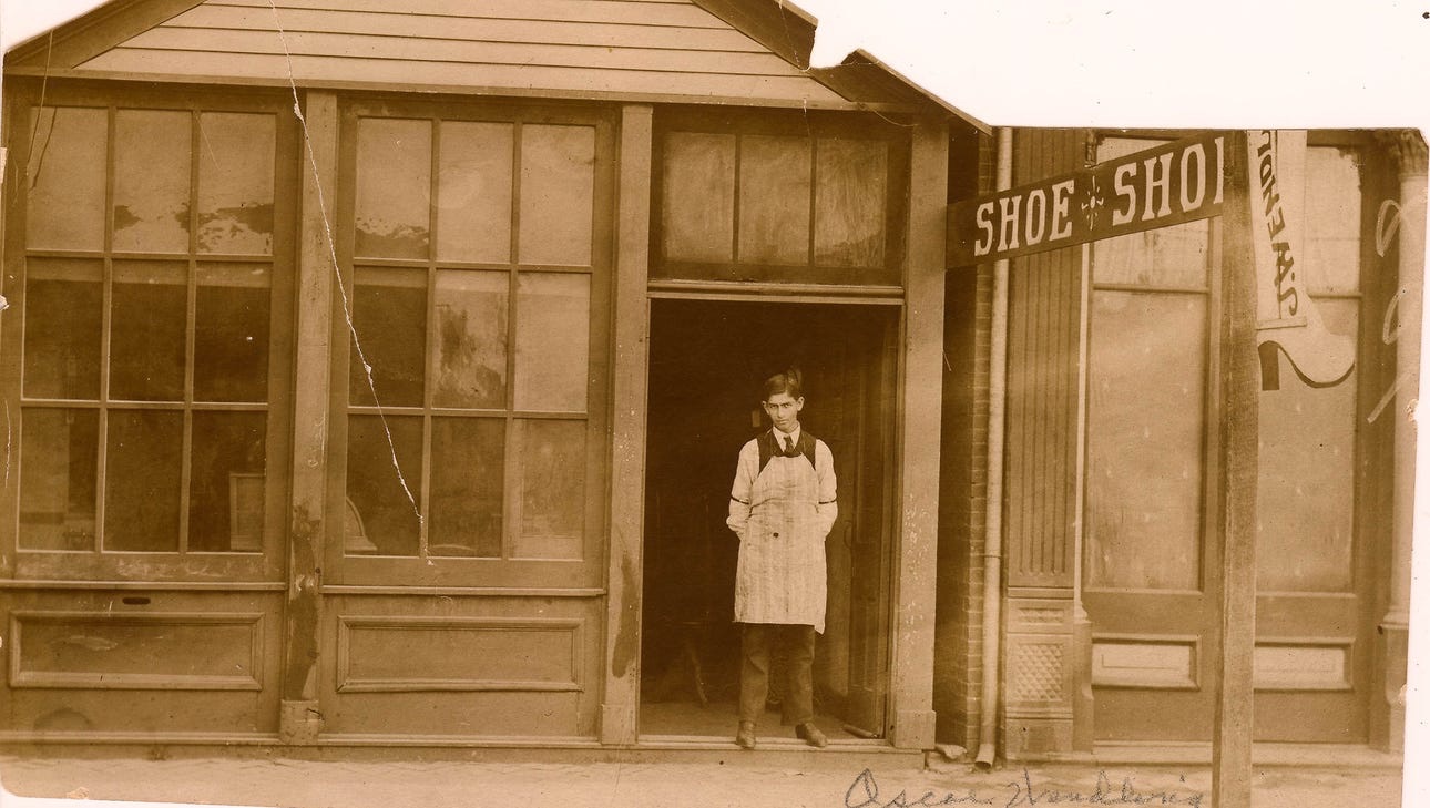 This photograph captures Oscar Wendling at his father’s business, J. Wendling Shoe Shop, located in the 300 block of First Street. The modest storefront, with its simple wooden façade and hand-painted “Shoe Shop” sign, reflects a time when small, family-run trades lined downtown Henderson’s streets.