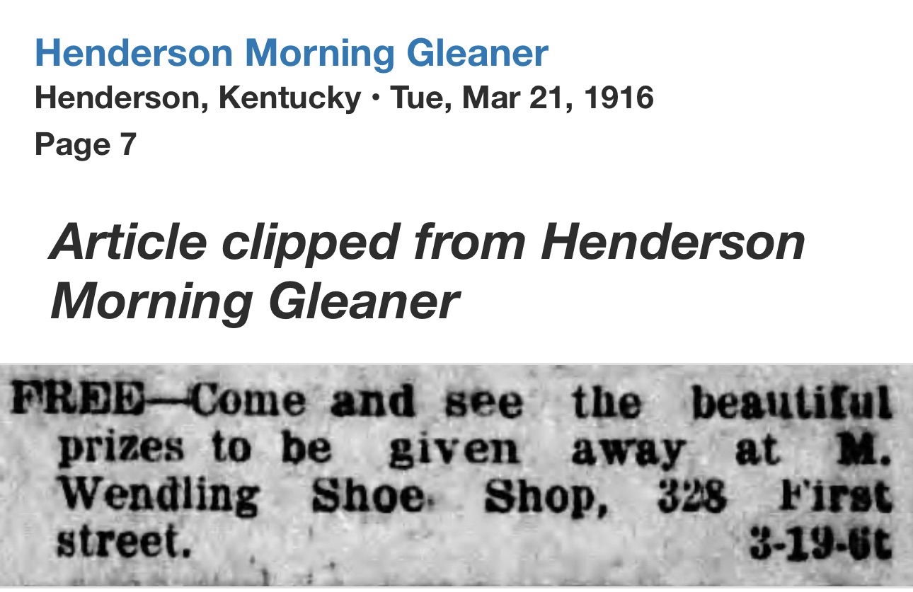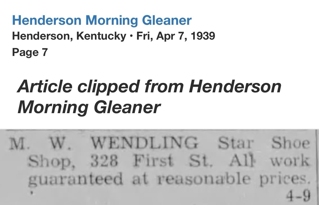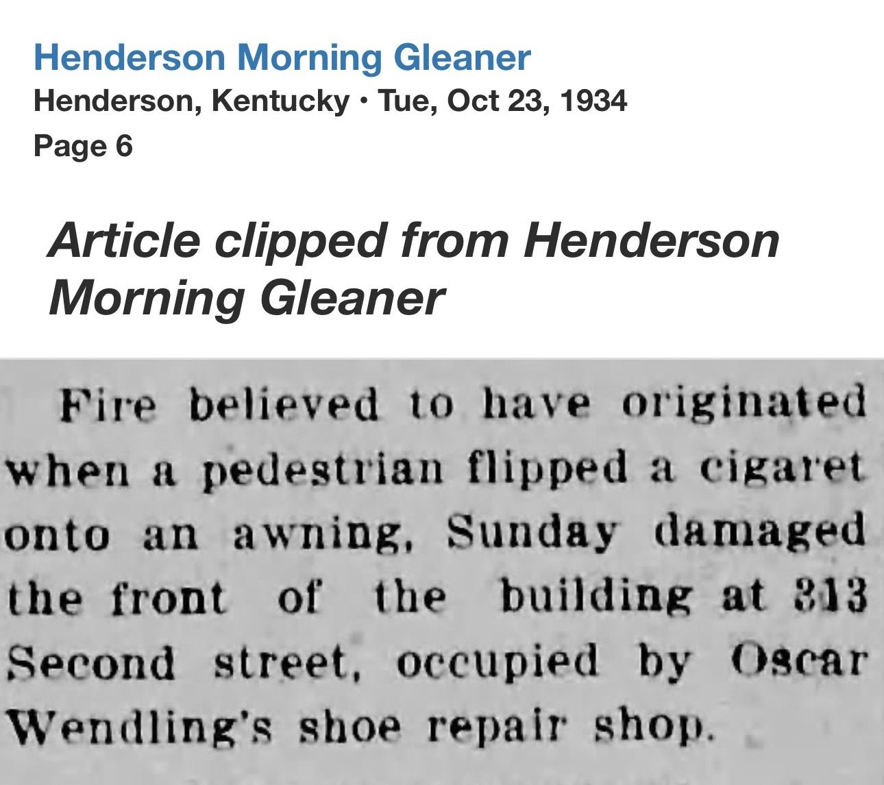 The shop’s story was not without hardship. A 1934 article in the Henderson Morning Gleaner notes a fire that damaged the front of the building at 313 Second Street, then occupied by Oscar Wendling’s shoe repair shop, reportedly caused by a discarded cigarette igniting an awning. Even so, like many small businesses of the time, the Wendlings endured.